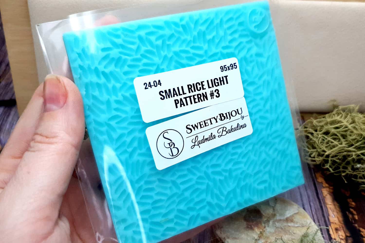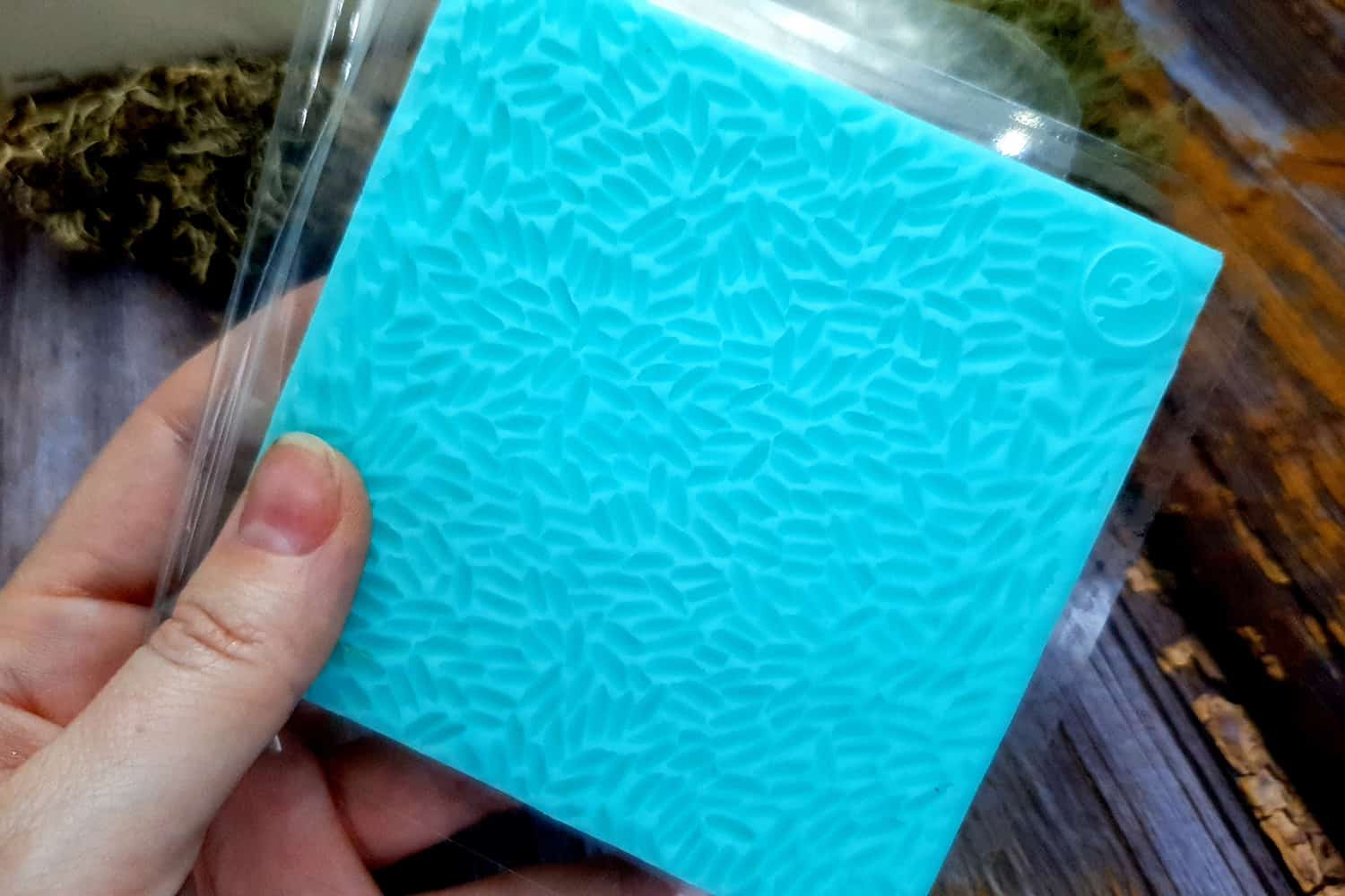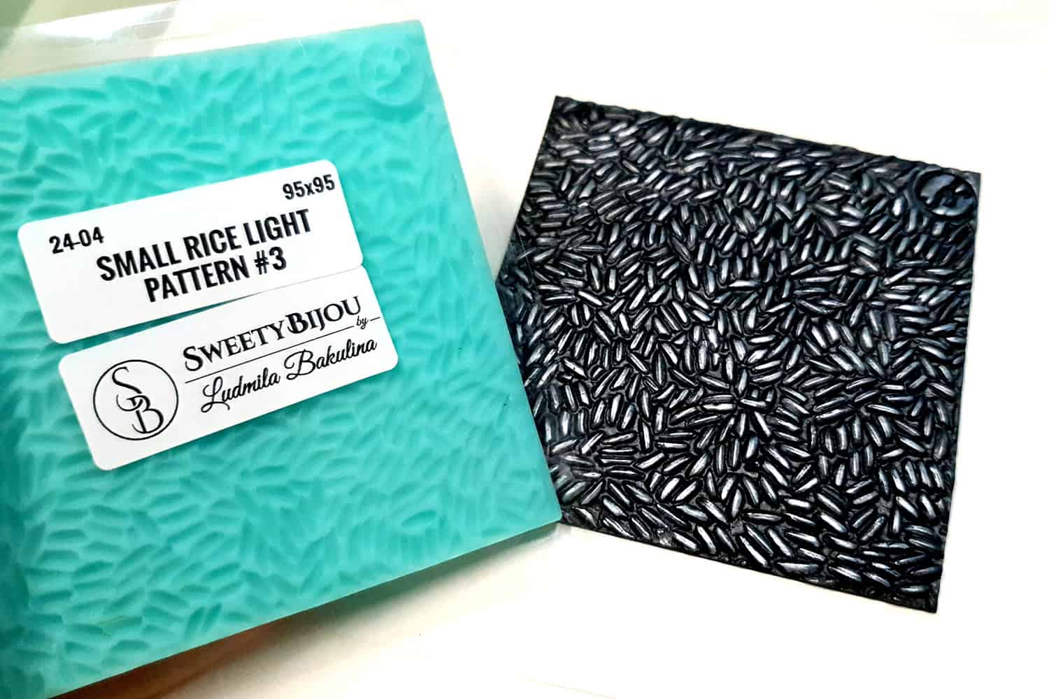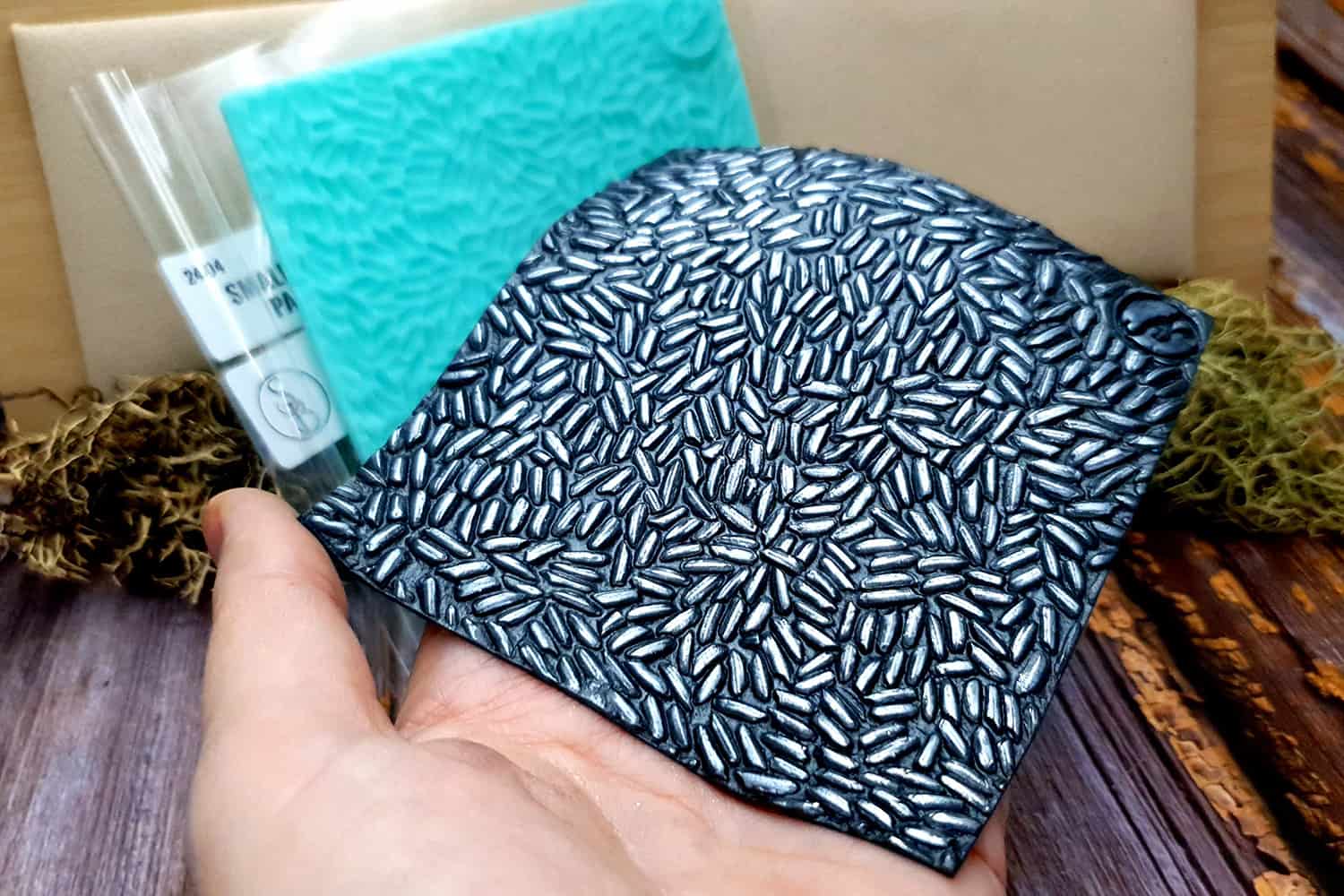 Ich habe diese Textur aus Silikon hergestellt, das flexibel ist und kein Trennmittel benötigt. Es kann bei einer Temperatur von 150 °C gebacken werden und kann mit Polymerton aller Marken verwendet werden (vorzugsweise wird ein WEICHER Ton empfohlen).