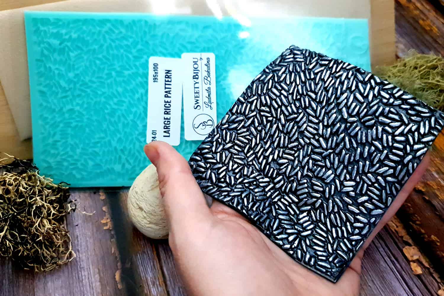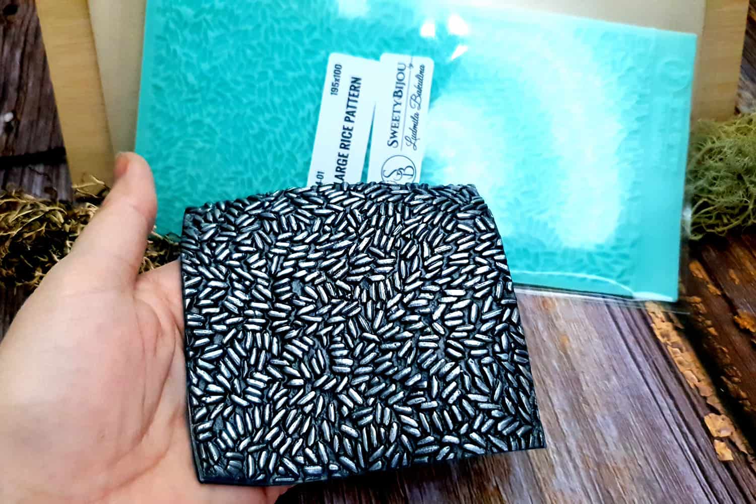 J'ai réalisé cette texture en silicone qui est souple et ne nécessite pas d'agent démoulant. Il peut être cuit à une température de 150°C et peut être utilisé avec toutes les marques de pâte polymère (de préférence une pâte SOFT).