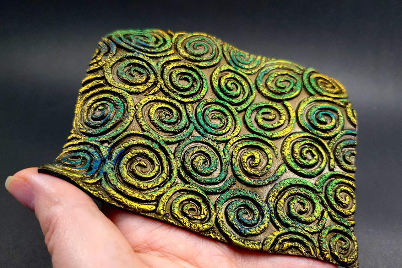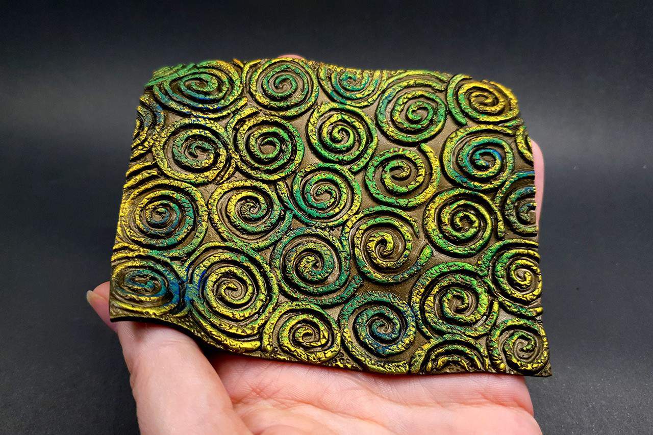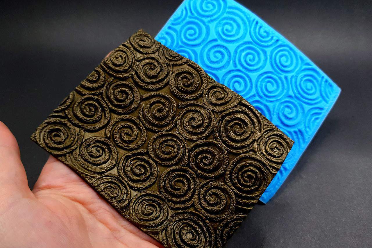 Ho realizzato questa texture in silicone che è flessibile e non richiede un agente distaccante. Può essere cotto a una temperatura di 150'C e può essere utilizzato con tutte le marche di pasta polimerica (preferibilmente consigliata una pasta SOFT).