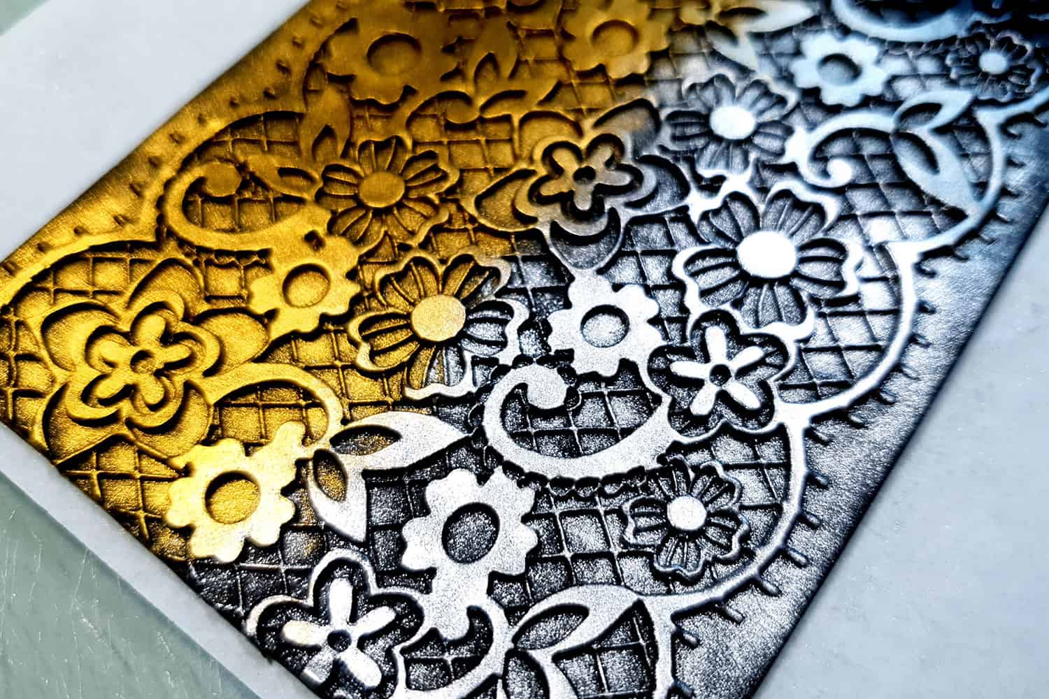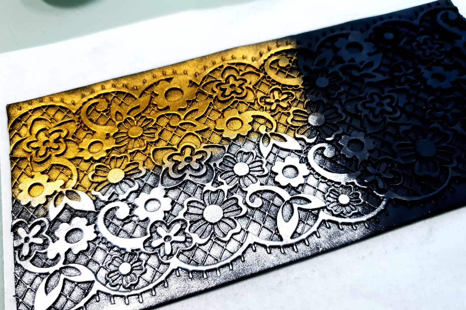 I have wanted this for a while, there are so many ways to use this texture sheet. My favourite is for faux cloisonne work, but it looks equally as good with just a mica top coat.