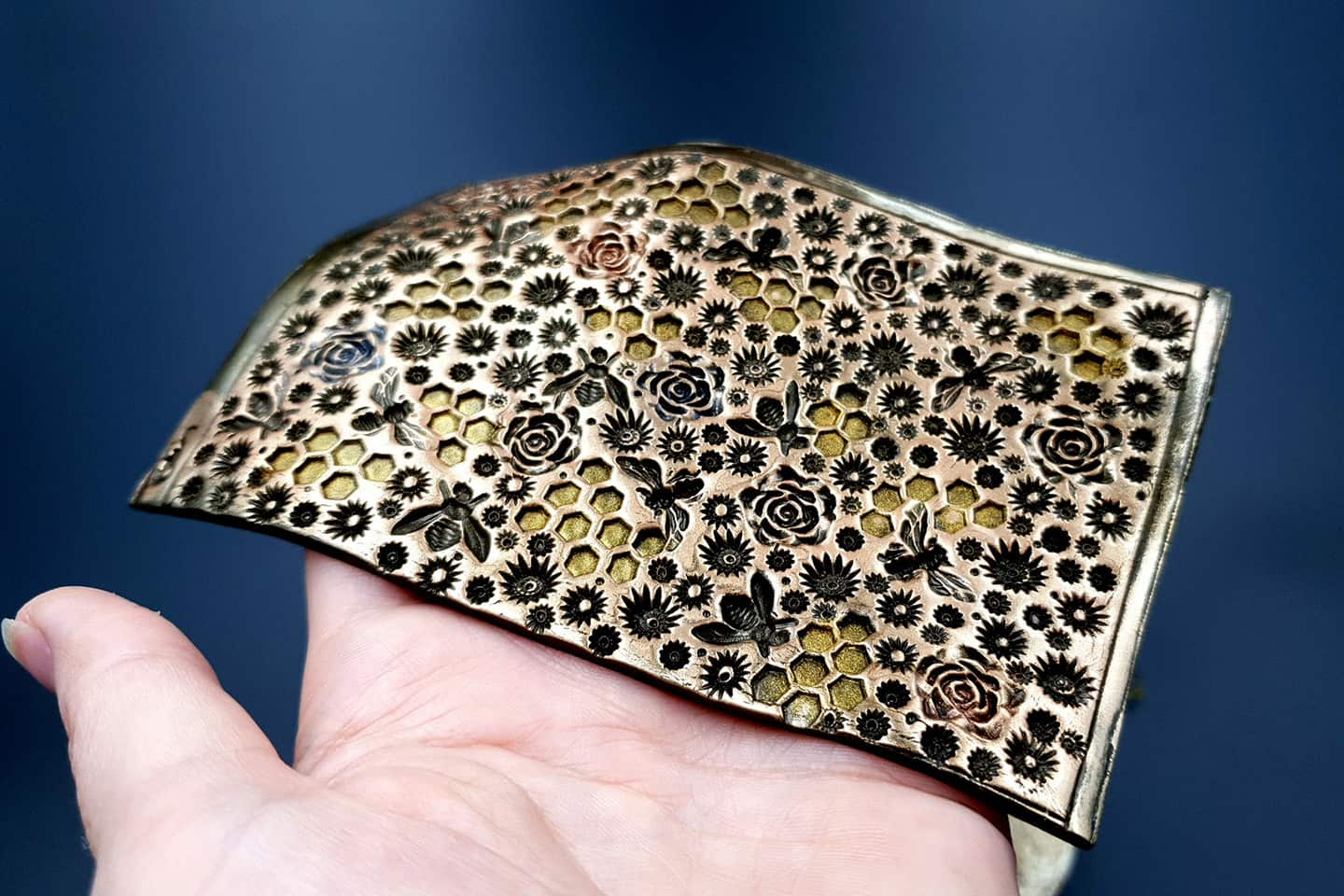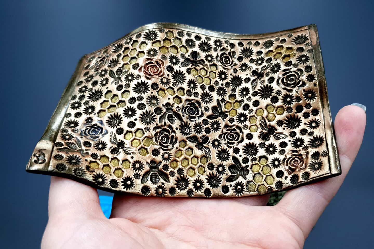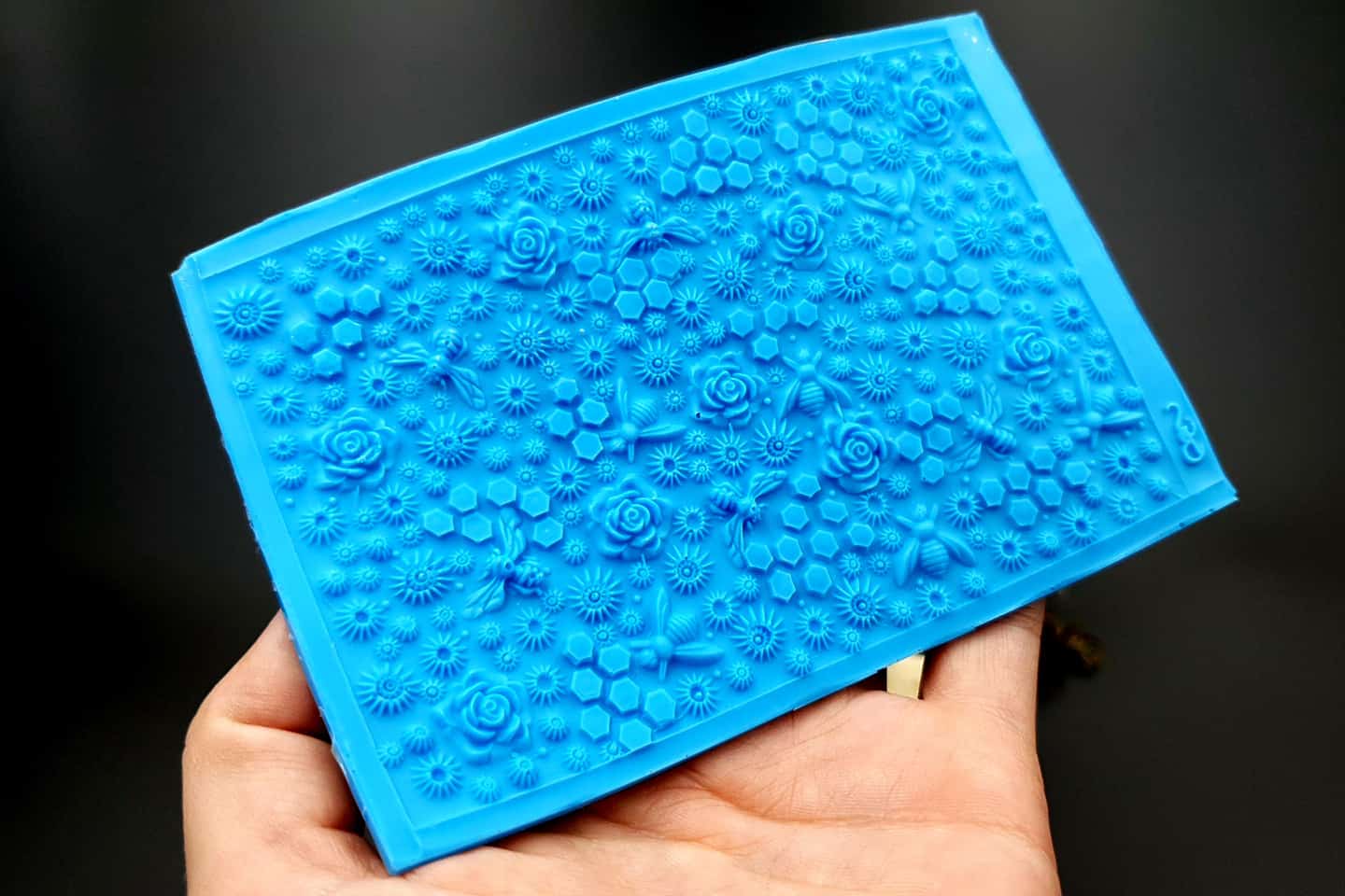 I made this texture from silicone which is flexible and does not require a release agent. It can be baked at a temperature of 150’C and can be used with all brands of polymer clay (preferably recommended a SOFT clay).