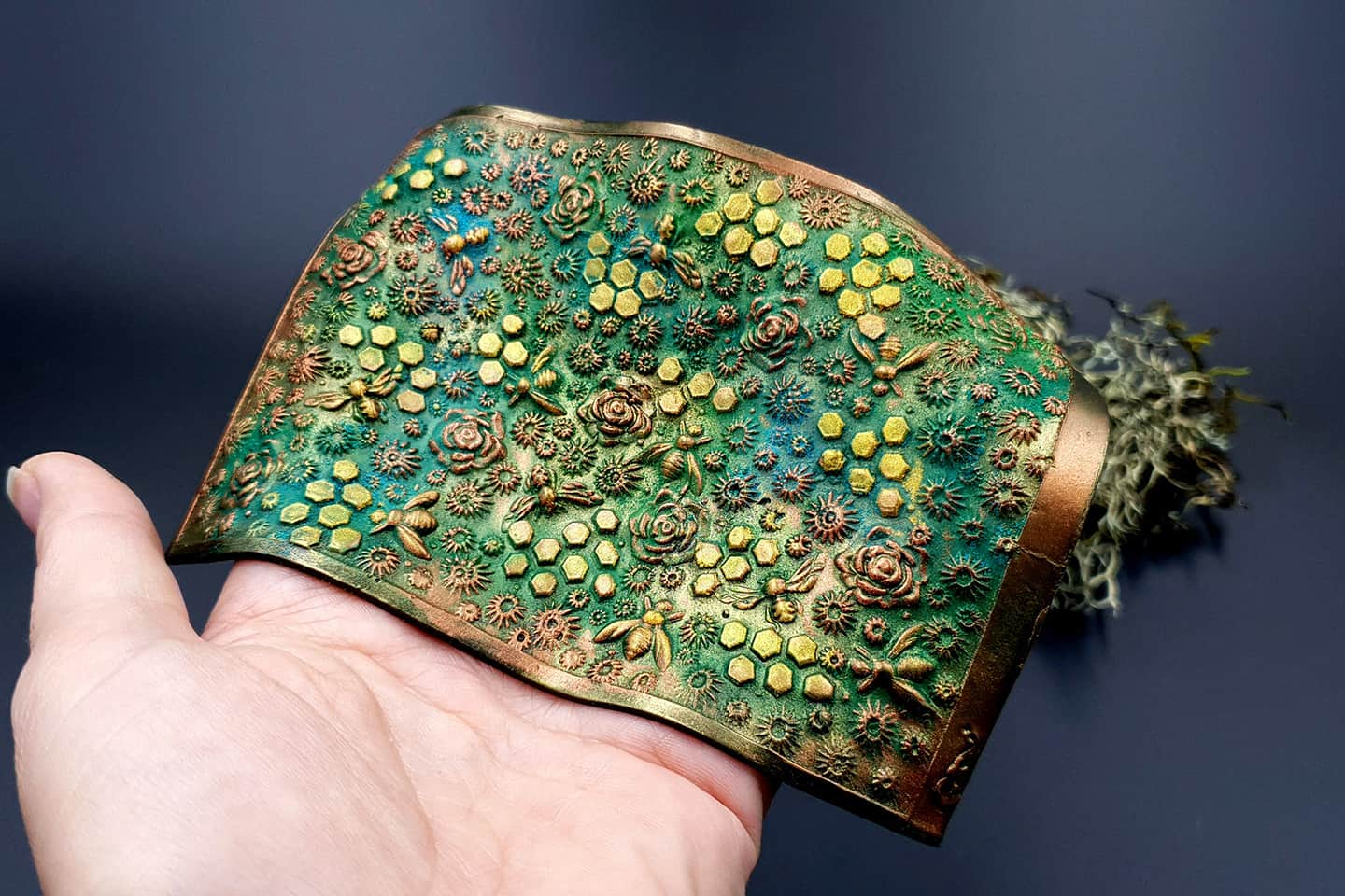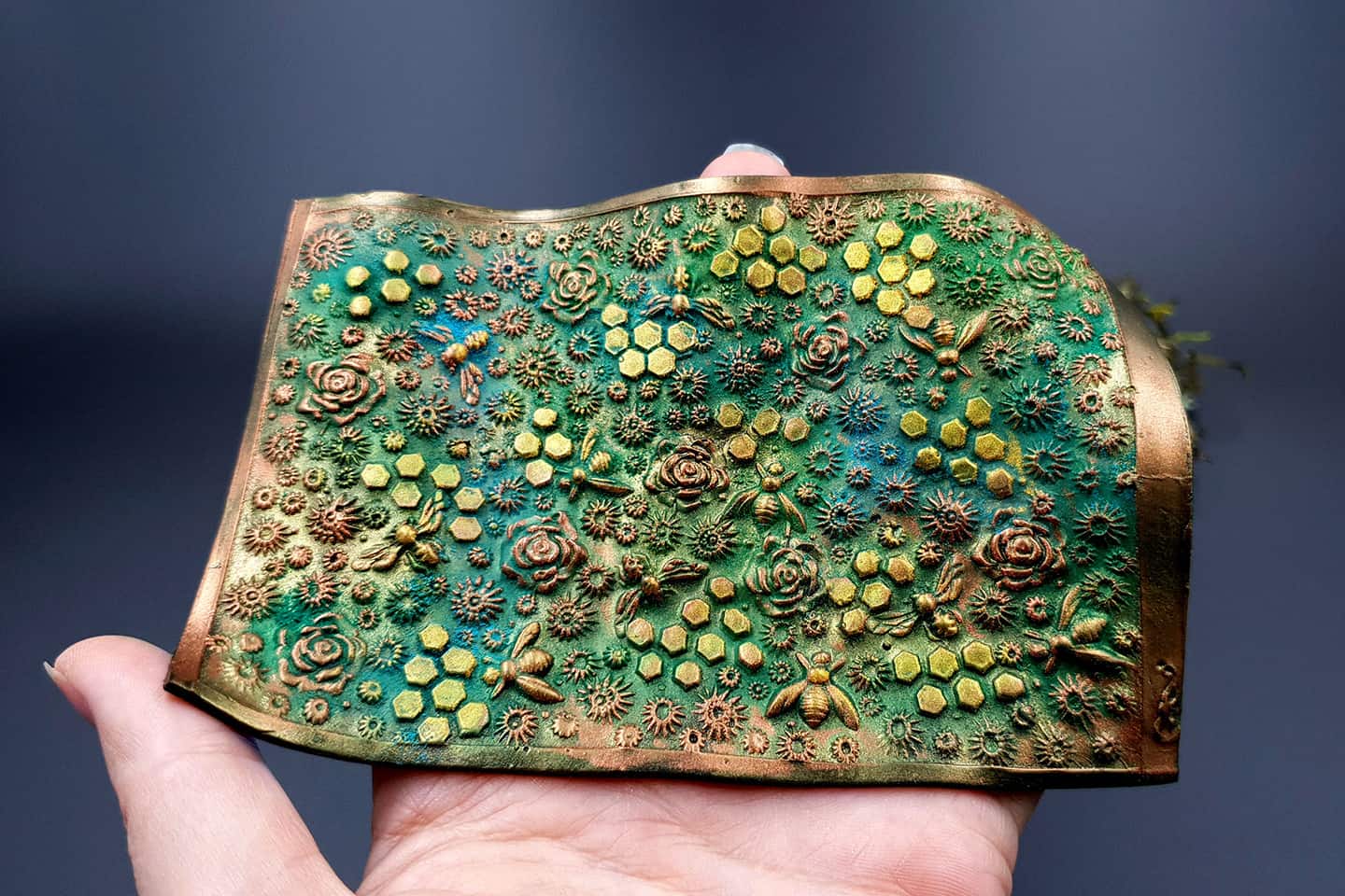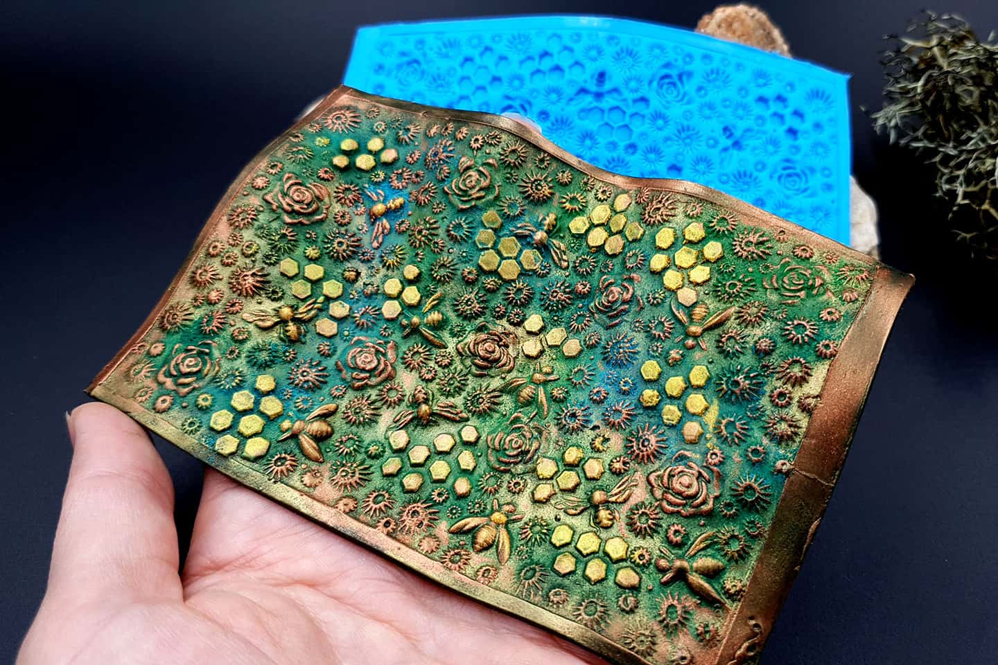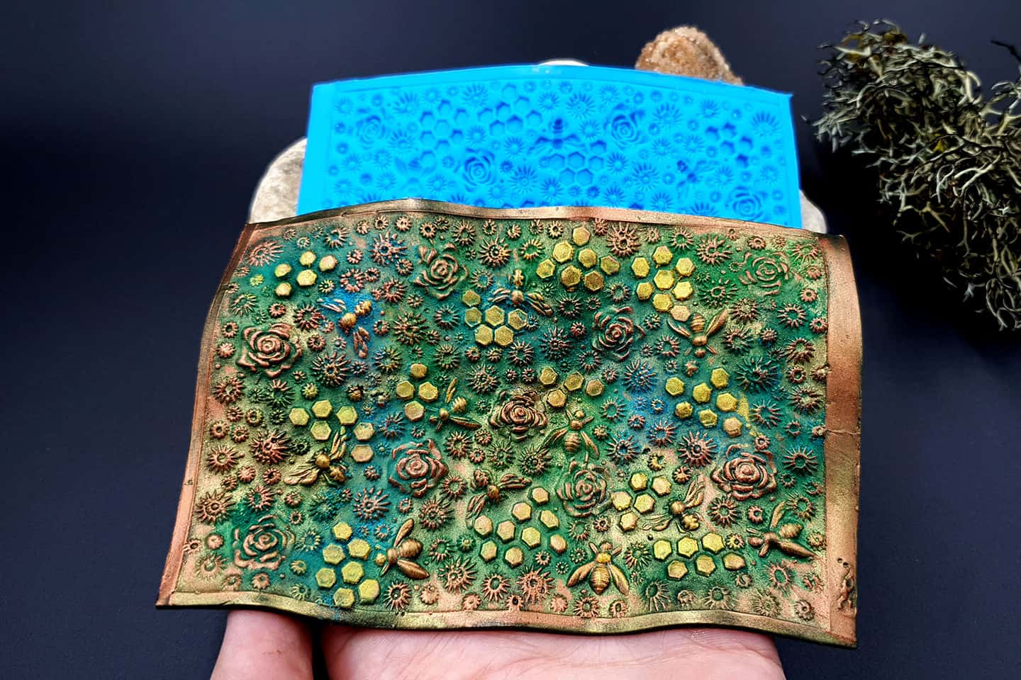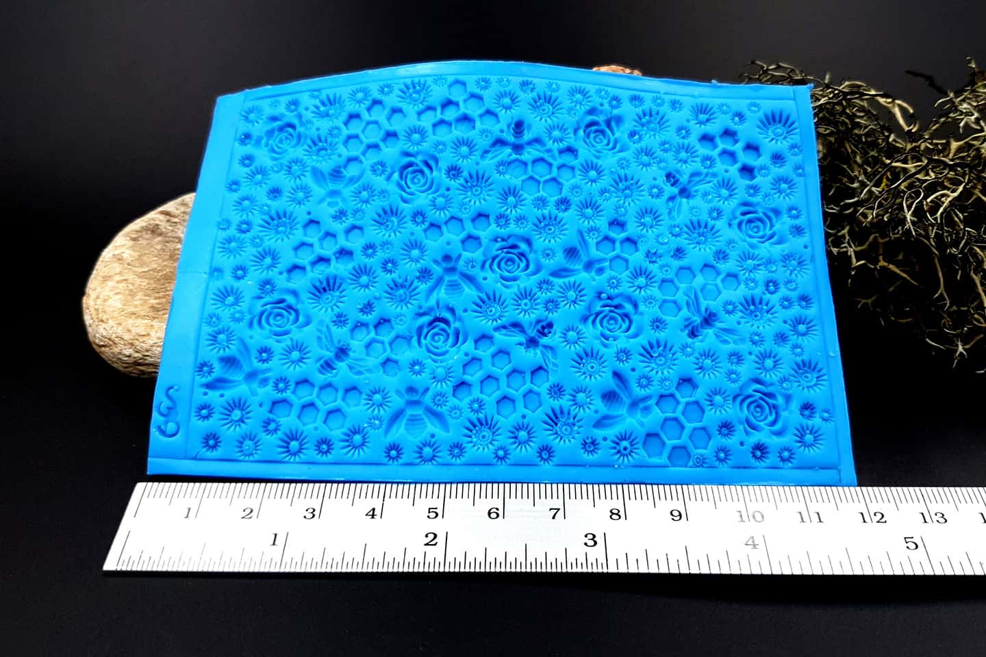 I made this texture from silicone which is flexible and does not require a release agent. It can be baked at a temperature of 150’C and can be used with all brands of polymer clay (preferably recommended a SOFT clay).