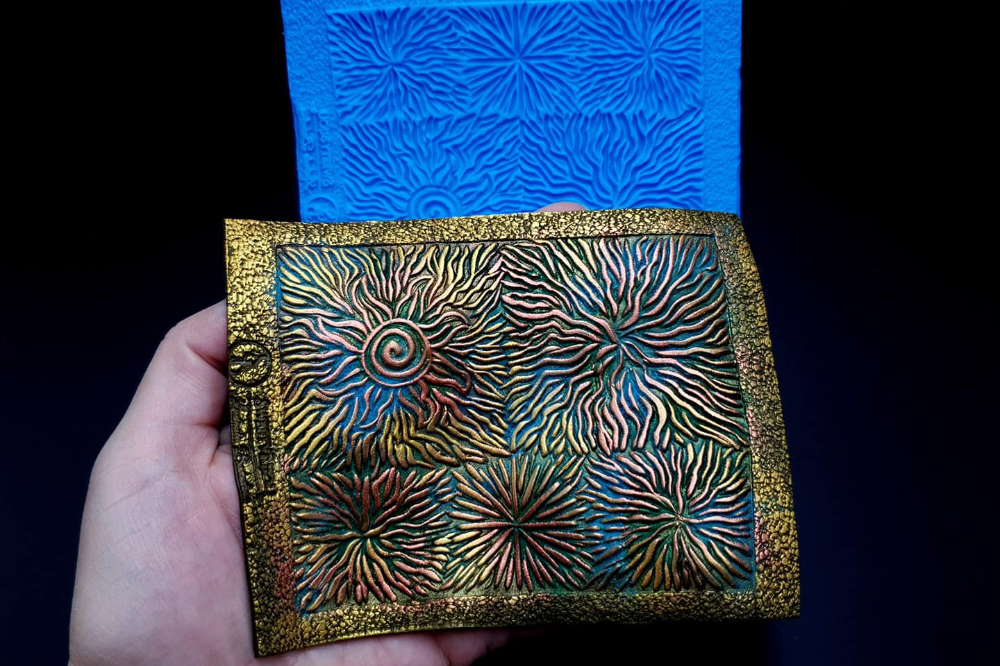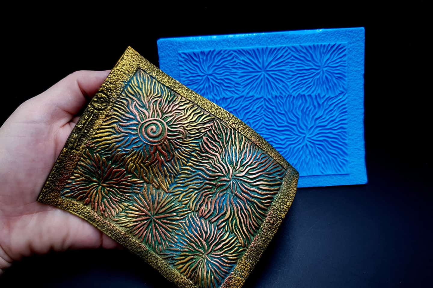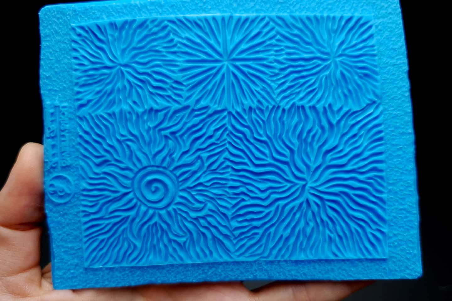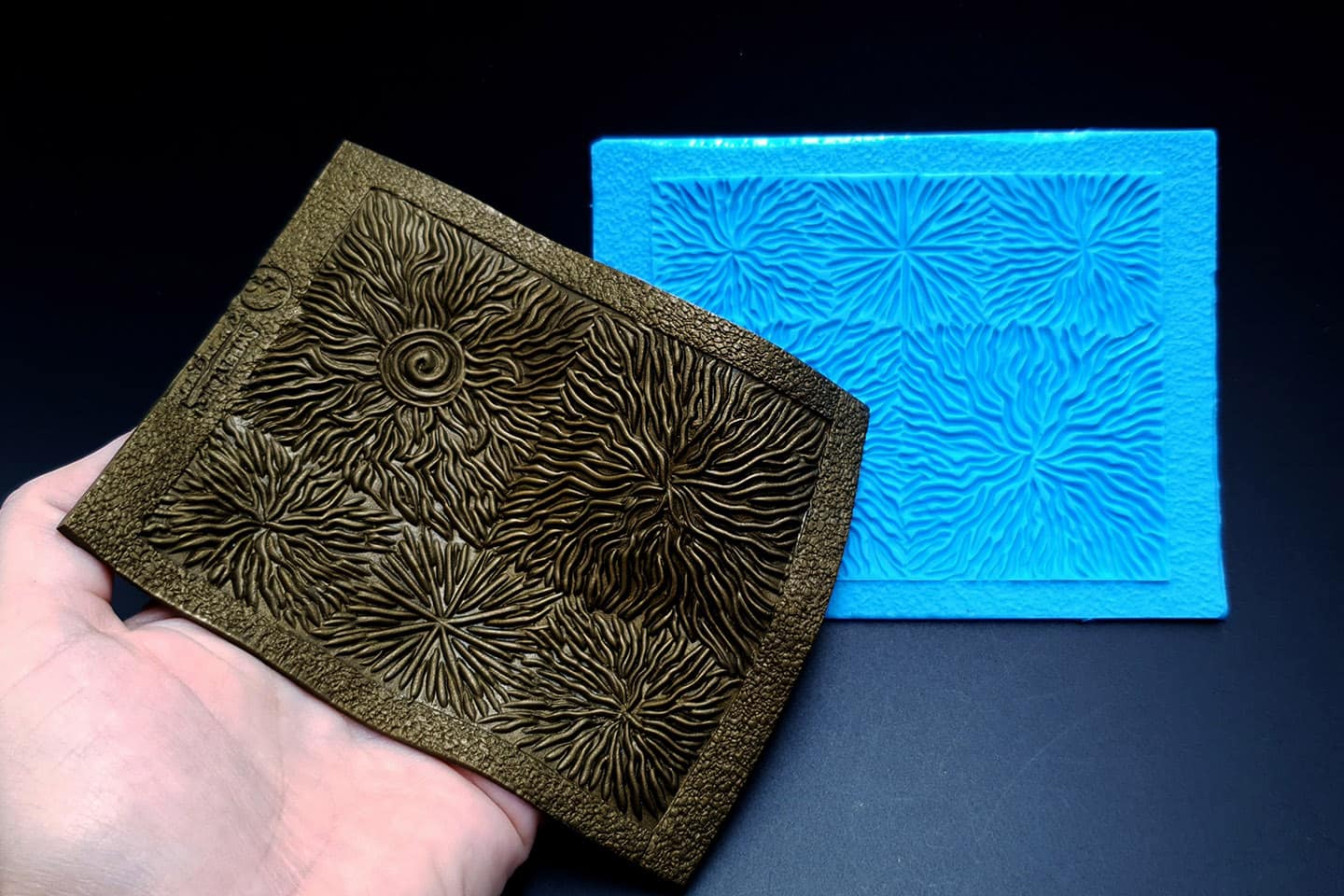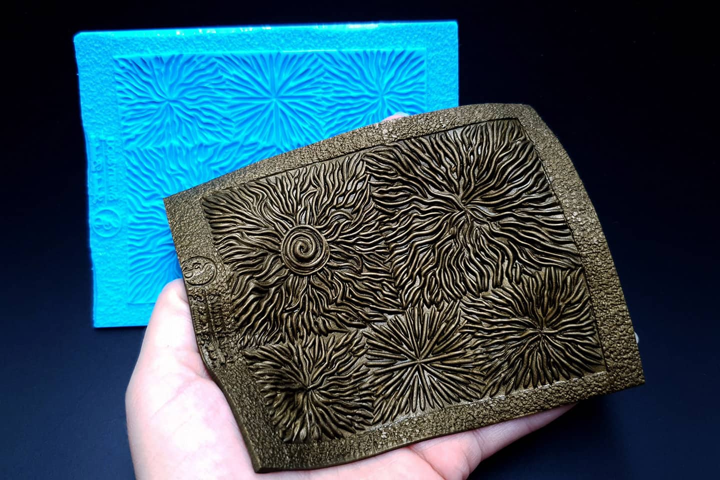 I made this texture from silicone which is flexible and does not require a release agent. It can be baked at a temperature of 150’C and can be used with all brands of polymer clay (preferably recommended a SOFT clay).