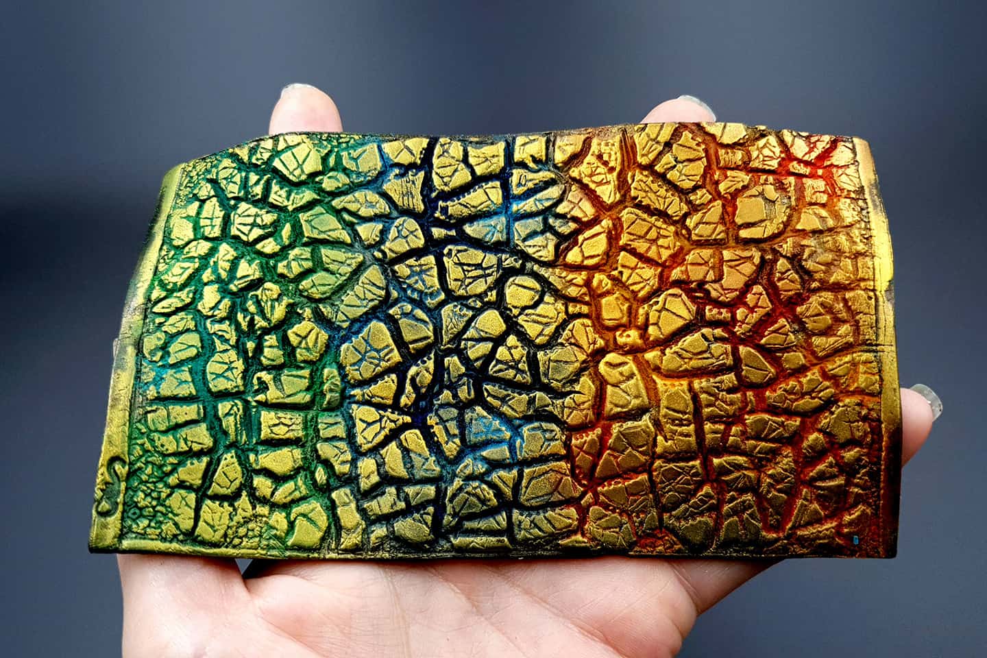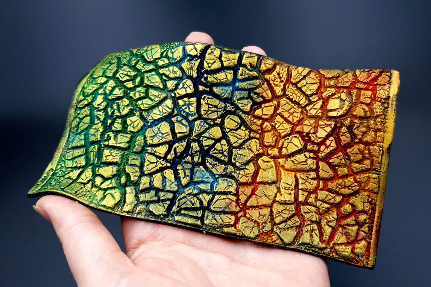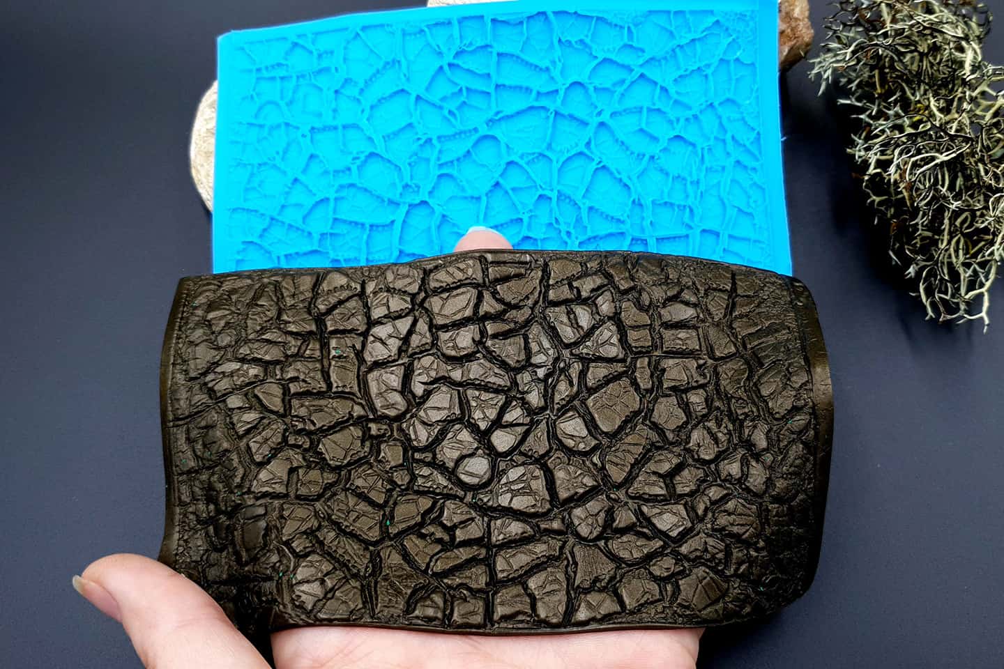 I made this texture from silicone which is flexible and does not require a release agent. It can be baked at a temperature of 150’C and can be used with all brands of polymer clay (preferably recommended a SOFT clay).