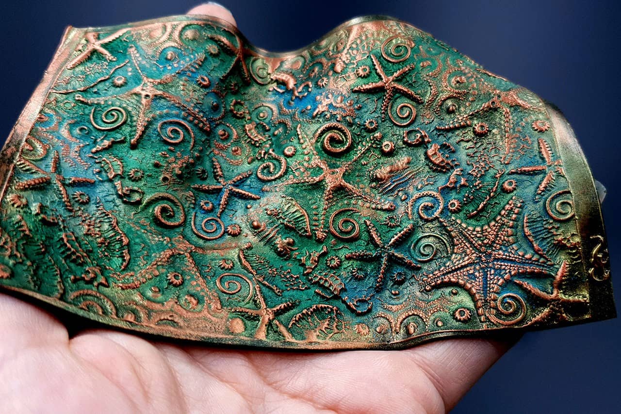 I made this texture from silicone which is flexible and does not require a release agent. It can be baked at a temperature of 150’C and can be used with all brands of polymer clay (preferably recommended a SOFT clay).