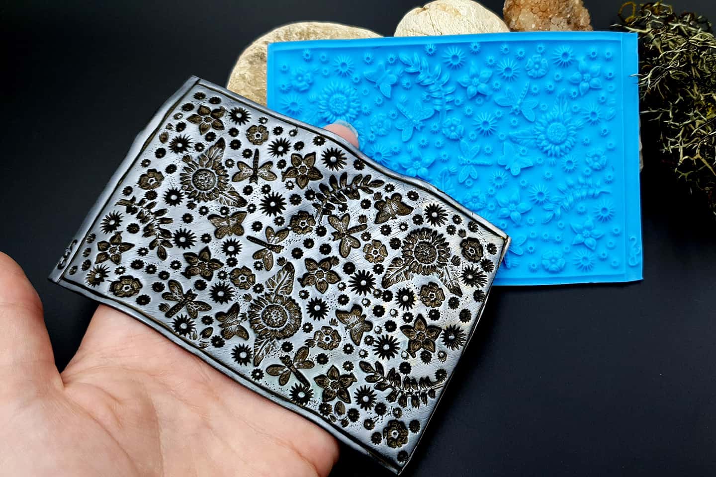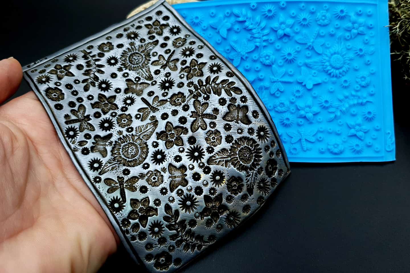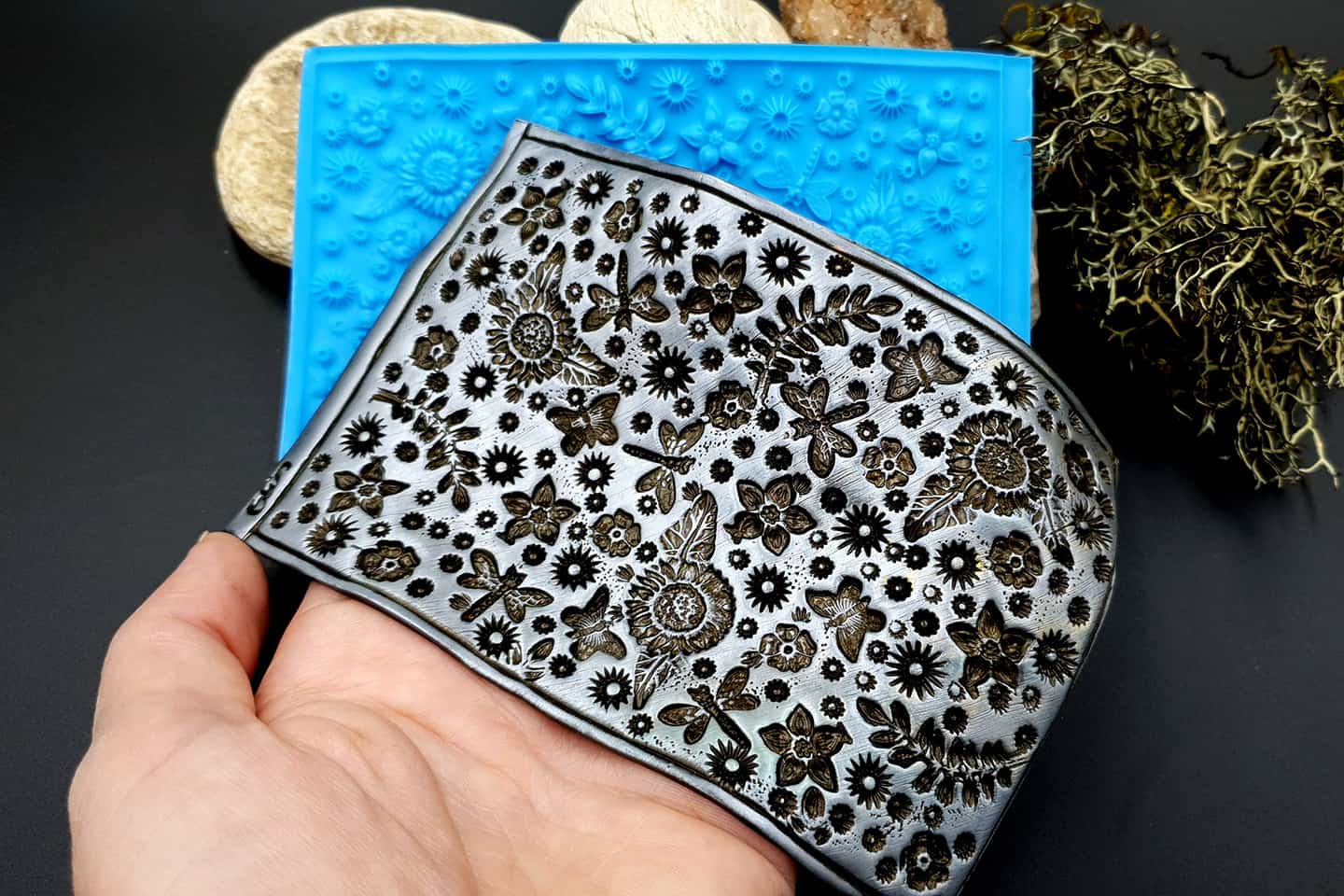 I made this texture from silicone which is flexible and does not require a release agent. It can be baked at a temperature of 150’C and can be used with all brands of polymer clay (preferably recommended a SOFT clay).
