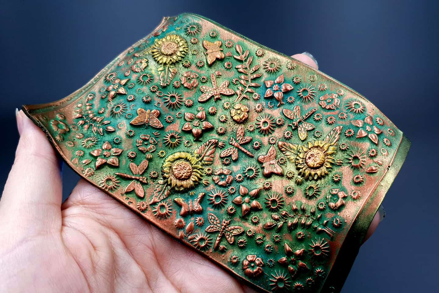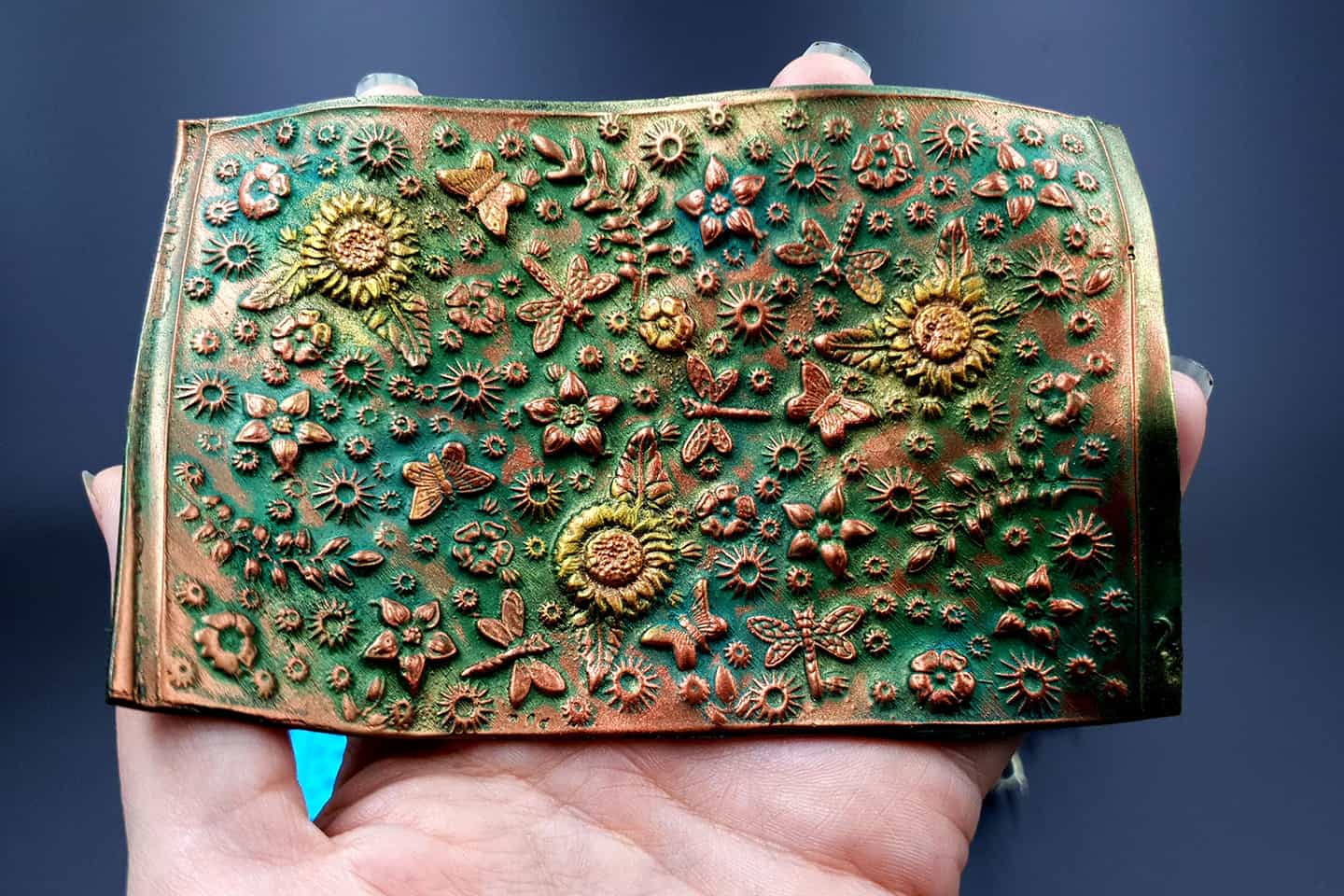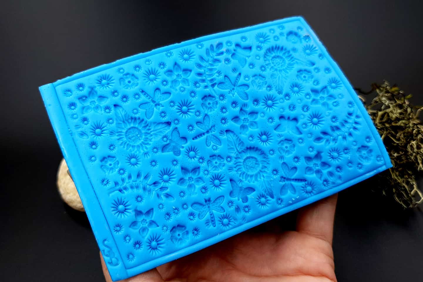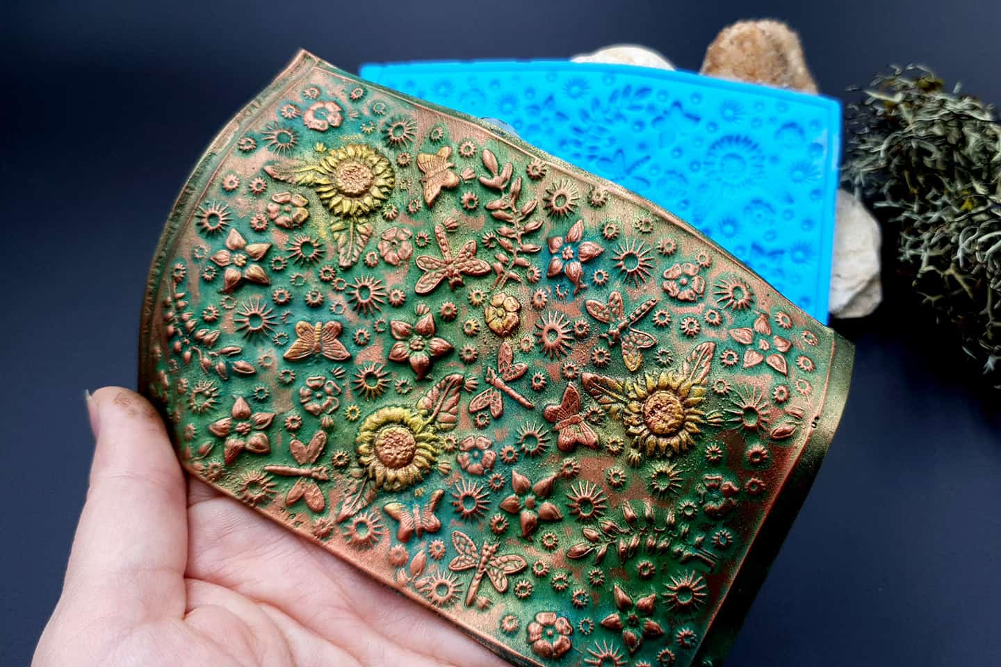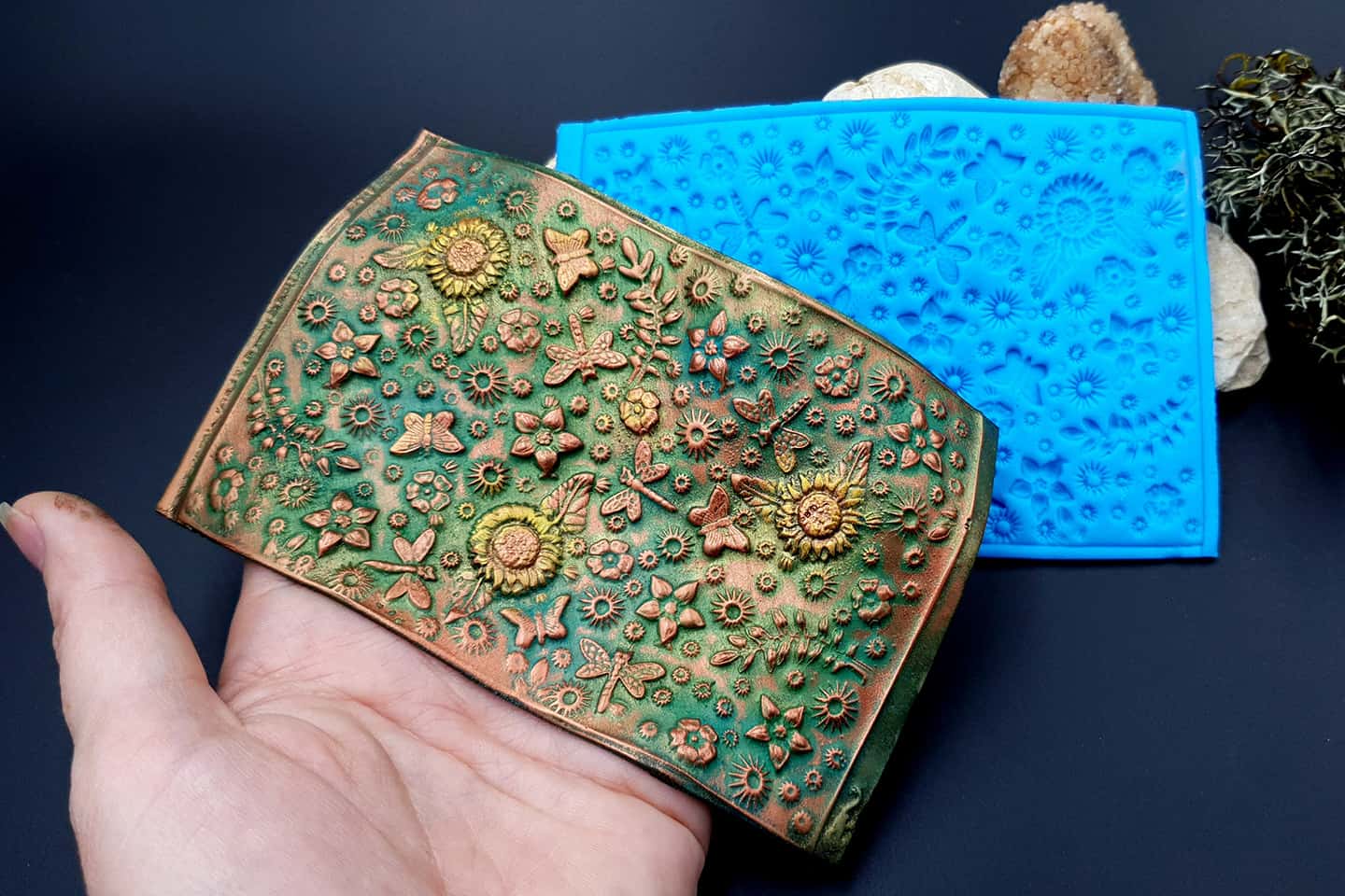 I made this texture from silicone which is flexible and does not require a release agent. It can be baked at a temperature of 150’C and can be used with all brands of polymer clay (preferably recommended a SOFT clay).