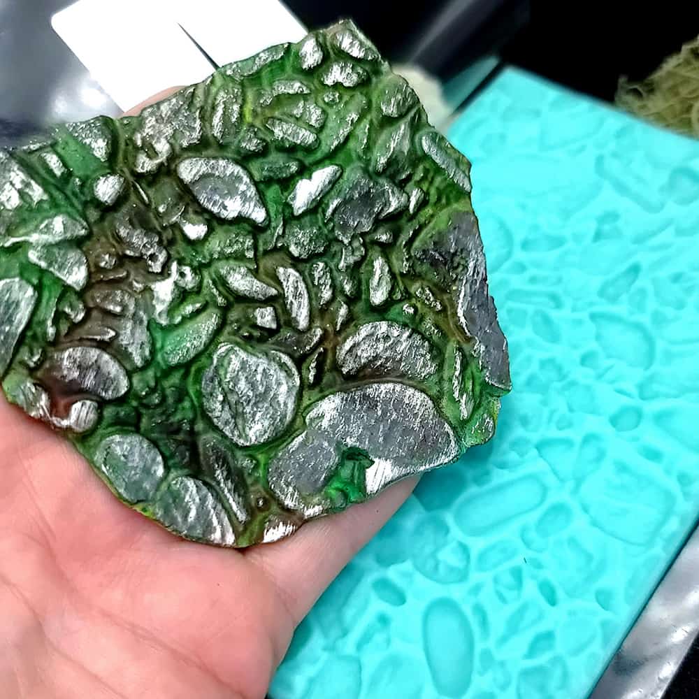 I made this texture from silicone which is flexible and does not require a release agent. It can be baked at a temperature of 150’C and can be used with all brands of polymer clay (preferably recommended a SOFT clay).