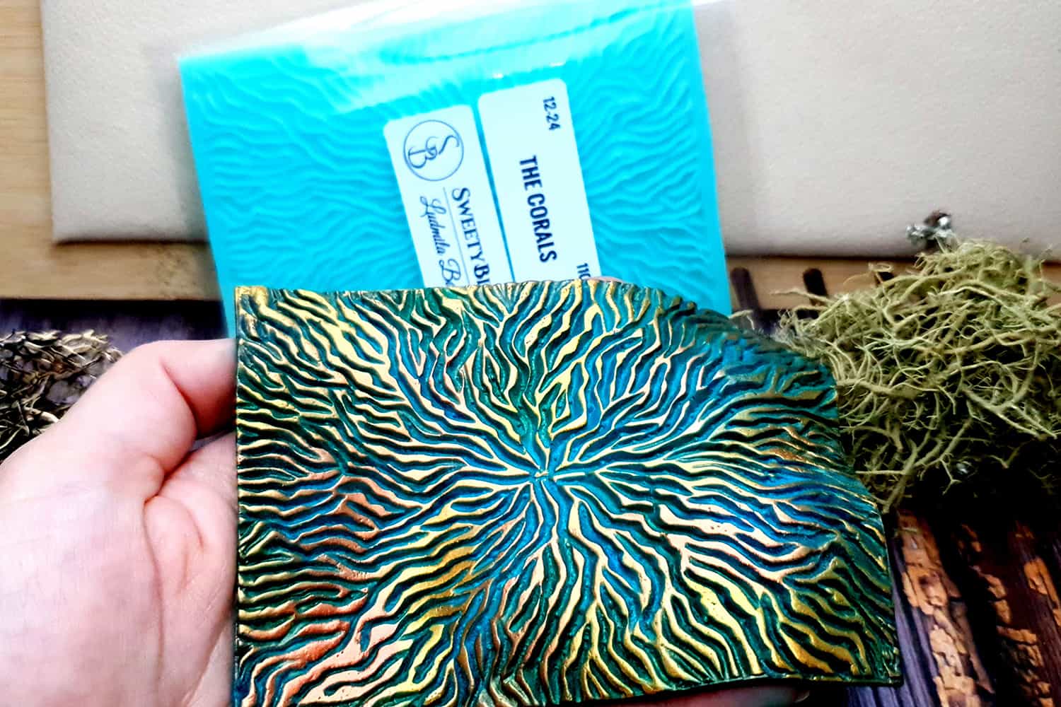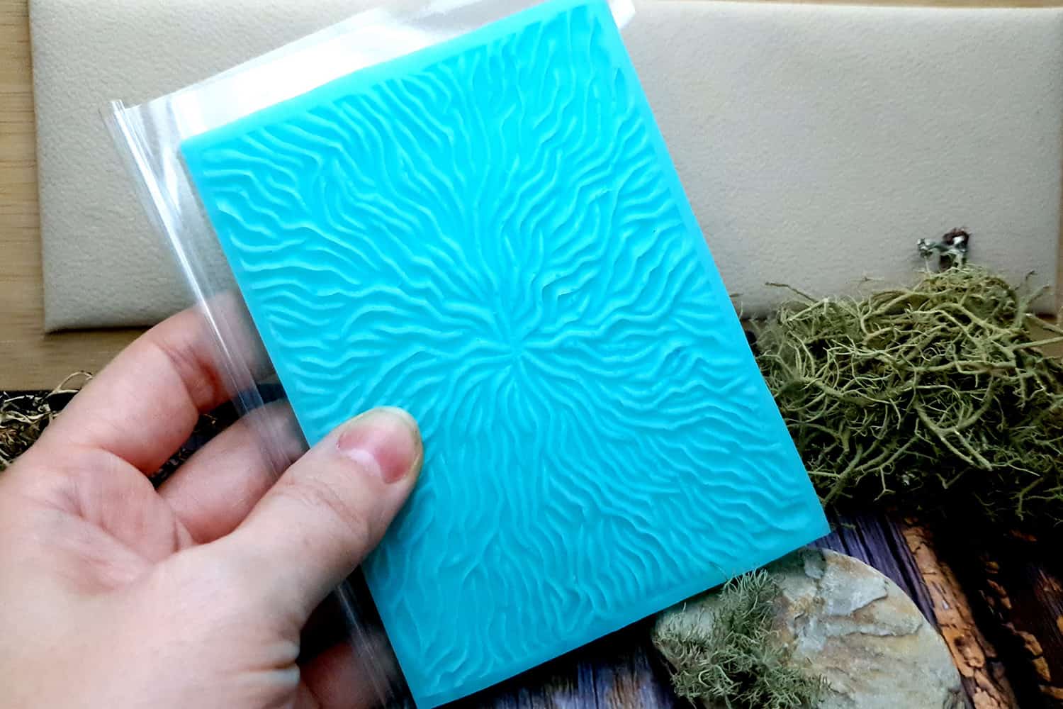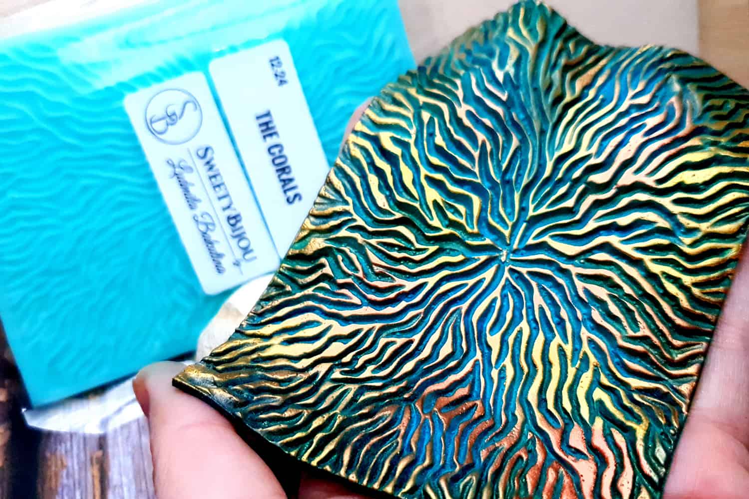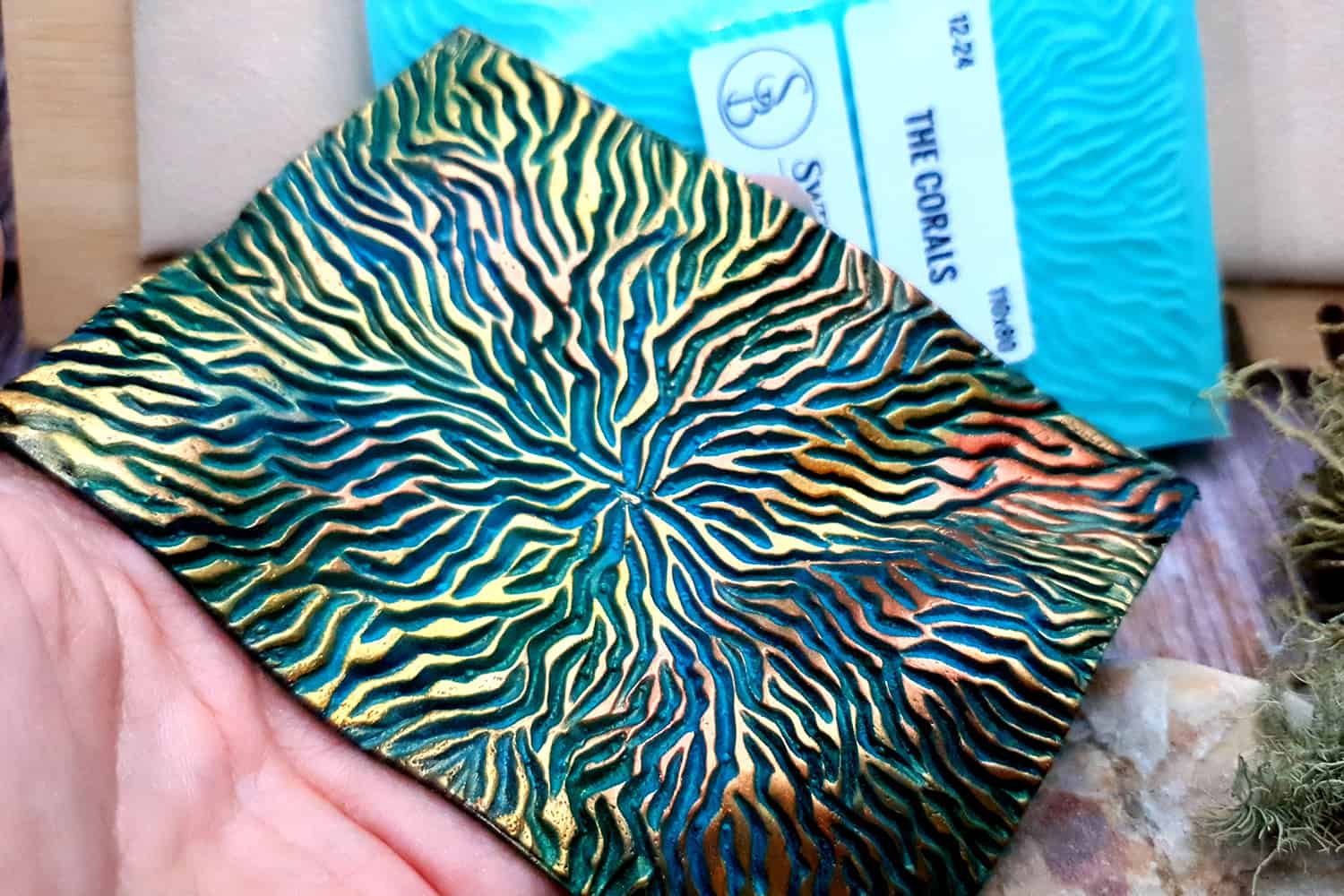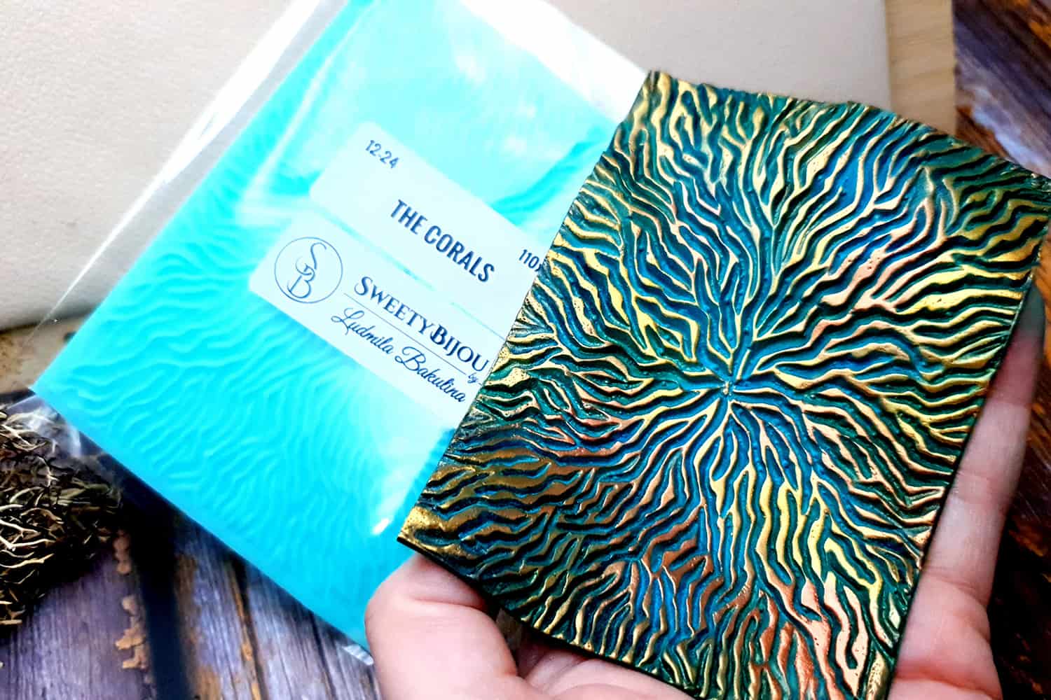 I made this texture from silicone which is flexible and does not require a release agent. It can be baked at a temperature of 150’C and can be used with all brands of polymer clay (preferably recommended a SOFT clay).