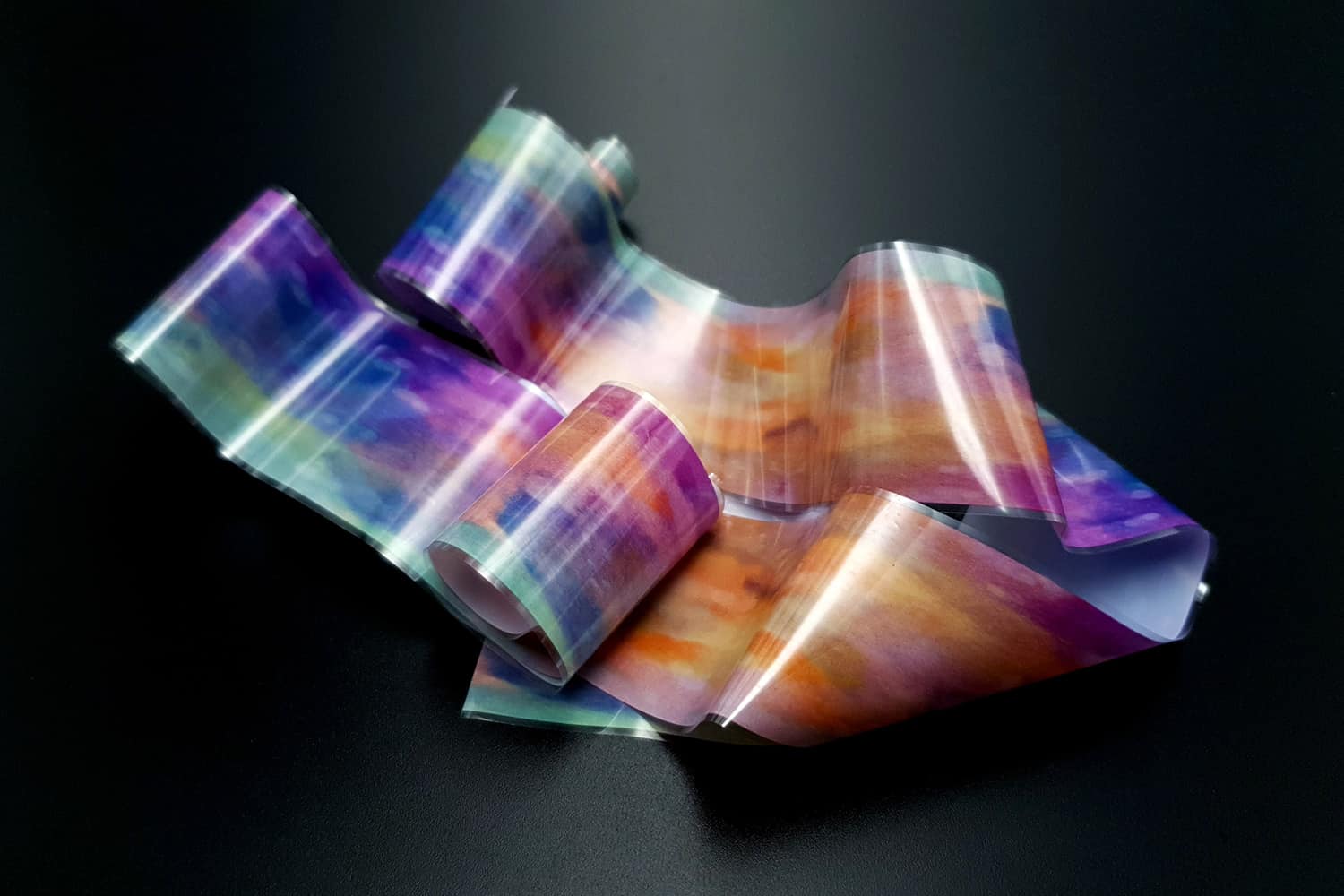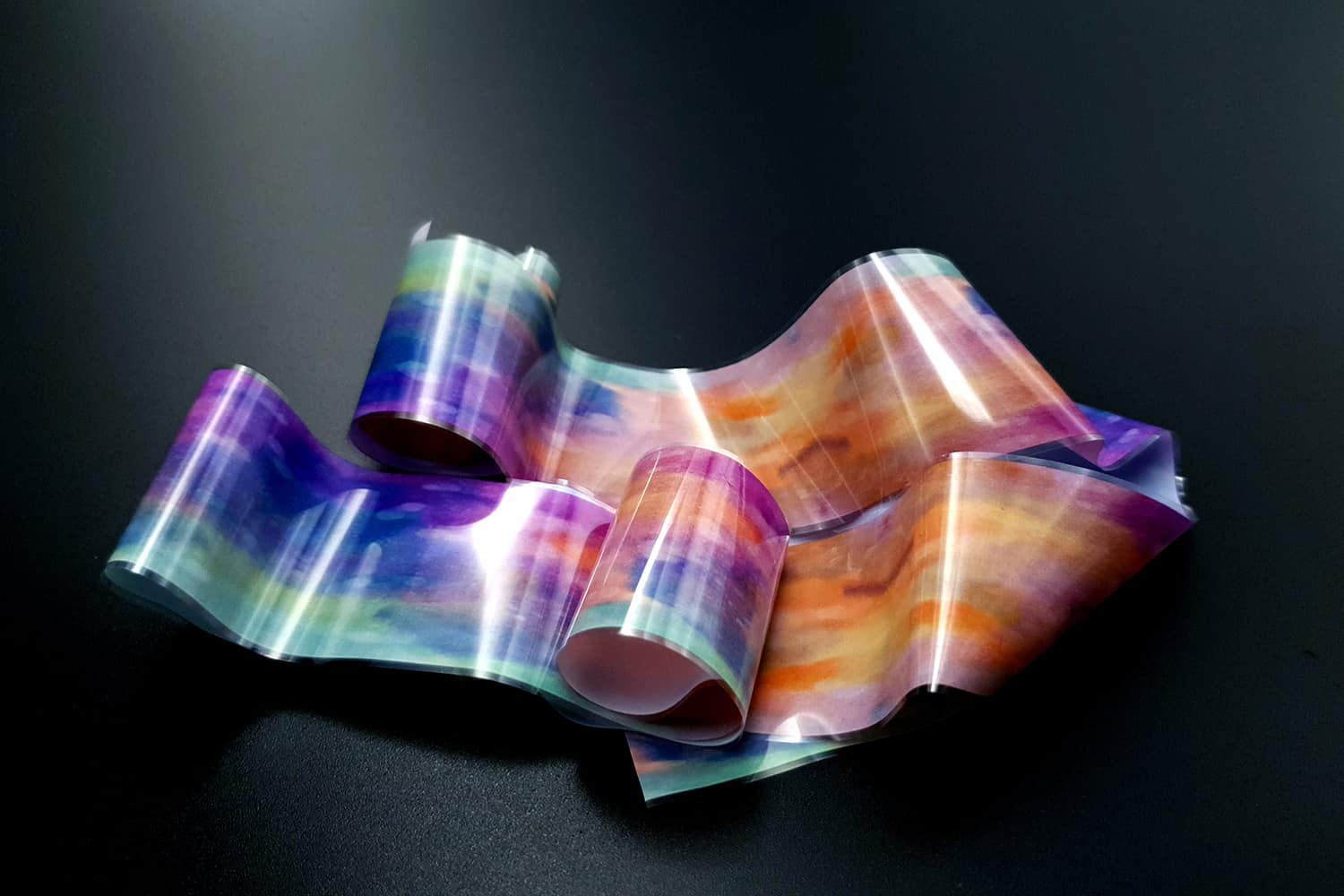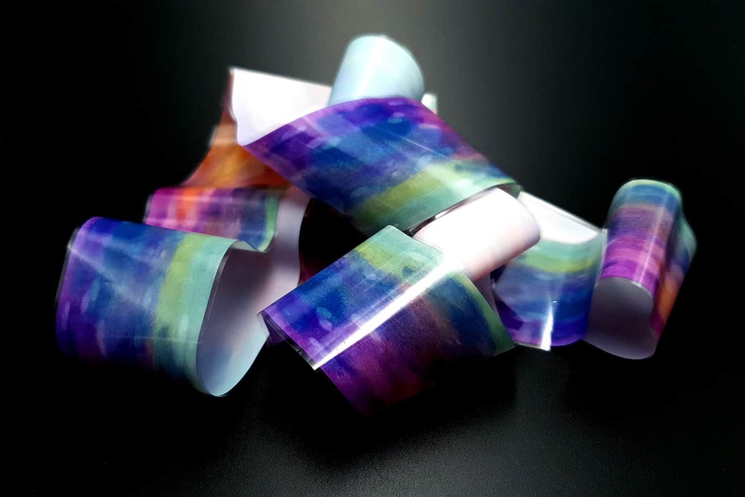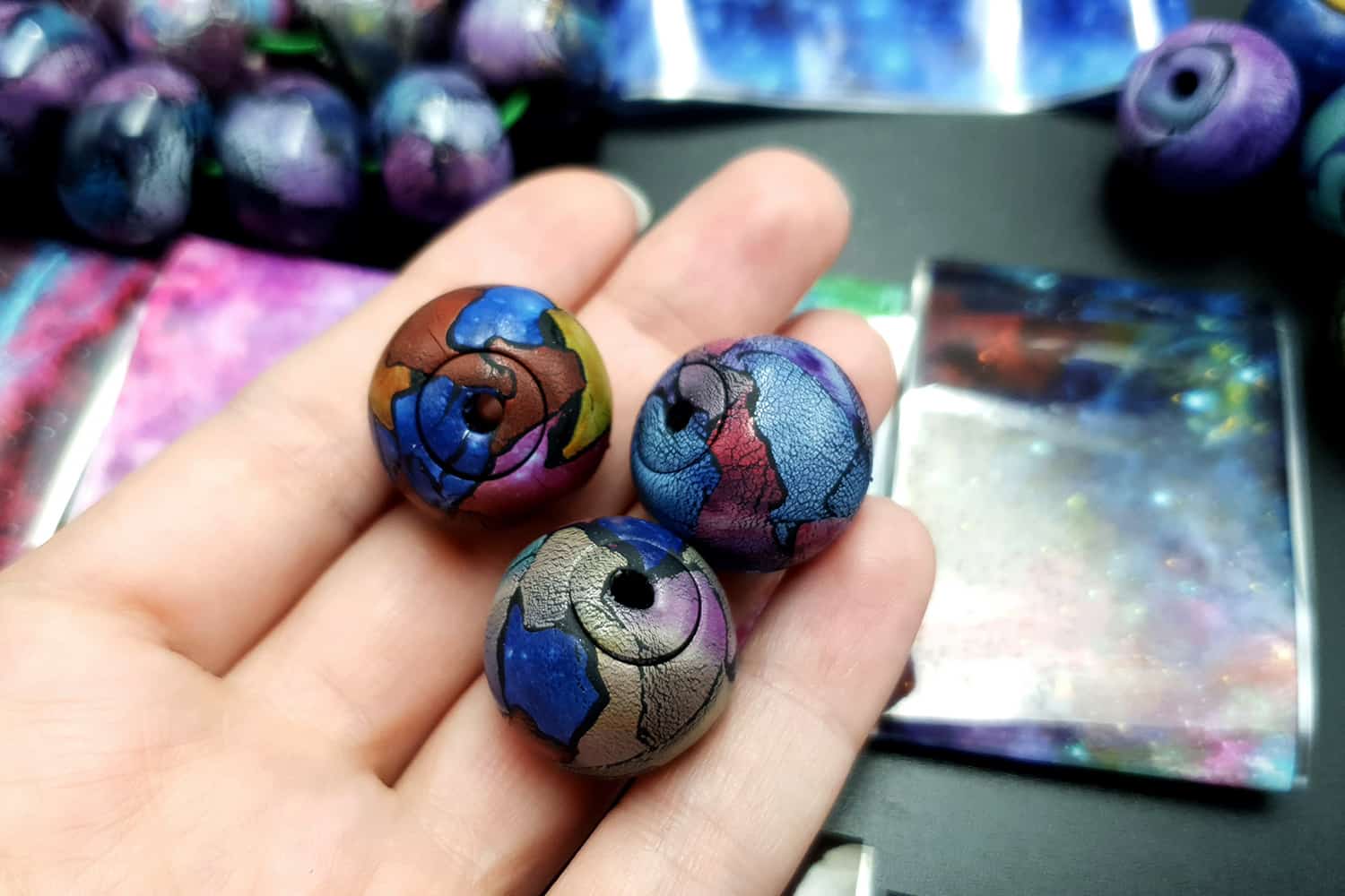“Transfer Foils – Watercolor #2” are amazing materials with can easily be used in many polymer clay projects. The foils give a unique effect as have colorful, metallic, pearlescent, and holographic effects! When used on raw clay – the foils can be cracked while the clay is stretching, which is a really great effect.
