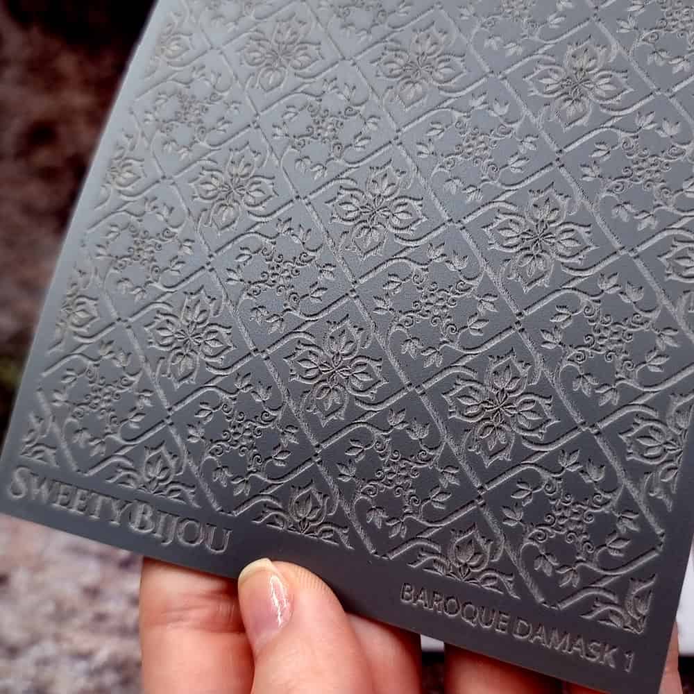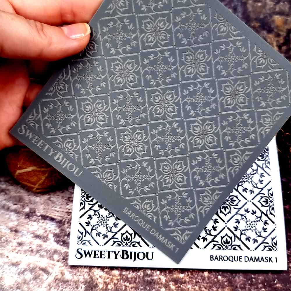 Crafted with attention to detail, the rubber sheet is designed to emboss a deep and detailed impression onto polymer or metal clay, allowing for the creation of jewelry with a rich, textured surface. The design is segmented into square tiles, each framing the elegant damask motif, offering versatility in creating various jewelry sizes and shapes.