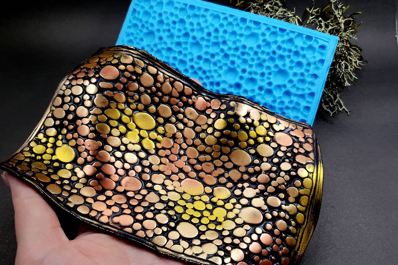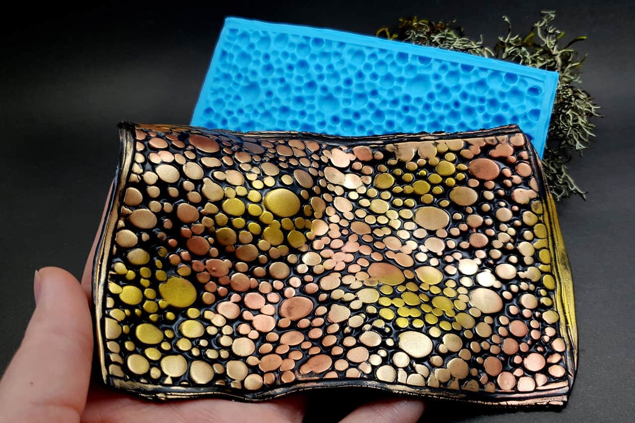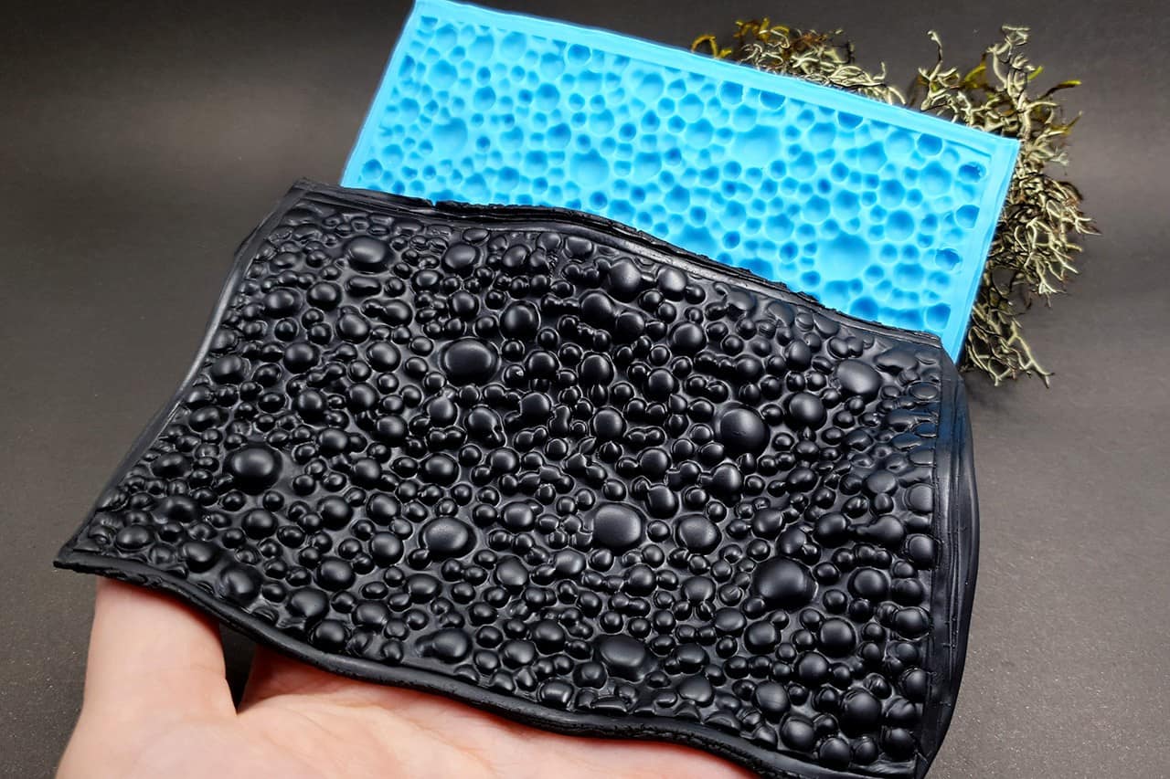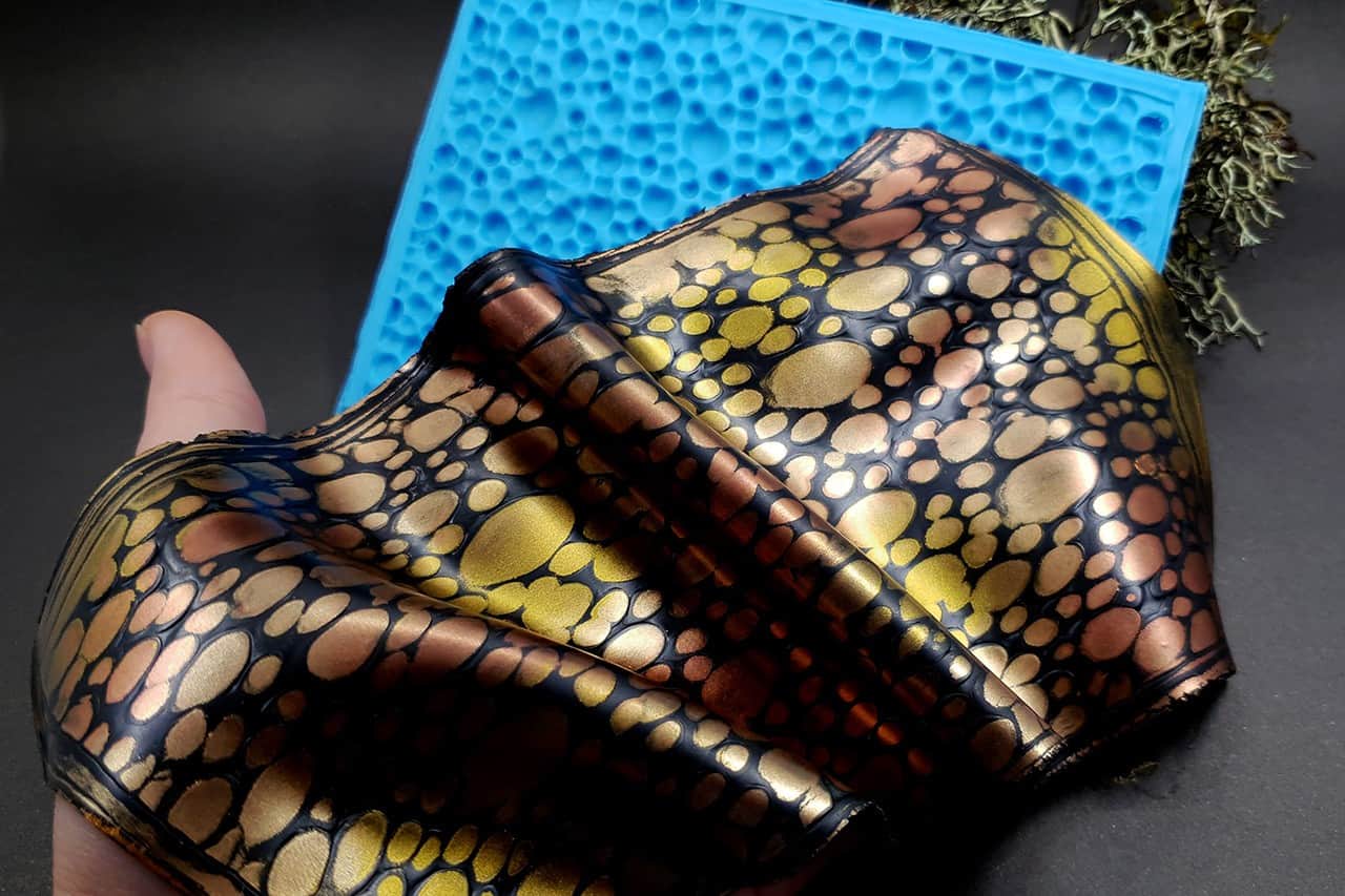 I made this texture from silicone which is flexible and does not require a release agent. It can be baked at a temperature of 150’C and can be used with all brands of polymer clay (preferably recommended a SOFT clay).