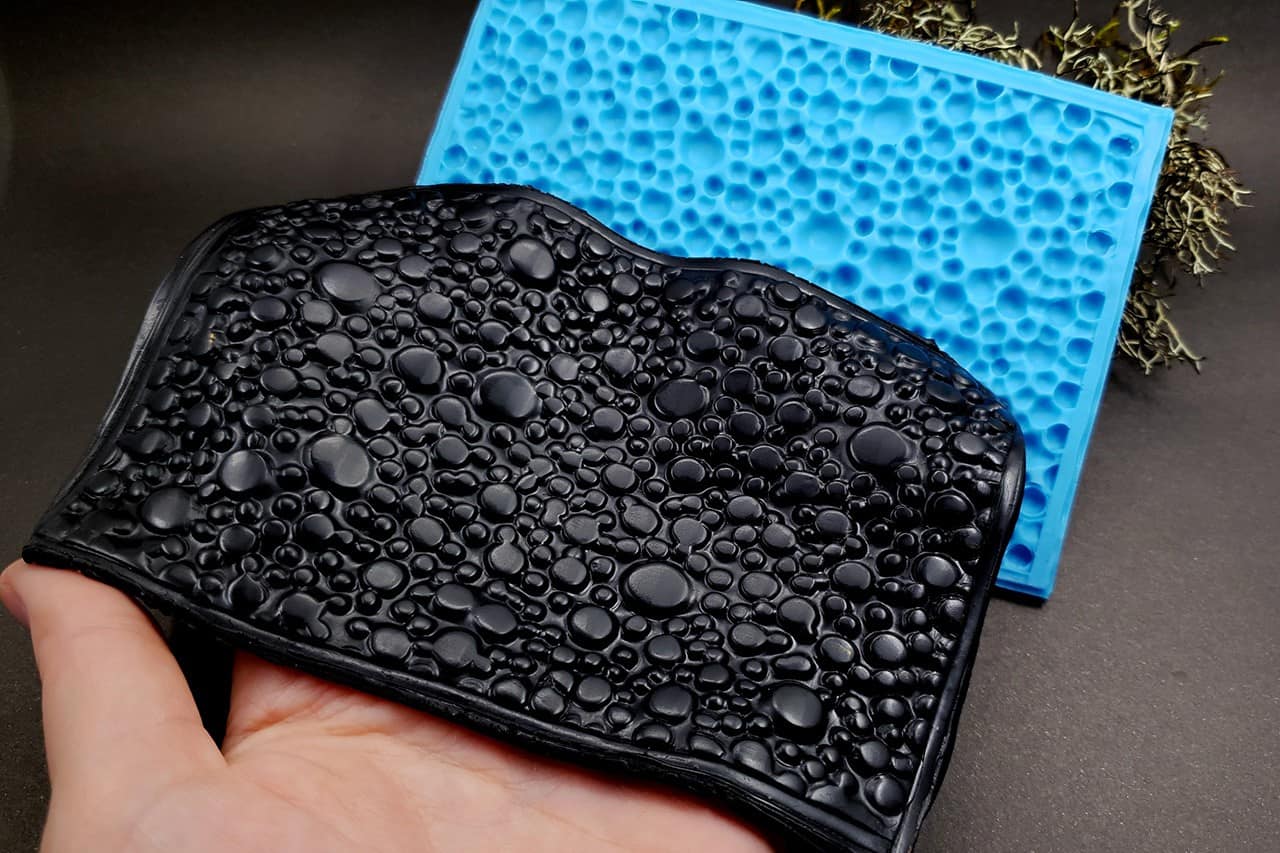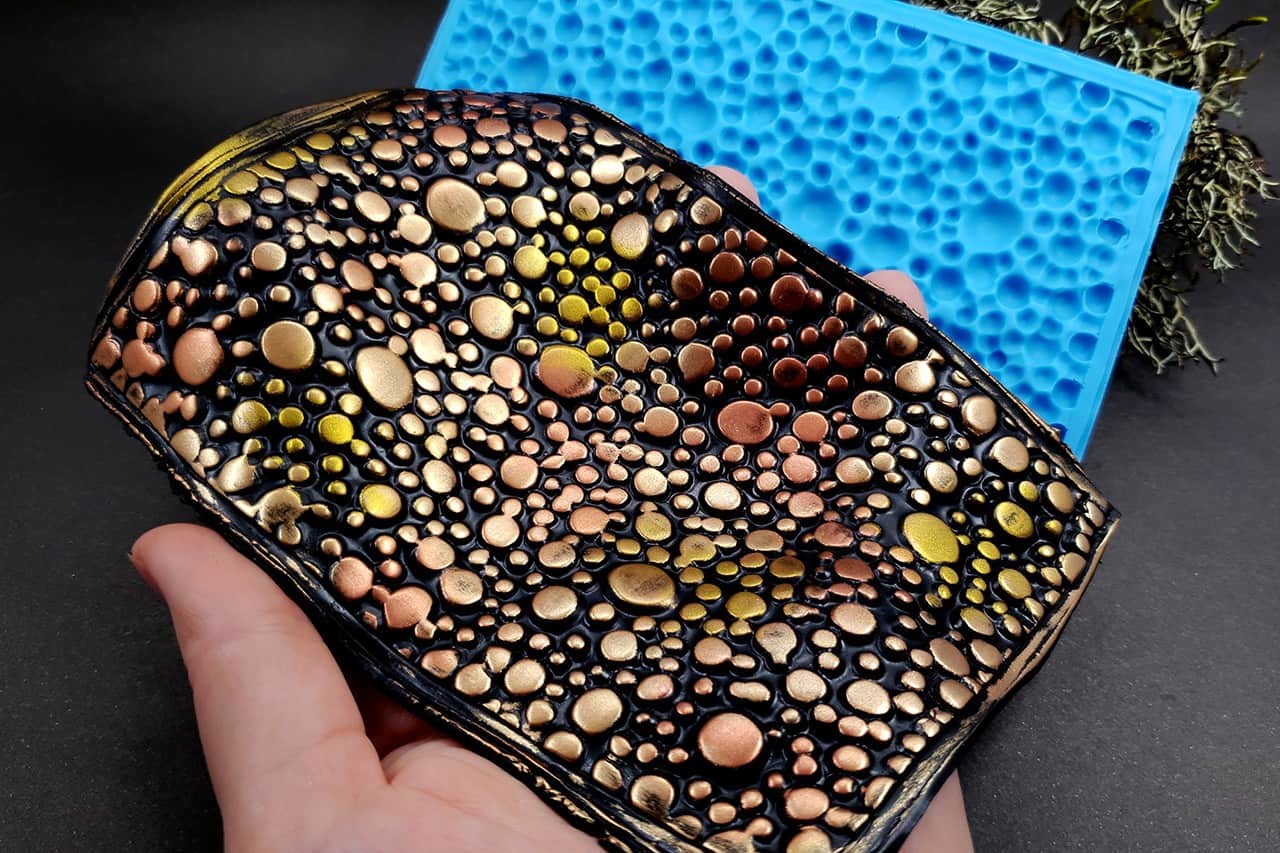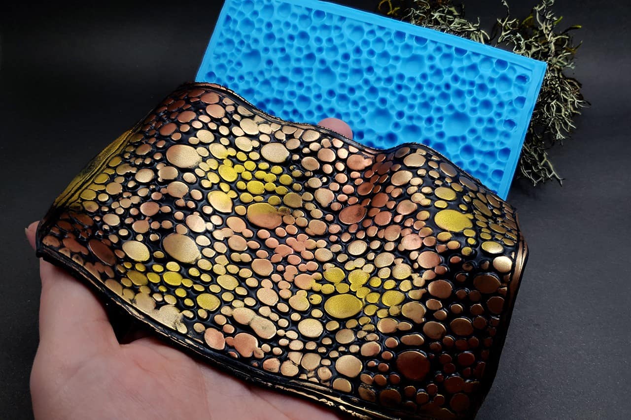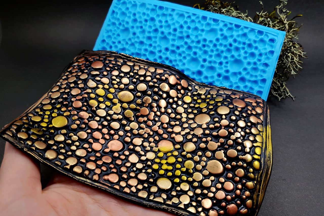 I made this texture from silicone which is flexible and does not require a release agent. It can be baked at a temperature of 150’C and can be used with all brands of polymer clay (preferably recommended a SOFT clay).