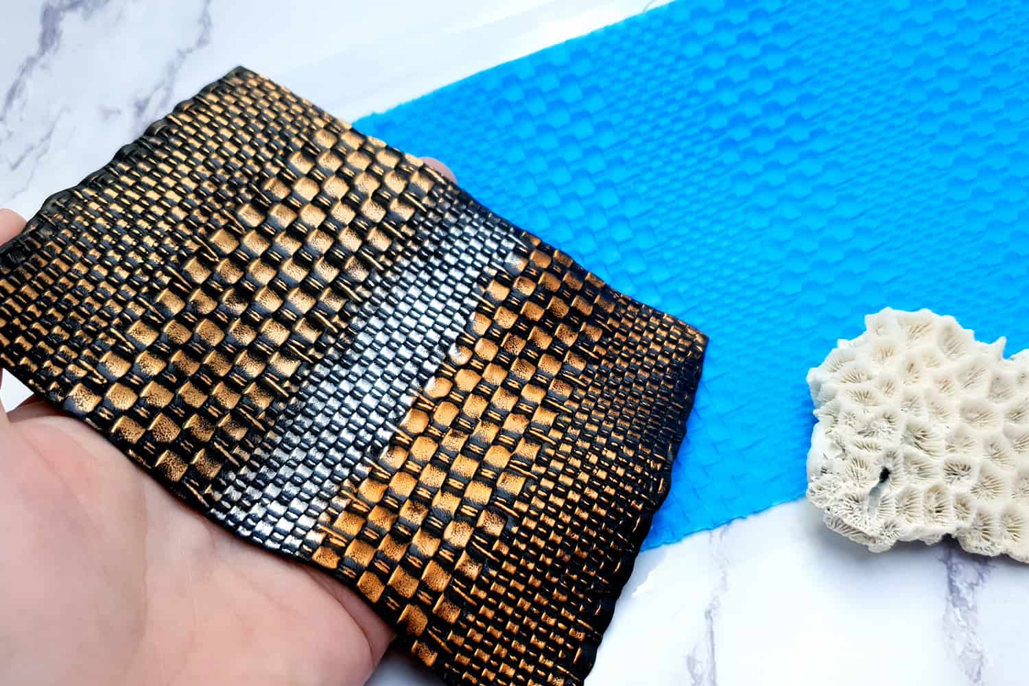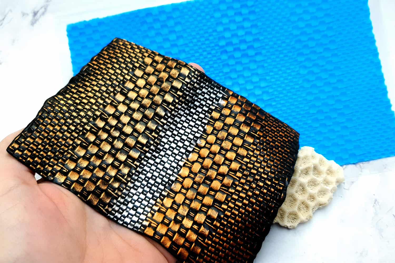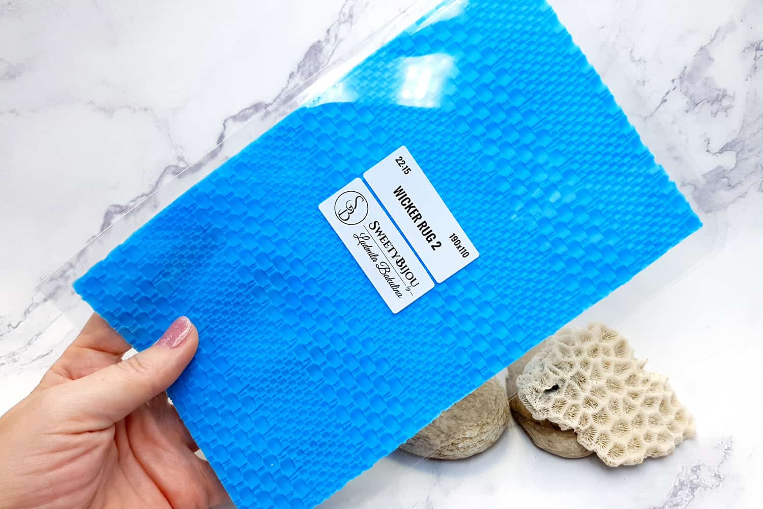Teksturę wykonałam z silikonu, który jest elastyczny i nie wymaga stosowania środka antyadhezyjnego. Można ją wypalać w temperaturze 150'C i stosować ze wszystkimi rodzajami glinek polimerowych (najlepiej zaleca się glinki SOFT).