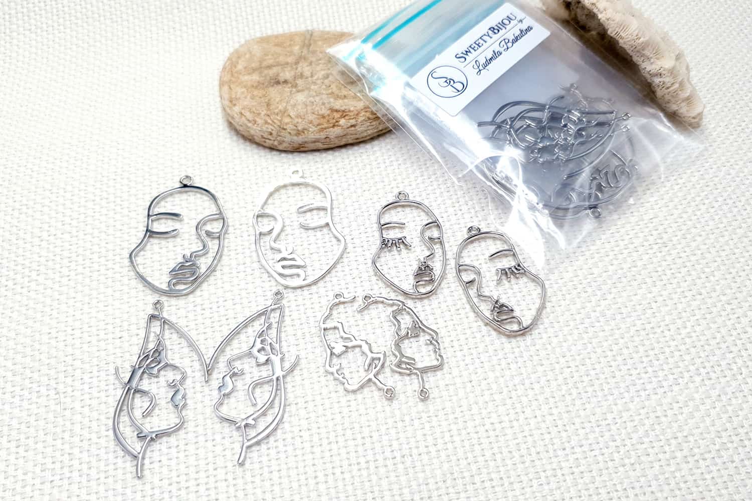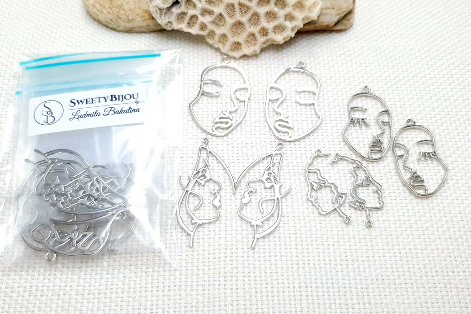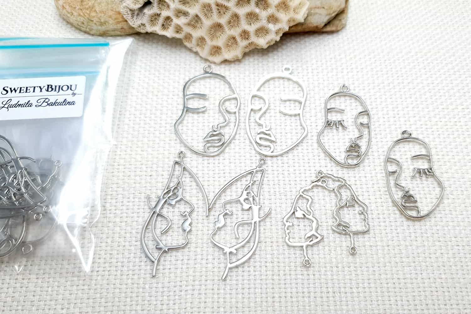 “Rostos – Conjunto de 8 peças de descobertas de joias de metal prateado” – descobertas incomuns de brincos de alta qualidade para suas criações de joias.