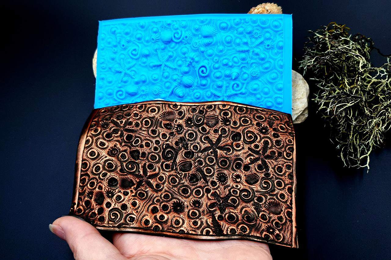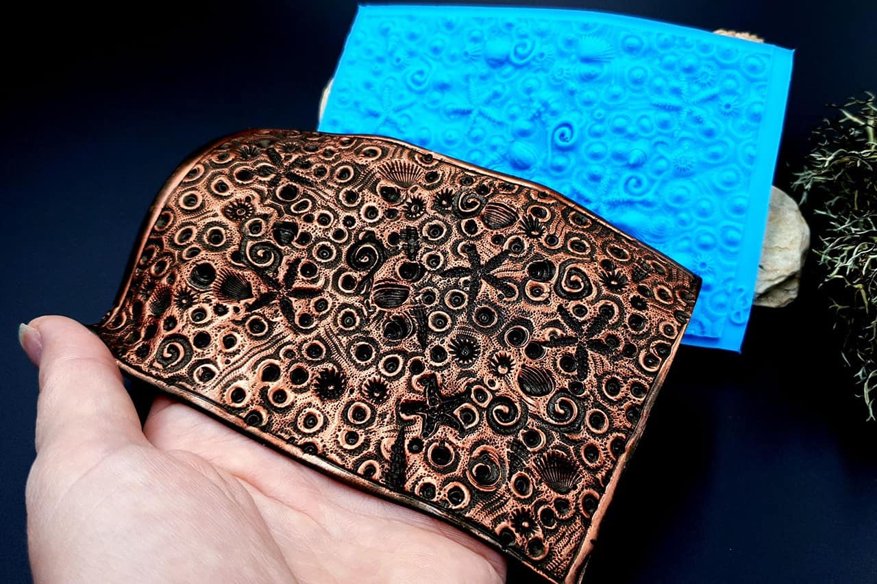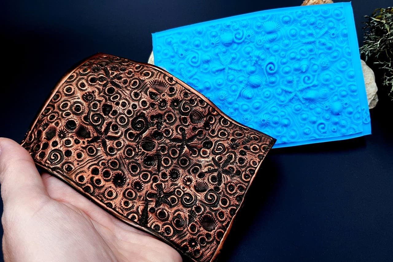 Fiz essa textura de silicone que é flexível e não precisa de desmoldante. Pode ser cozido a uma temperatura de 150'C e pode ser usado com todas as marcas de argila polimérica (recomenda-se de preferência uma argila SOFT).