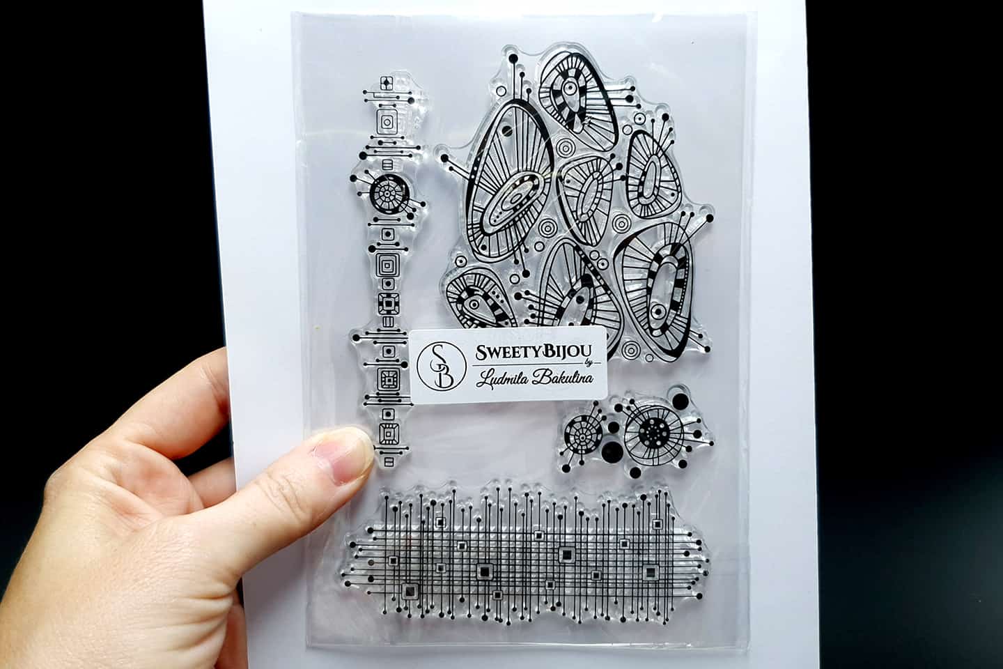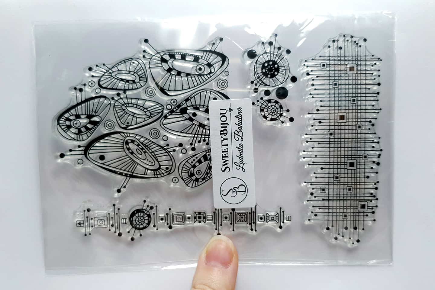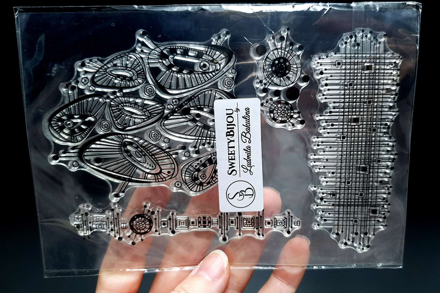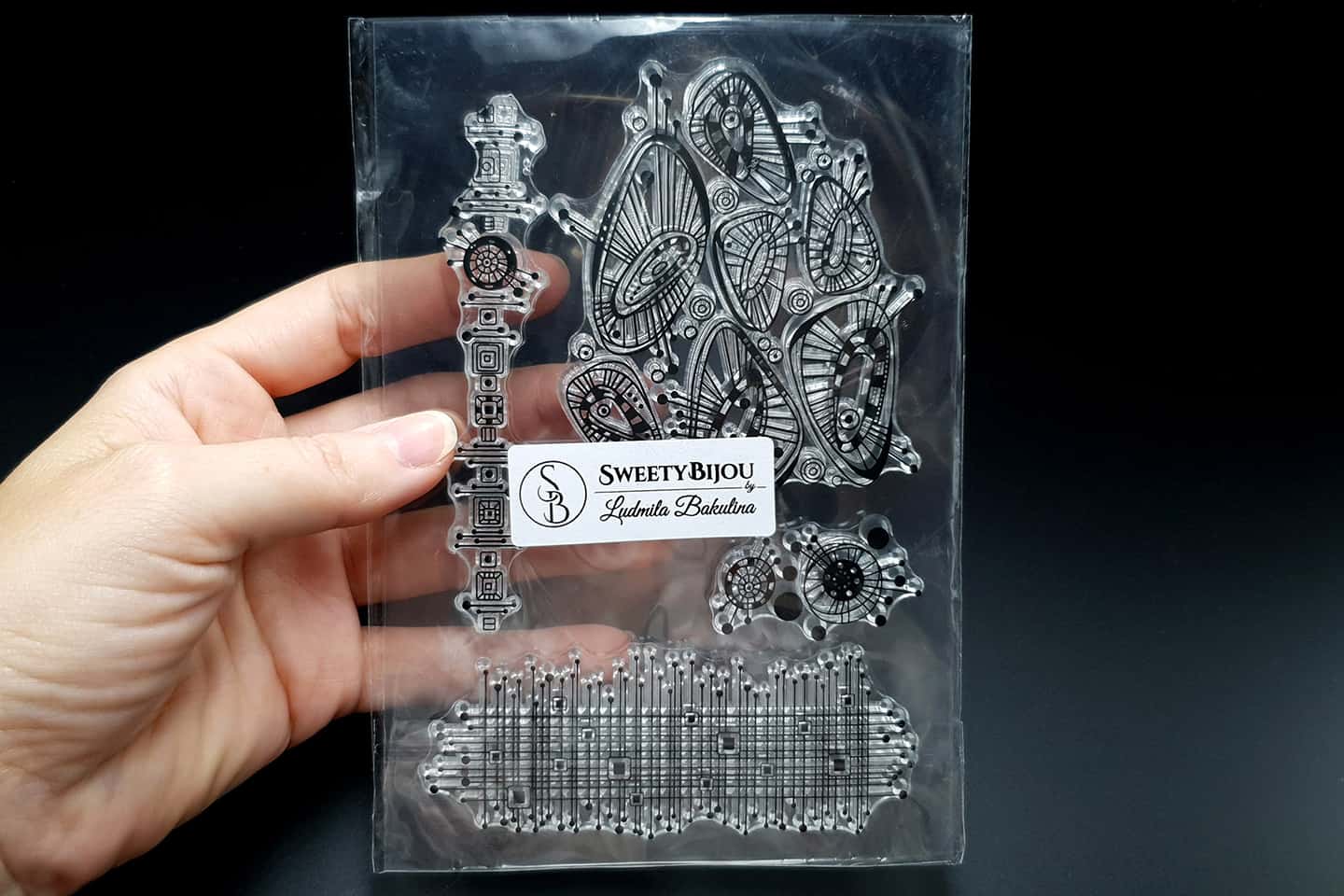 Цей штамп чудово підходить для таких технік, як зміщення слюди, мокуме ґане, скибочки Саттона, тушування та змішана техніка з полімерною глиною.