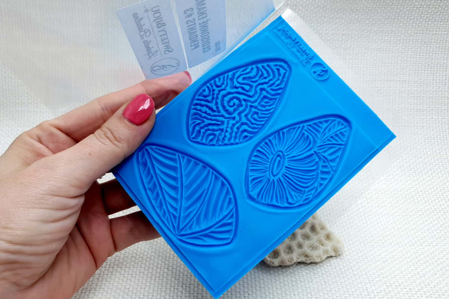 Я зробив цю текстуру з силікону, який є гнучким і не потребує роздільної речовини. Його можна випікати при температурі 150°C і використовувати з усіма марками полімерної глини (бажано рекомендується SOFT).
