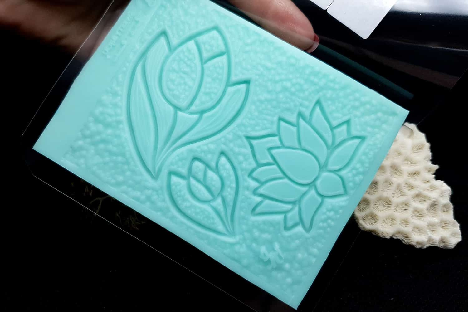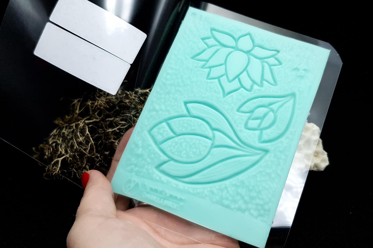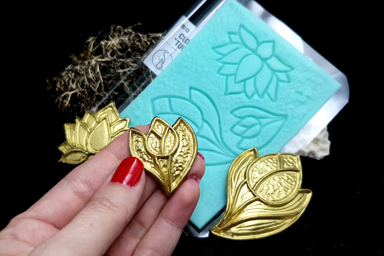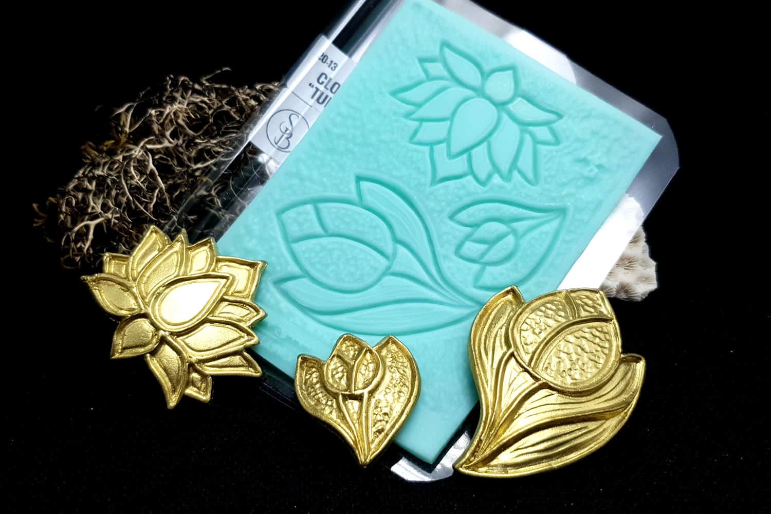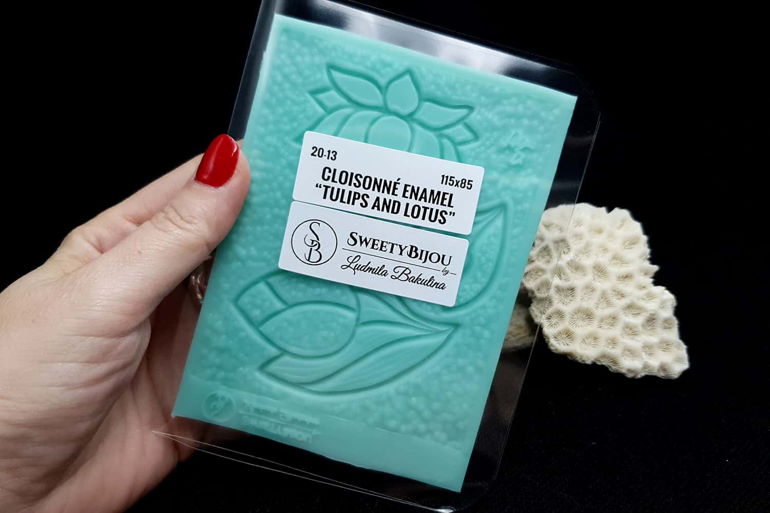 Я зробив цю текстуру з силікону, який є гнучким і не потребує роздільної речовини. Його можна випікати при температурі 150°C і використовувати з усіма марками полімерної глини (бажано рекомендується SOFT).
