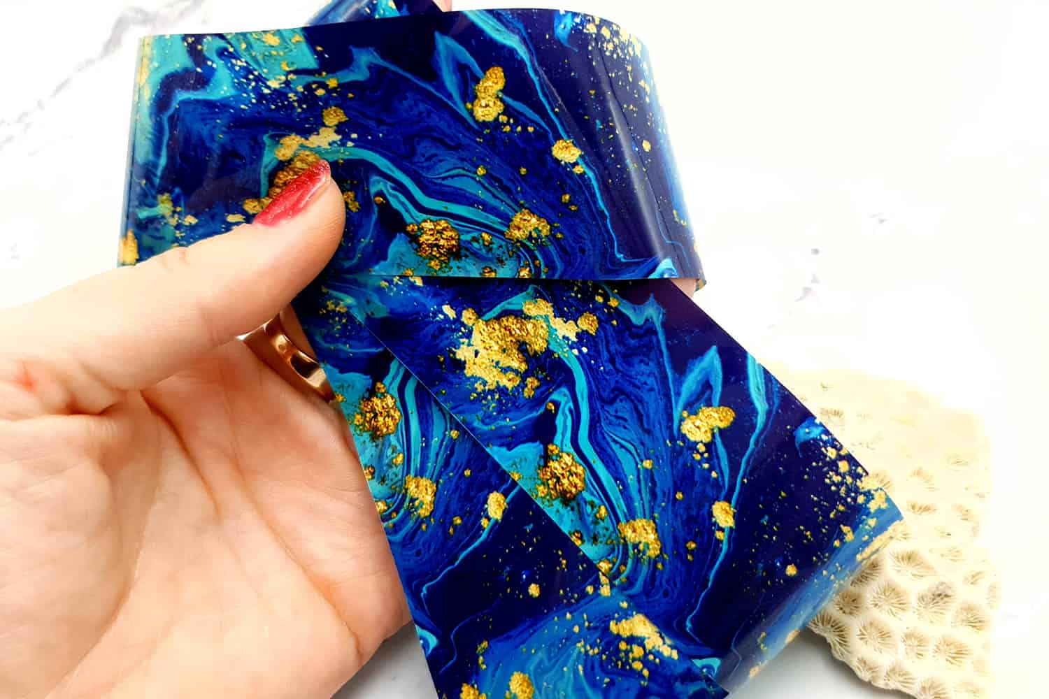 Насичено-синій візерунок плетіння, візерунок фольги для перекладу – фольга є дивовижним матеріалом, який можна легко використовувати в багатьох проектах з полімерної глини. Фольга дає унікальний ефект, оскільки має барвисті, металеві, перламутрові та голографічні ефекти! При використанні на сирій глині – фольга може тріснути, поки глина розтягується, що є дійсно чудовим ефектом.