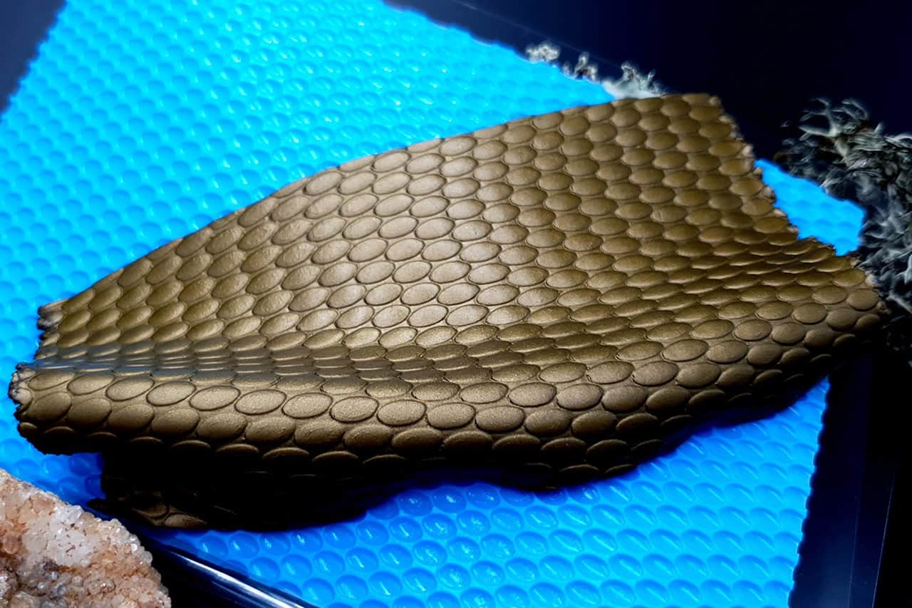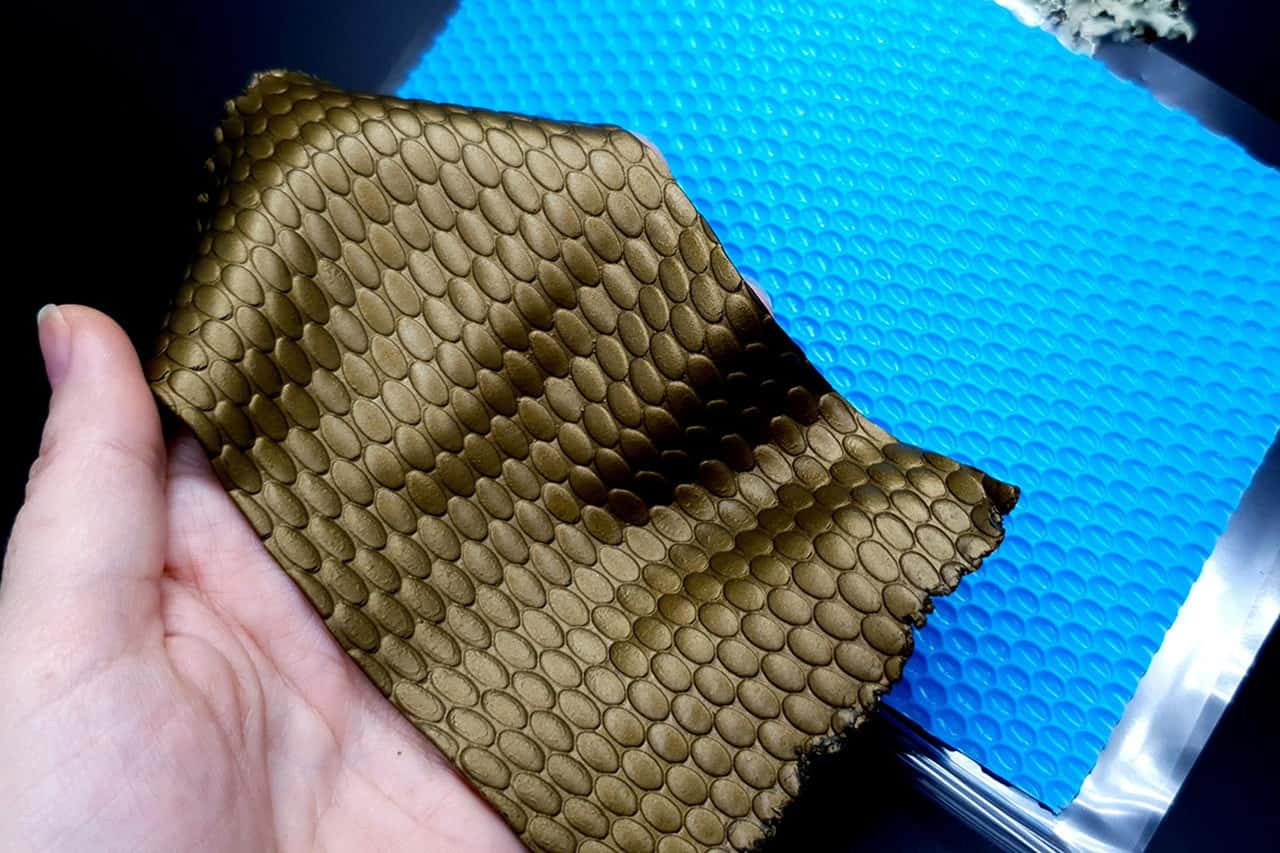 Я зробив цю текстуру з силікону, який є гнучким і не потребує роздільної речовини. Його можна випікати при температурі 150°C і використовувати з усіма марками полімерної глини (бажано рекомендується SOFT).