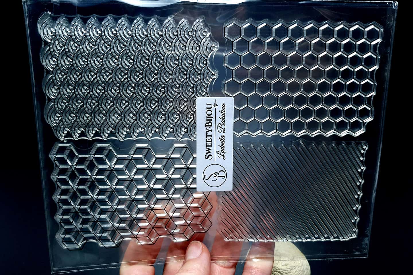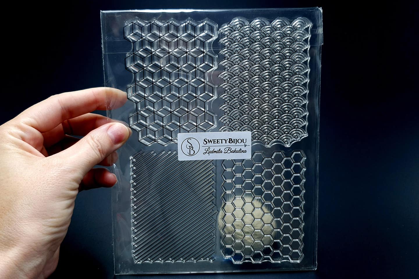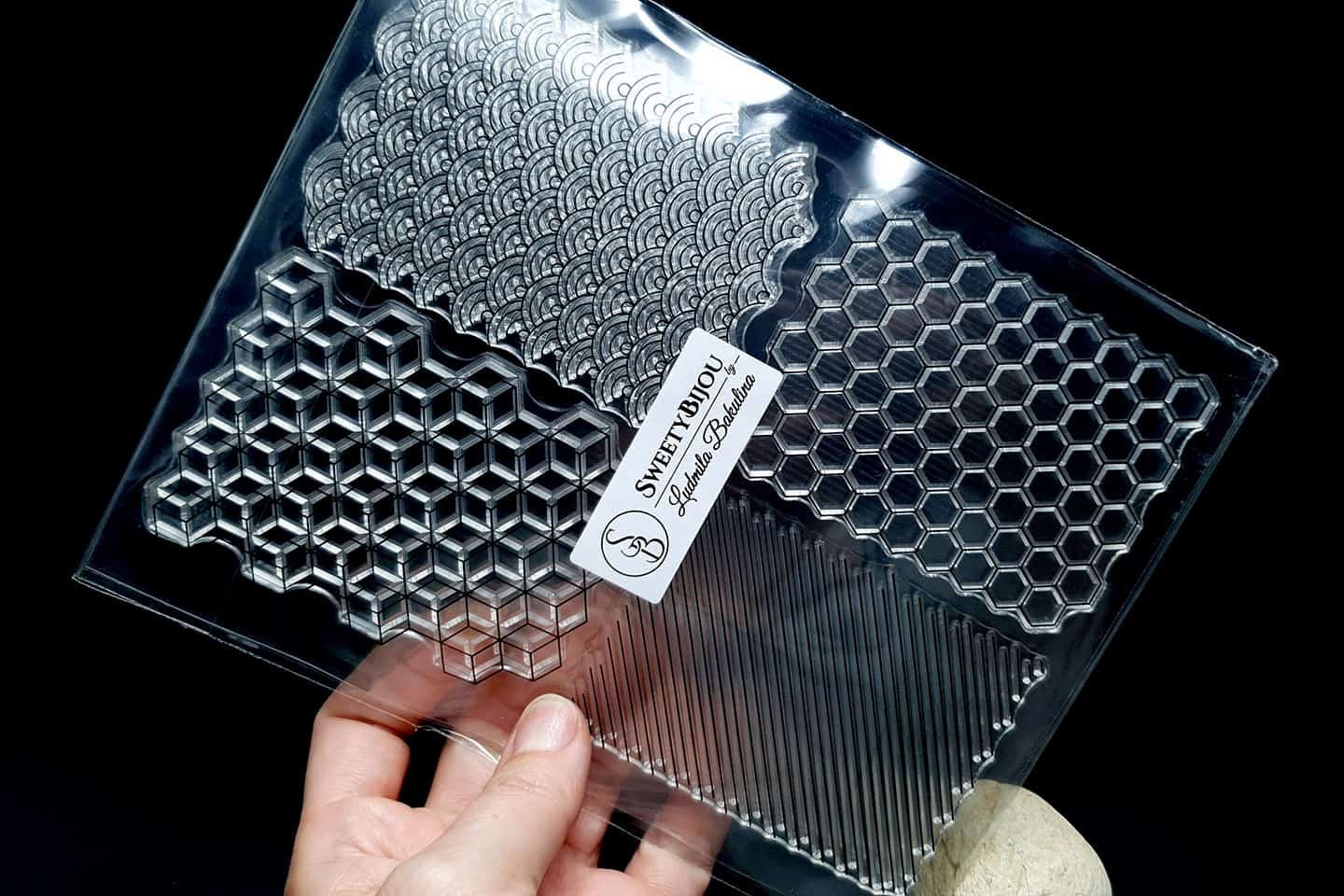 Цей штамп чудово підходить для таких технік, як зміщення слюди, мокуме ґане, скибочки Саттона, тушування та змішана техніка з полімерною глиною.