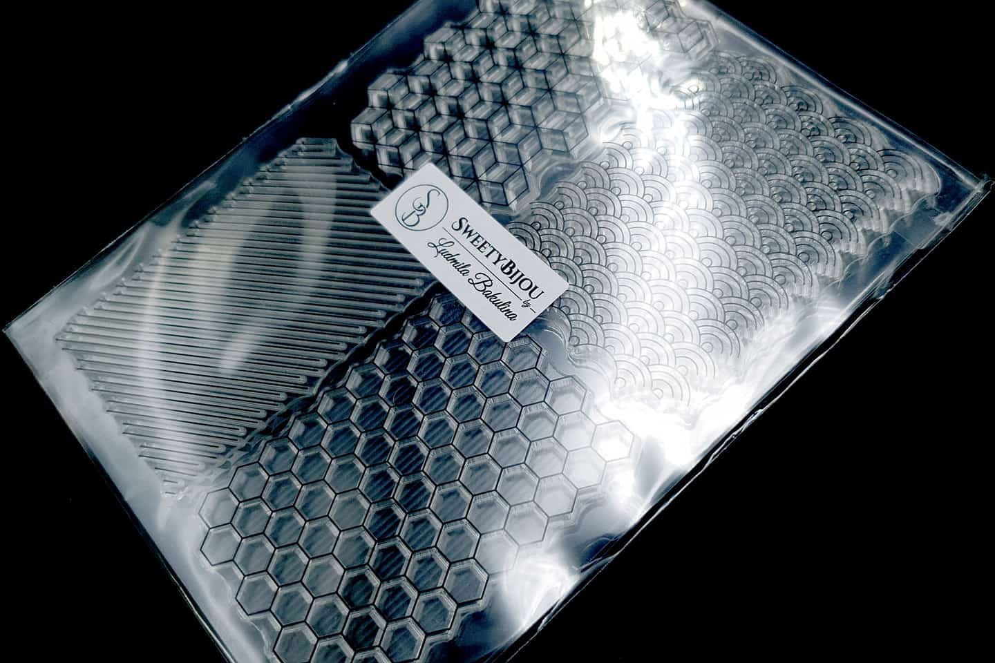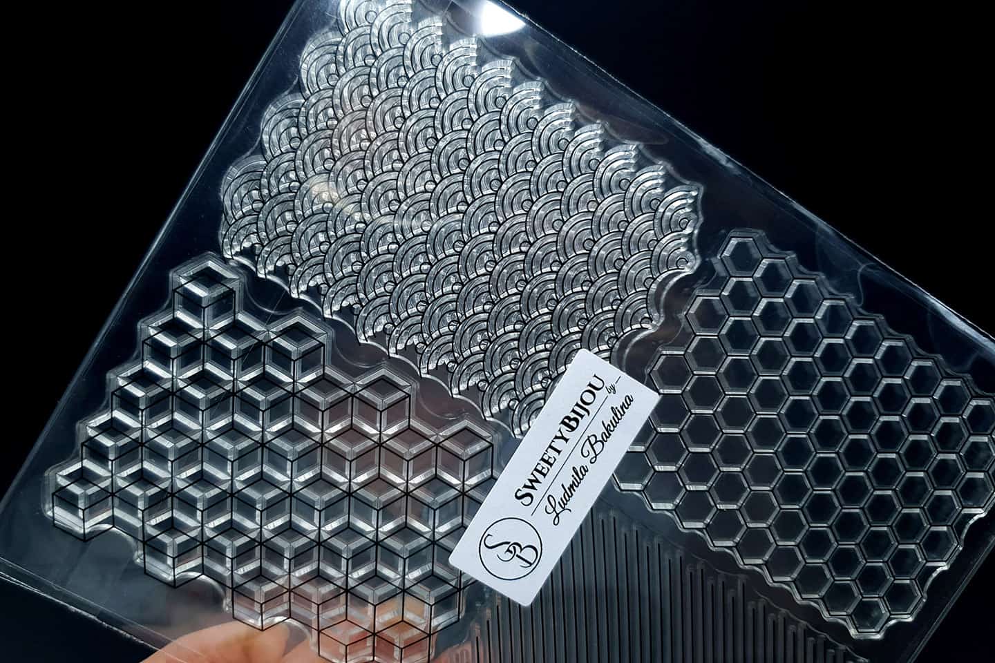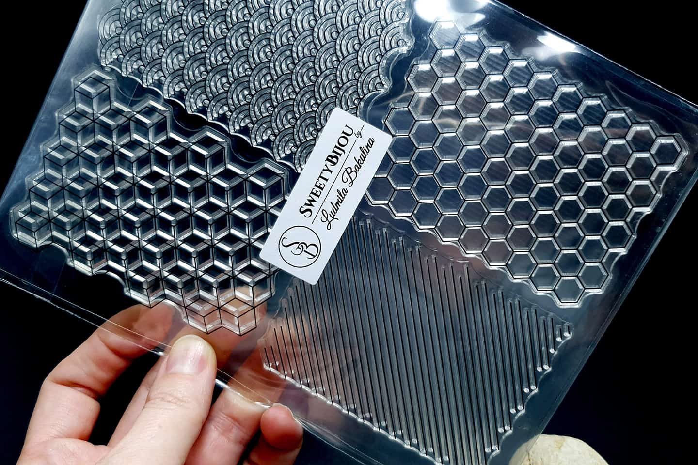Цей штамп чудово підходить для таких технік, як зміщення слюди, мокуме ґане, скибочки Саттона, тушування та змішана техніка з полімерною глиною.