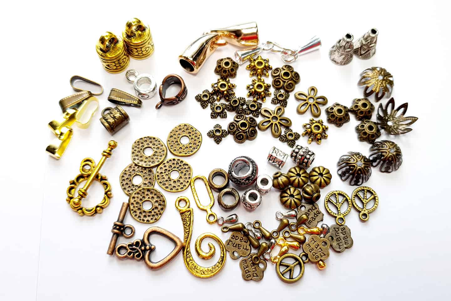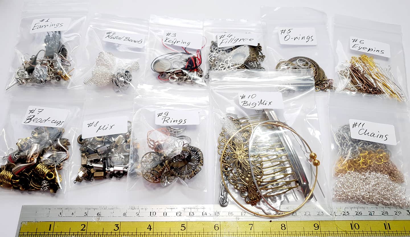 У моїх «Сумках для смаколиків для початківців» є все необхідне для виготовлення вашого першого біжу, як-от підвіски, каблучки, сережки, браслети, брошки, брелоки, аксесуари для волосся та навіть закладка! Існує цілий набір з 11 міні-змішаних наборів із шпильками, металевими намистинами, гофрами, ущільнювальними кільцями, ланцюжками, основами для кільця, основами для брошок, основами аксесуарів для волосся, чашками для намистин, кінцевими чашками, сережками, браслетами, філігранними виробами та набагато більше!