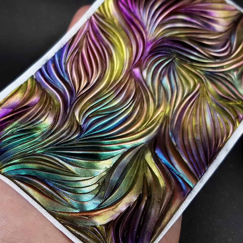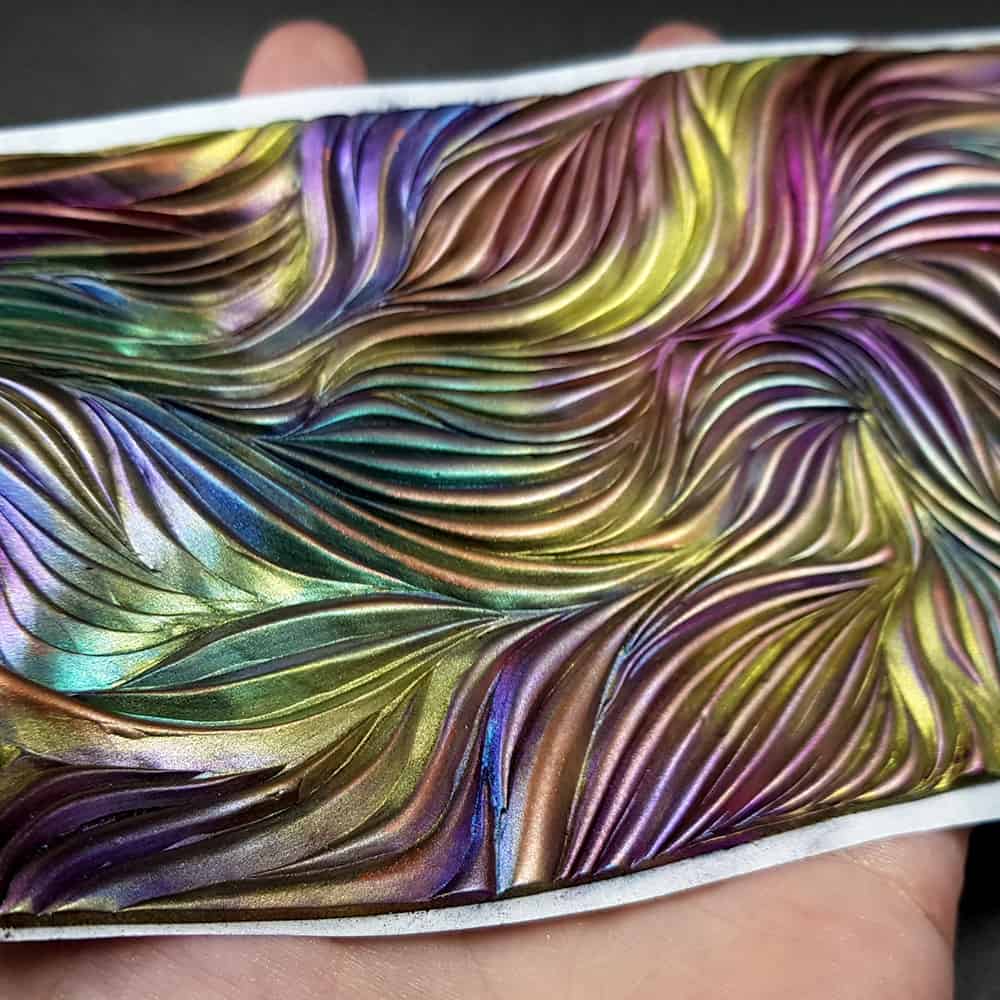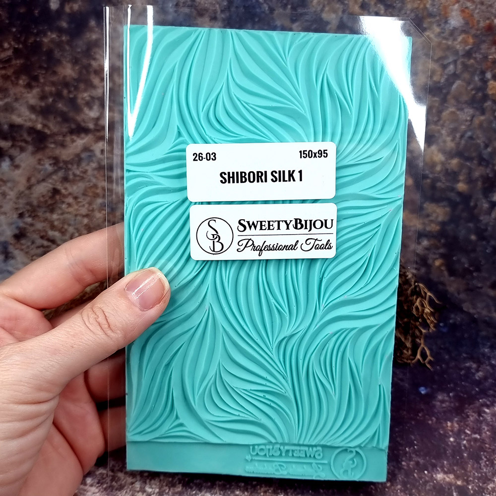 Я зробив цю текстуру з силікону, який є гнучким і не потребує роздільної речовини. Його можна випікати при температурі 150°C і використовувати з усіма марками полімерної глини (бажано рекомендується SOFT).