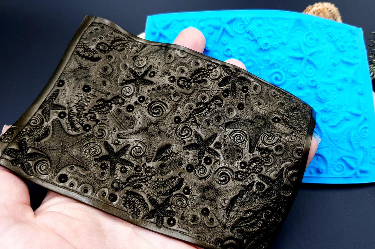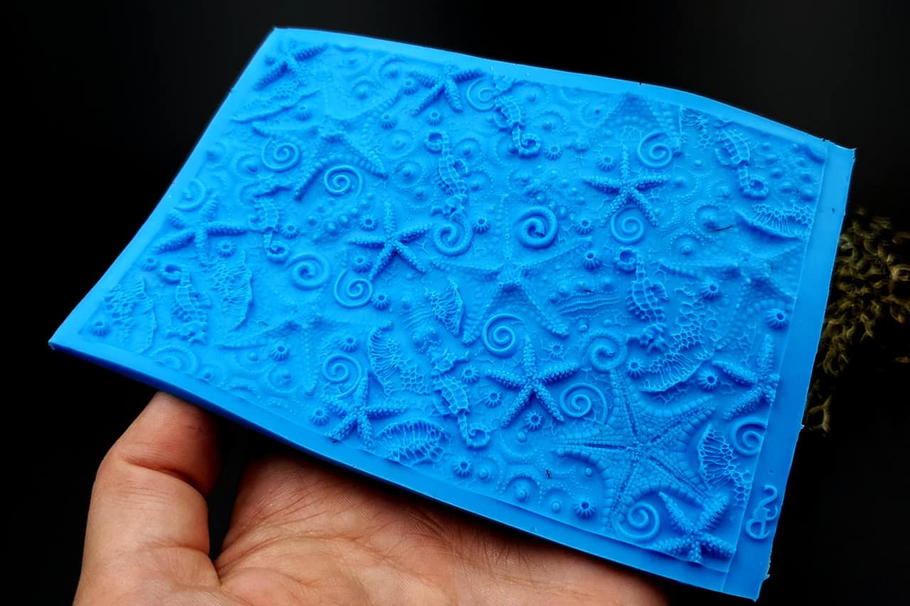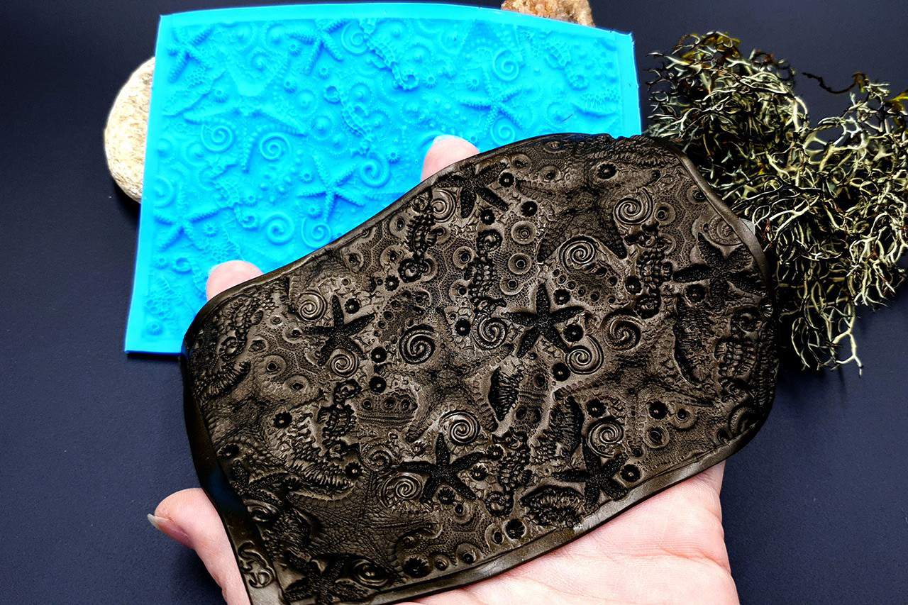 Я зробив цю текстуру з силікону, який є гнучким і не потребує роздільної речовини. Його можна випікати при температурі 150°C і використовувати з усіма марками полімерної глини (бажано рекомендується SOFT).