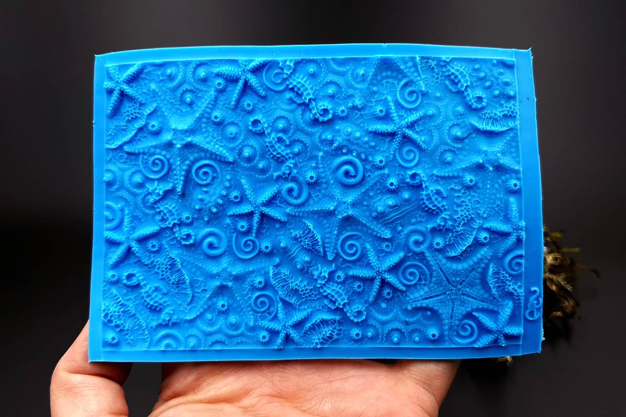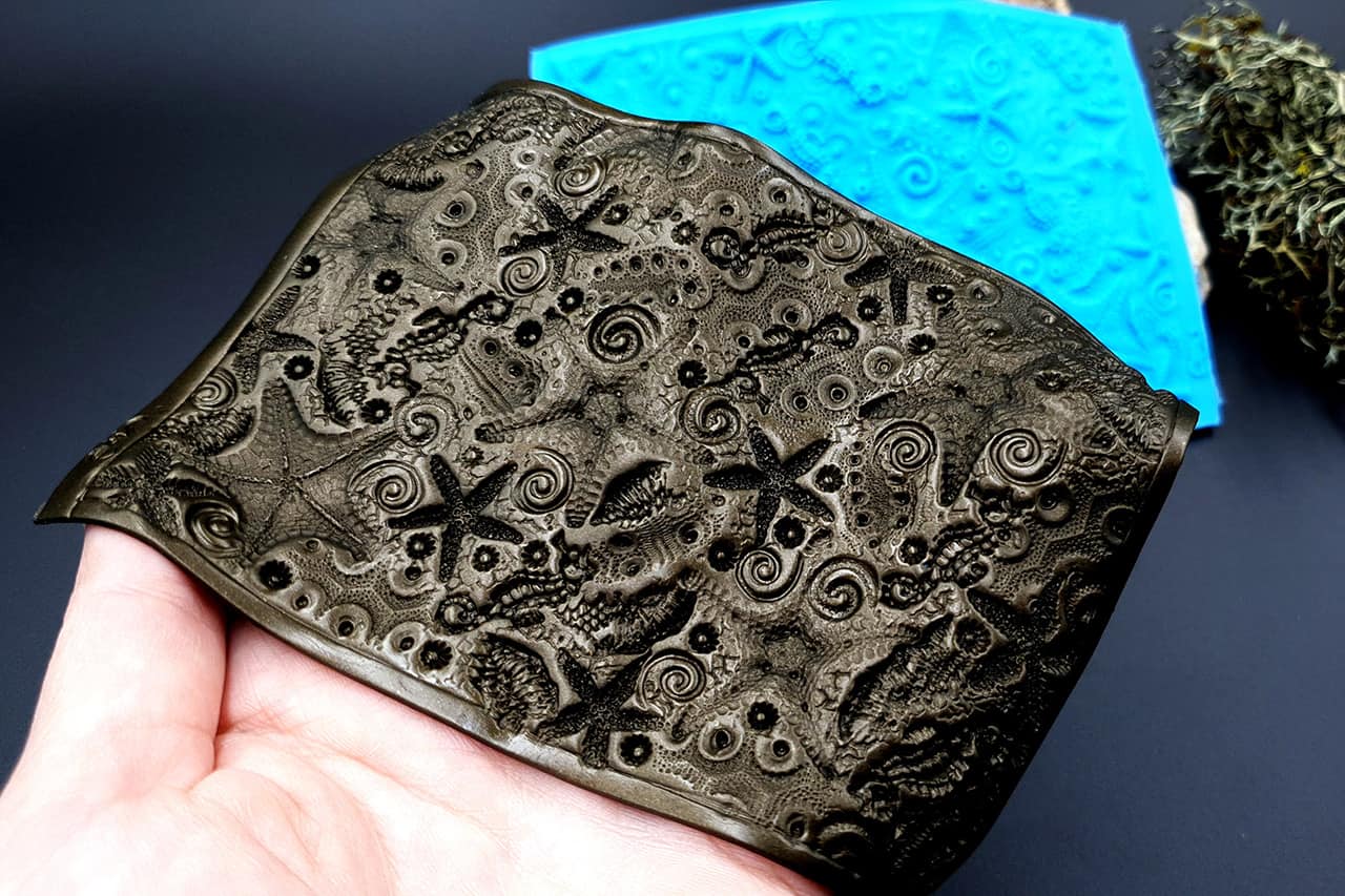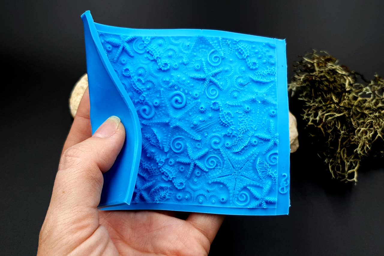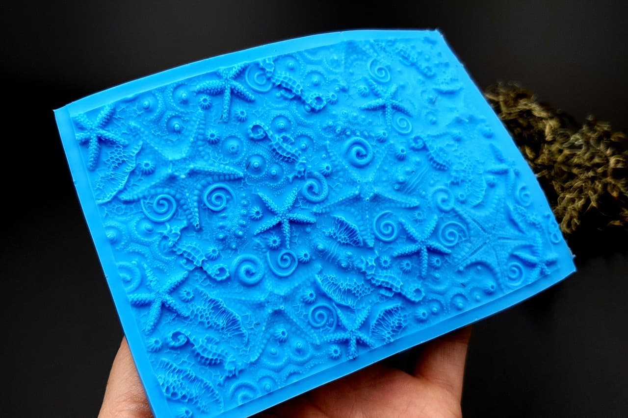 Я зробив цю текстуру з силікону, який є гнучким і не потребує роздільної речовини. Його можна випікати при температурі 150°C і використовувати з усіма марками полімерної глини (бажано рекомендується SOFT).