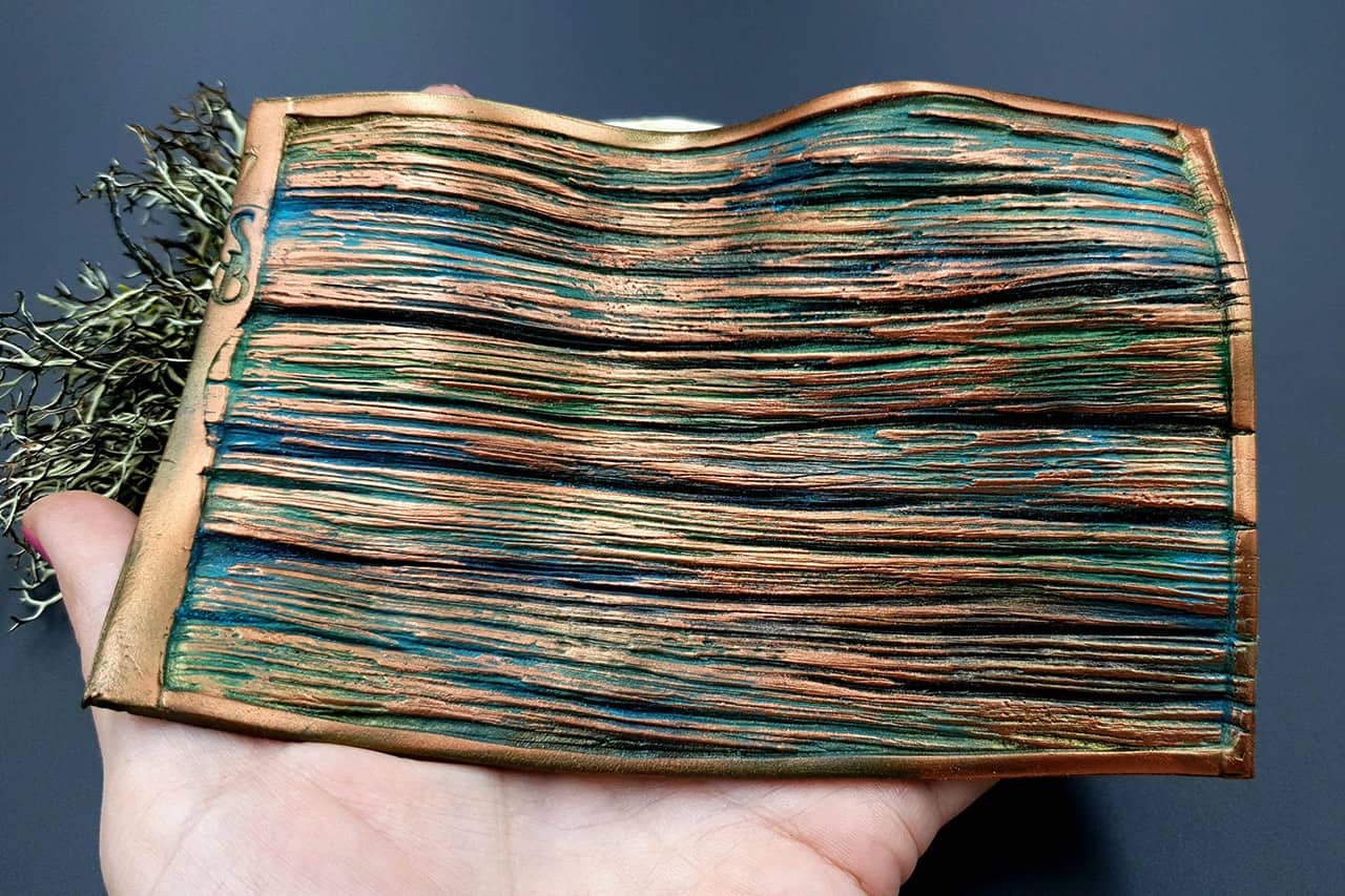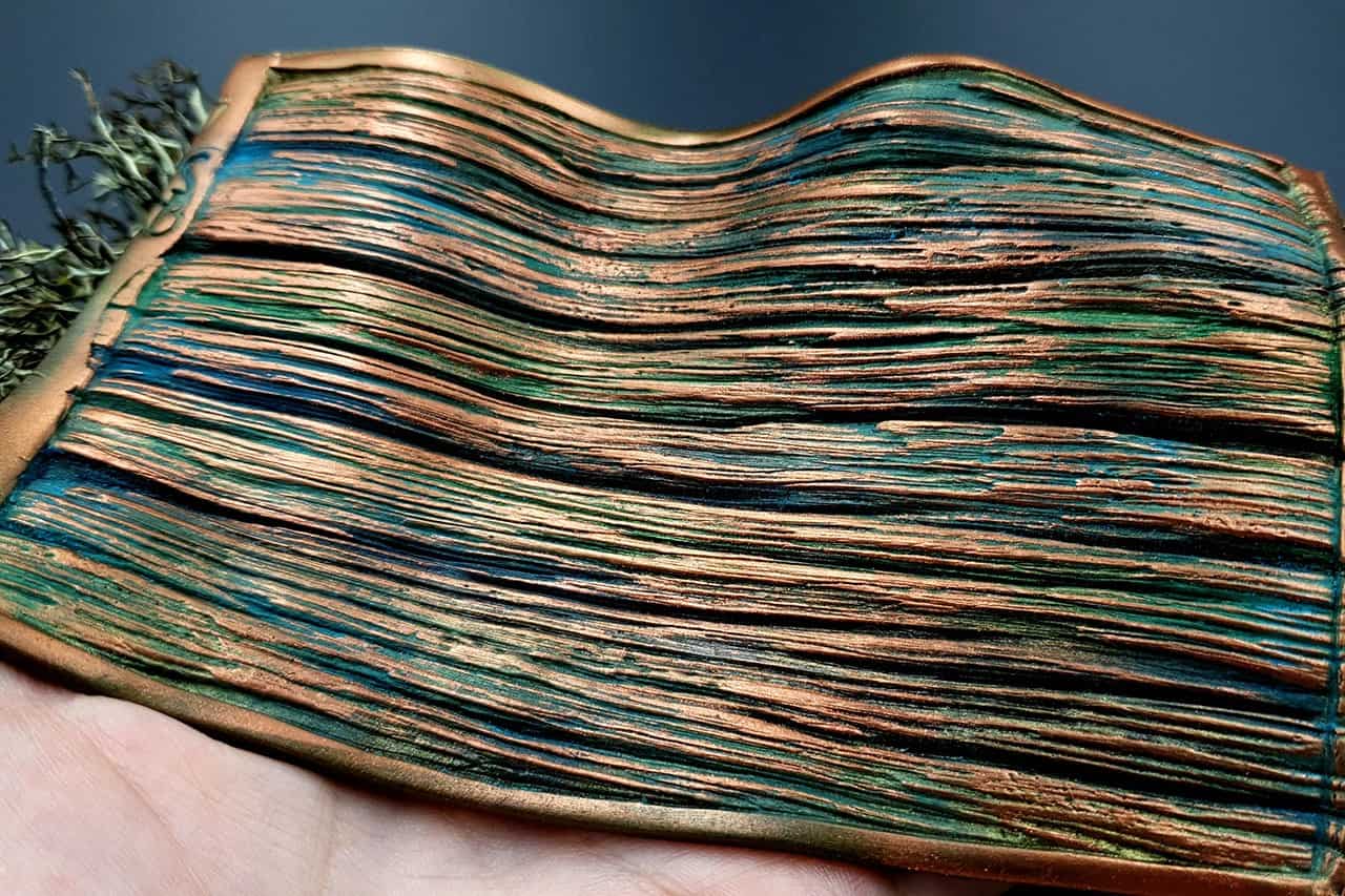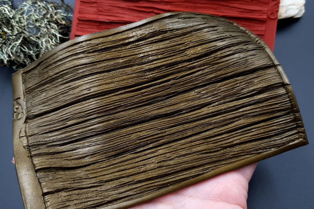 Я зробив цю текстуру з силікону, який є гнучким і не потребує роздільної речовини. Його можна випікати при температурі 150°C і використовувати з усіма марками полімерної глини (бажано рекомендується SOFT).
