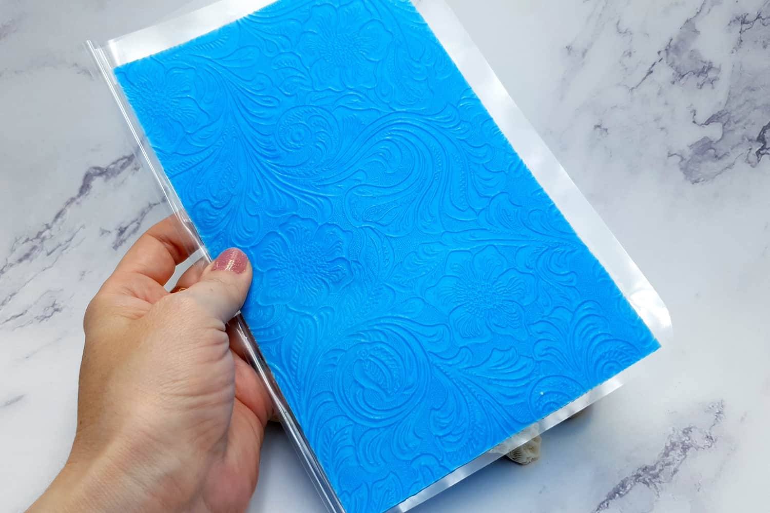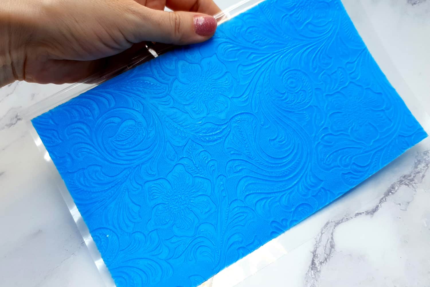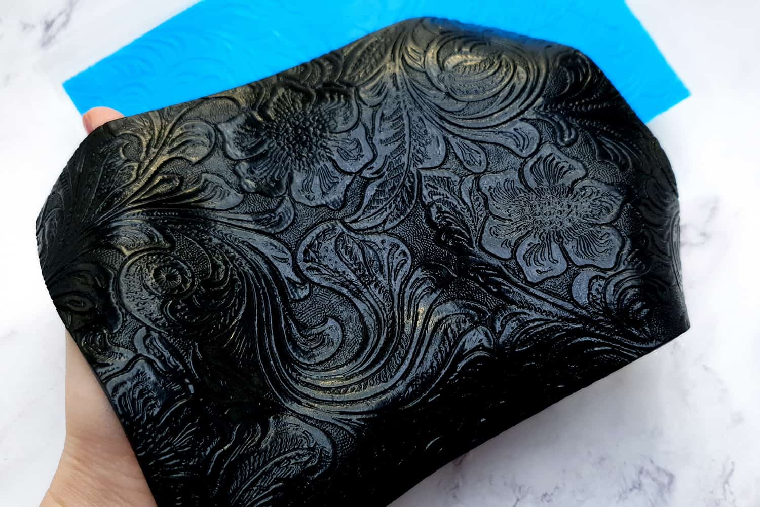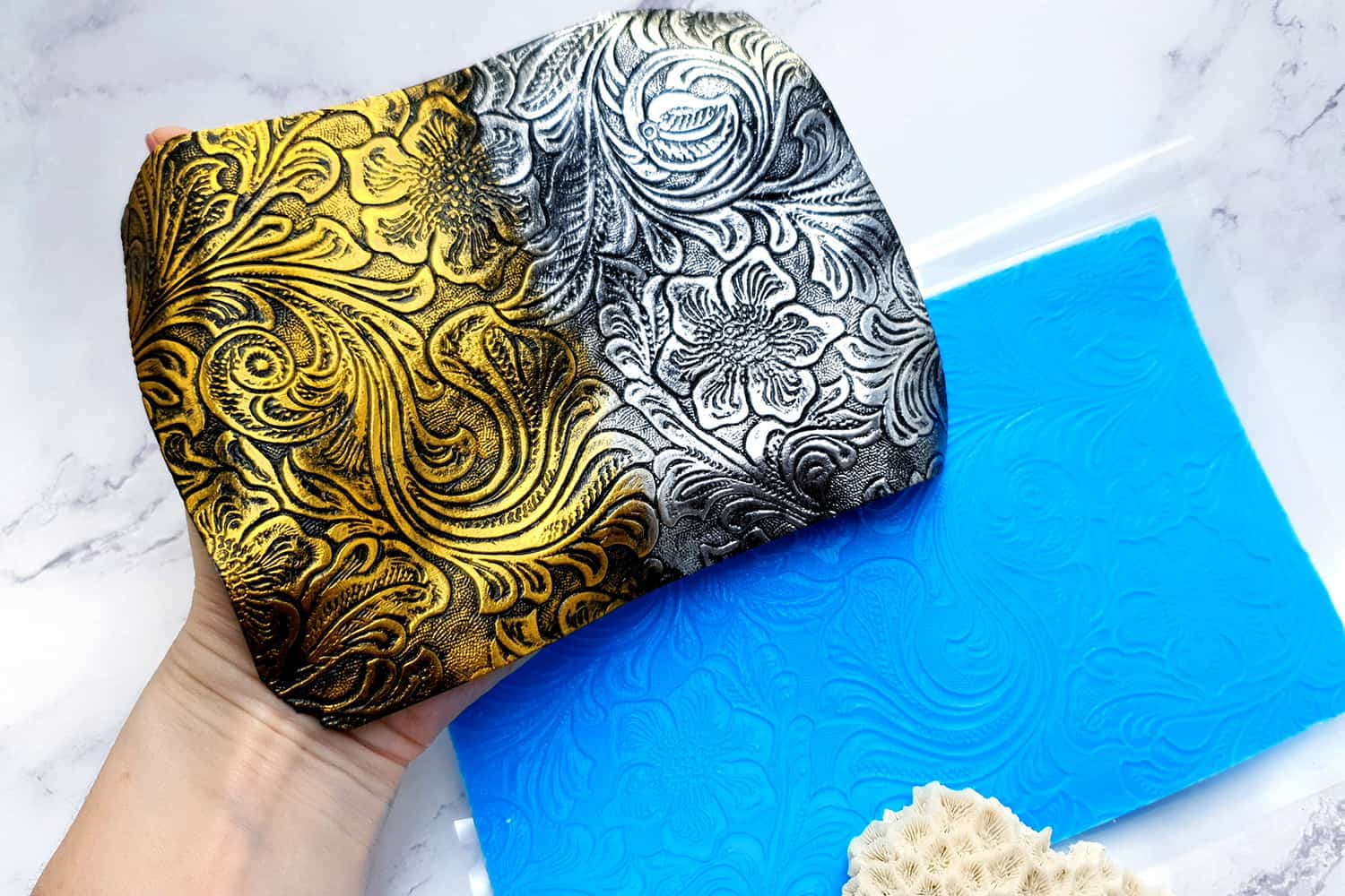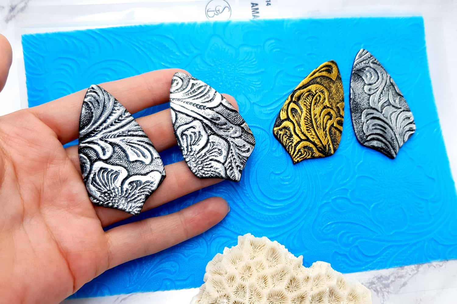 Я зробив цю текстуру з силікону, який є гнучким і не потребує роздільної речовини. Його можна випікати при температурі 150°C і використовувати з усіма марками полімерної глини (бажано рекомендується SOFT).