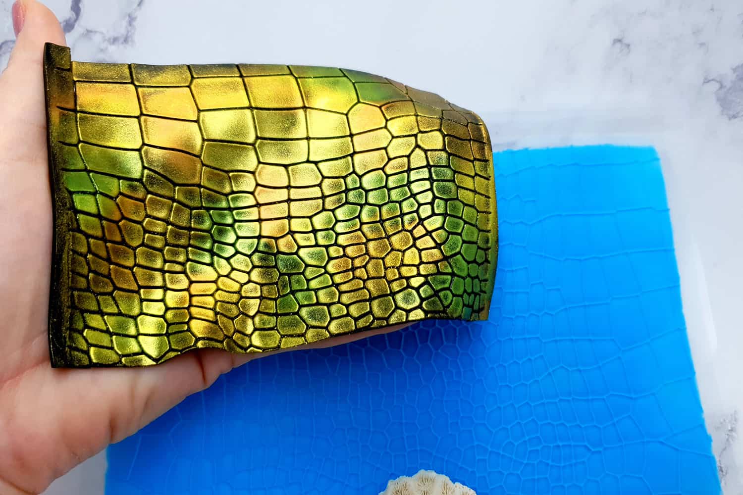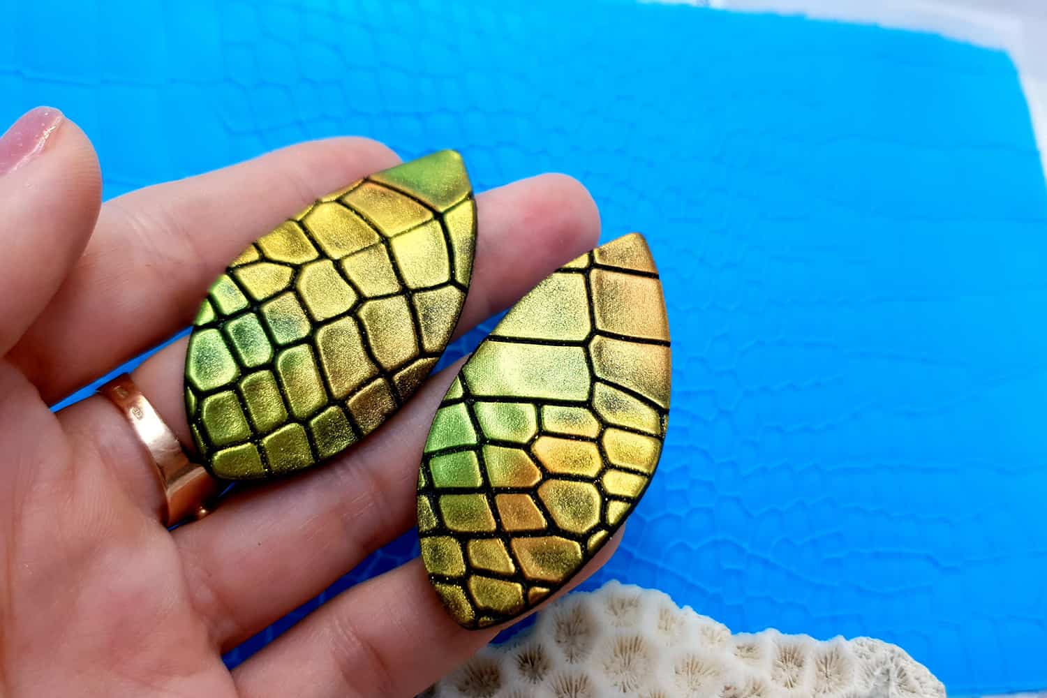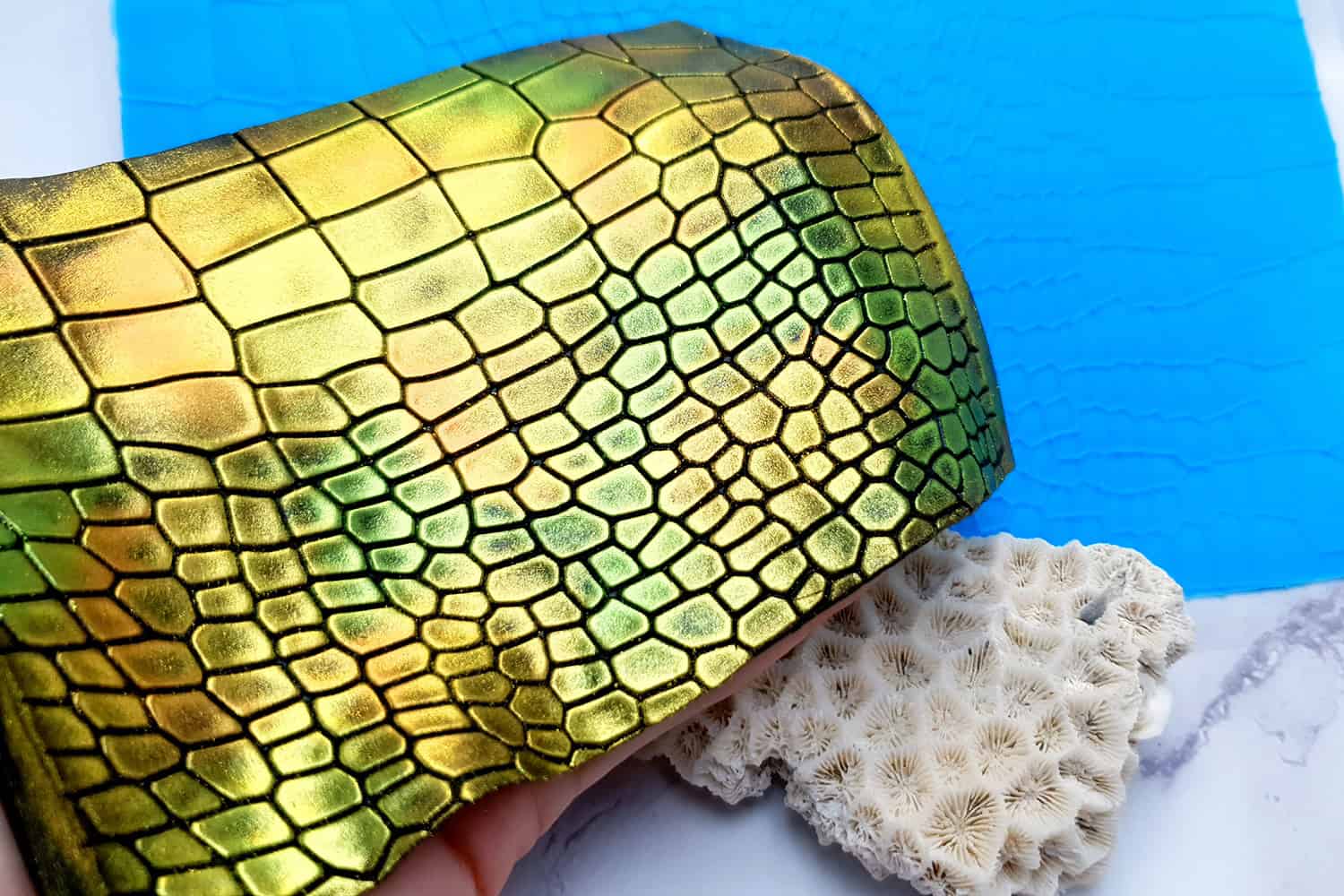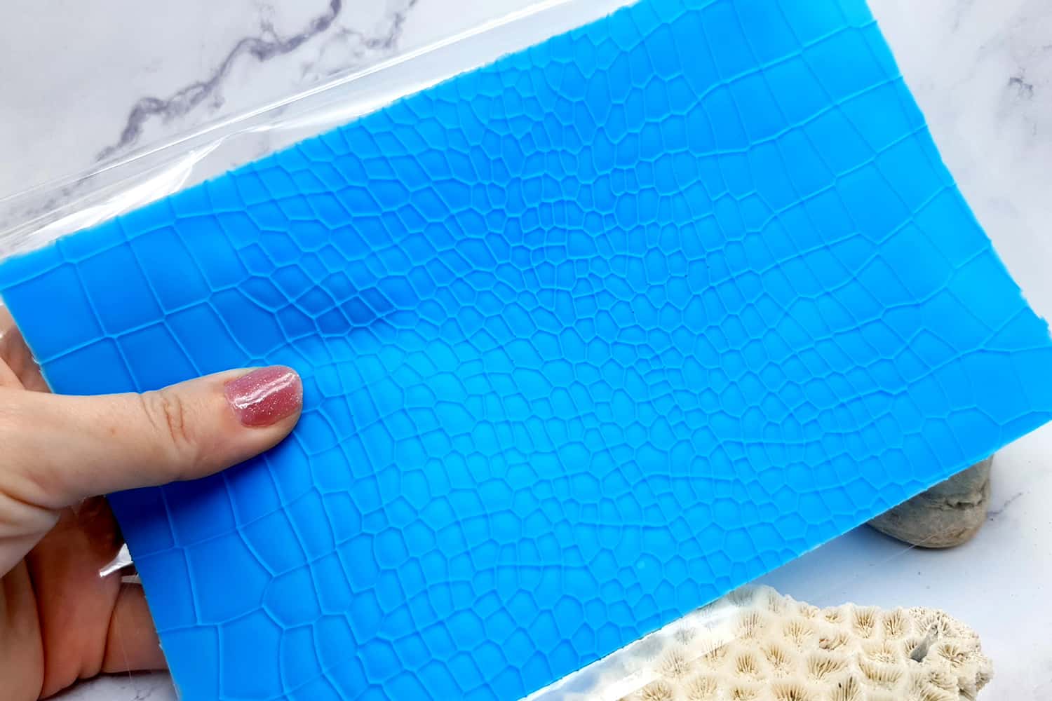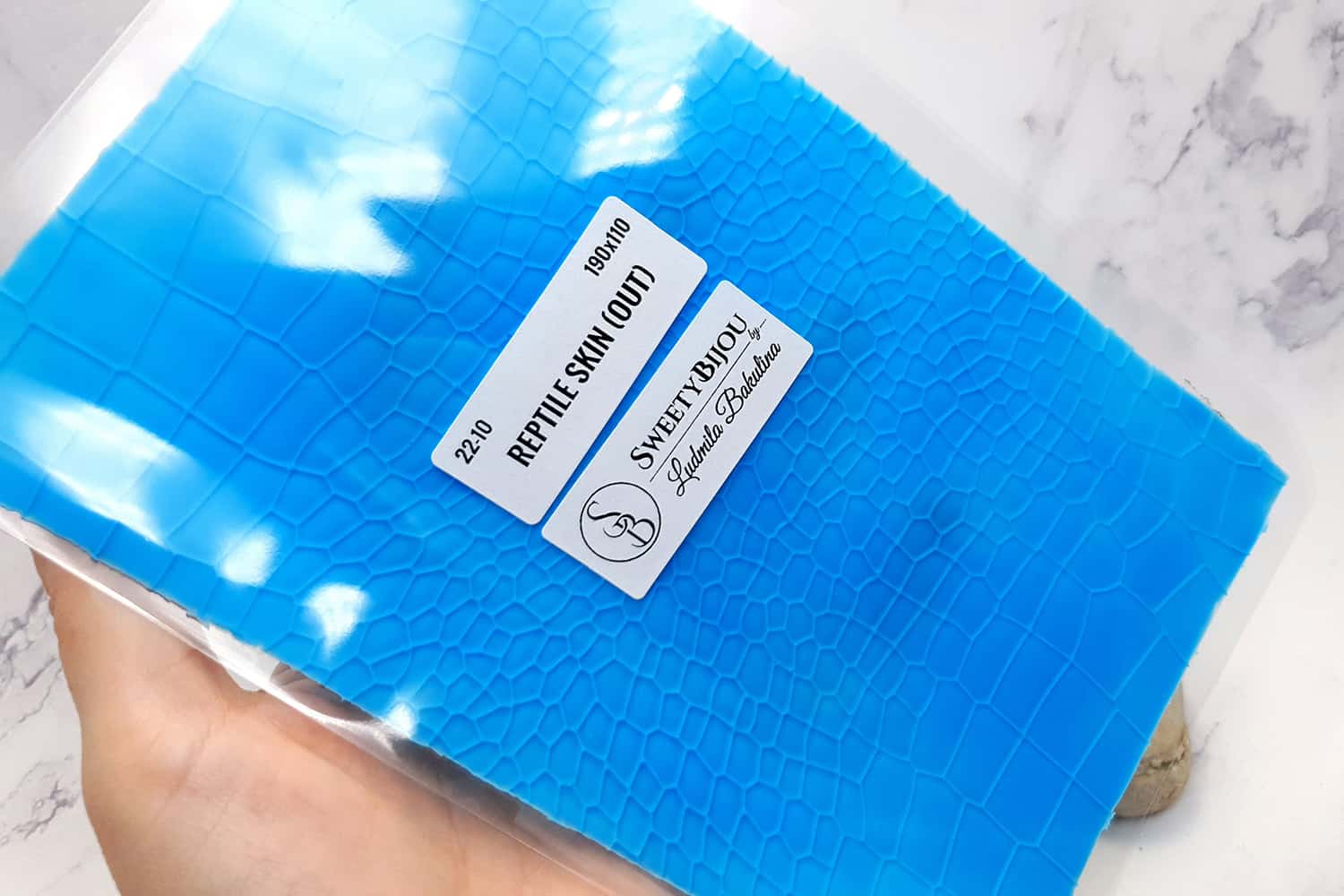 Я зробив цю текстуру з силікону, який є гнучким і не потребує роздільної речовини. Його можна випікати при температурі 150°C і використовувати з усіма марками полімерної глини (бажано рекомендується SOFT).