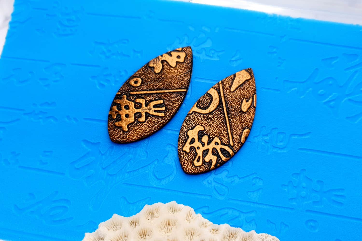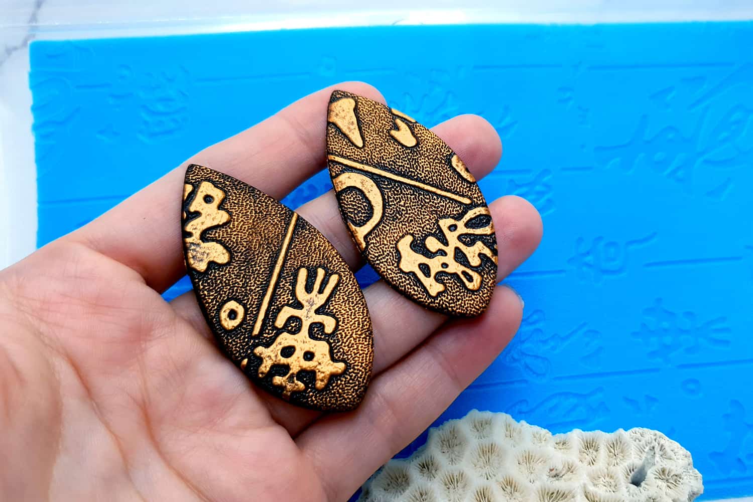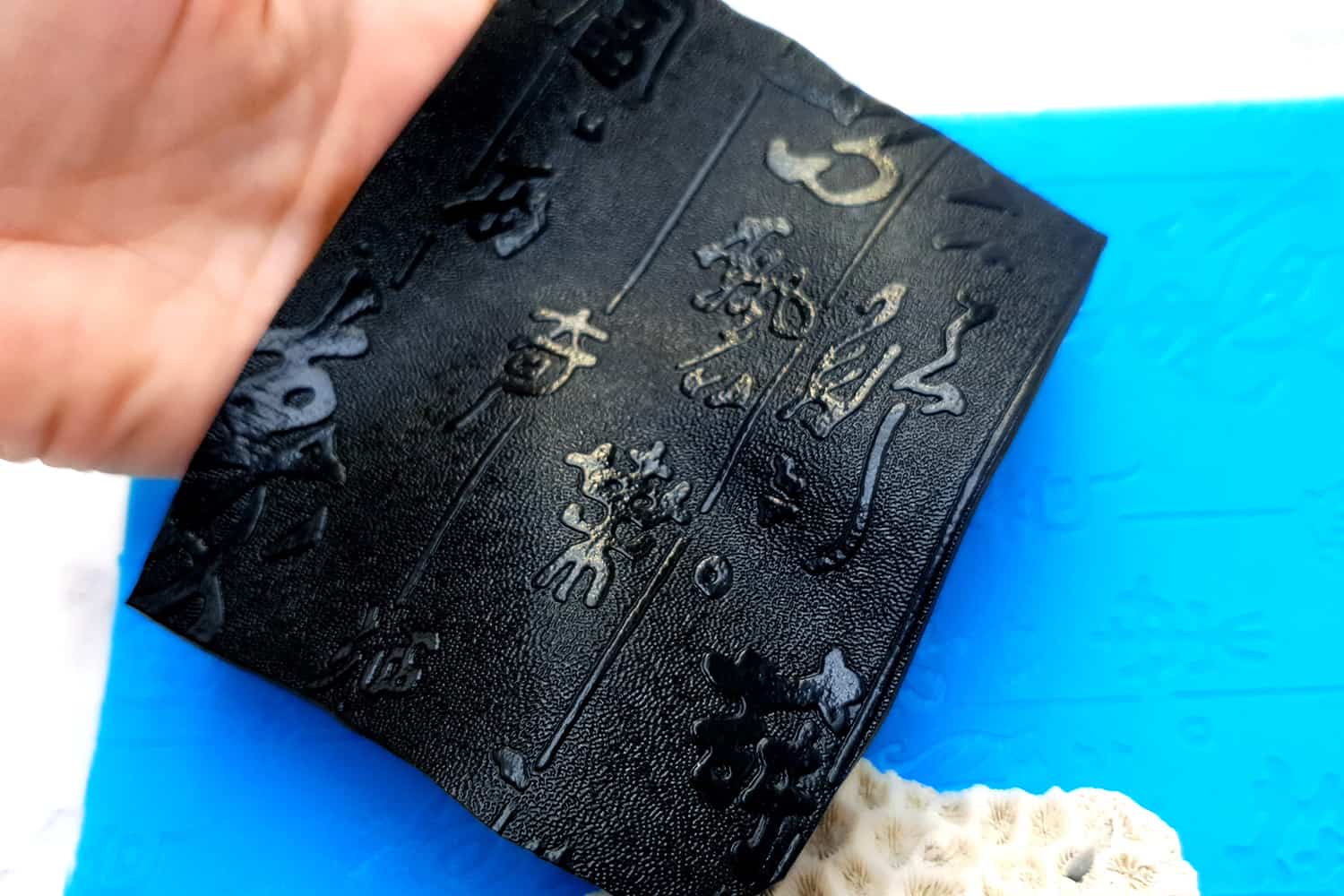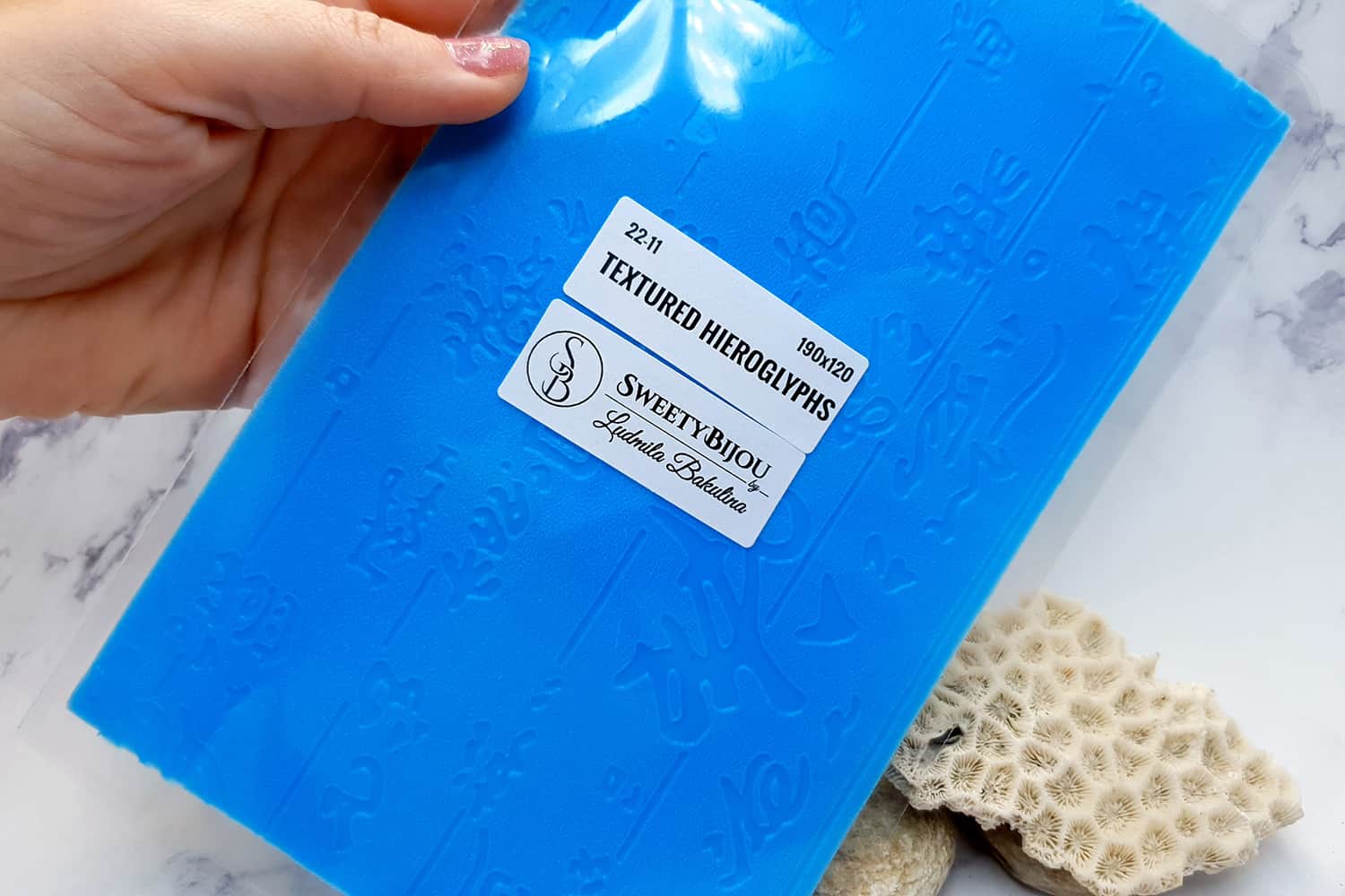 Я зробив цю текстуру з силікону, який є гнучким і не потребує роздільної речовини. Його можна випікати при температурі 150°C і використовувати з усіма марками полімерної глини (бажано рекомендується SOFT).