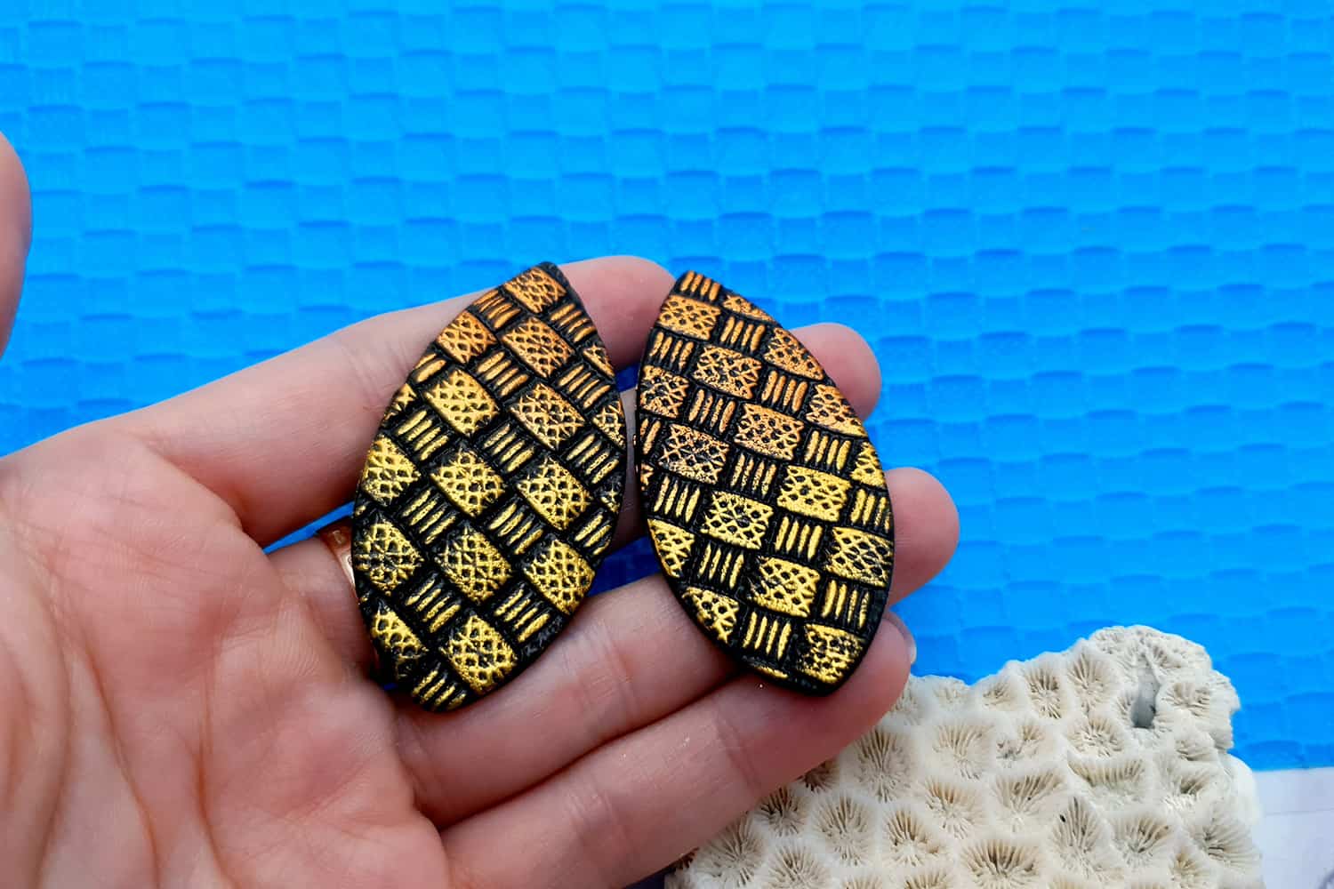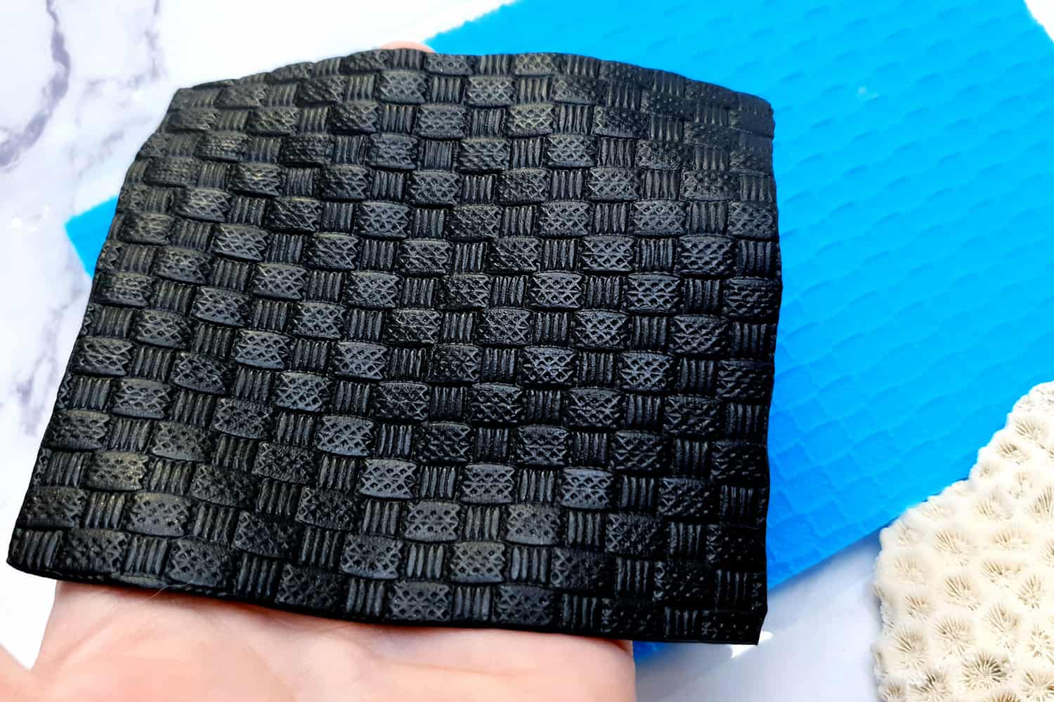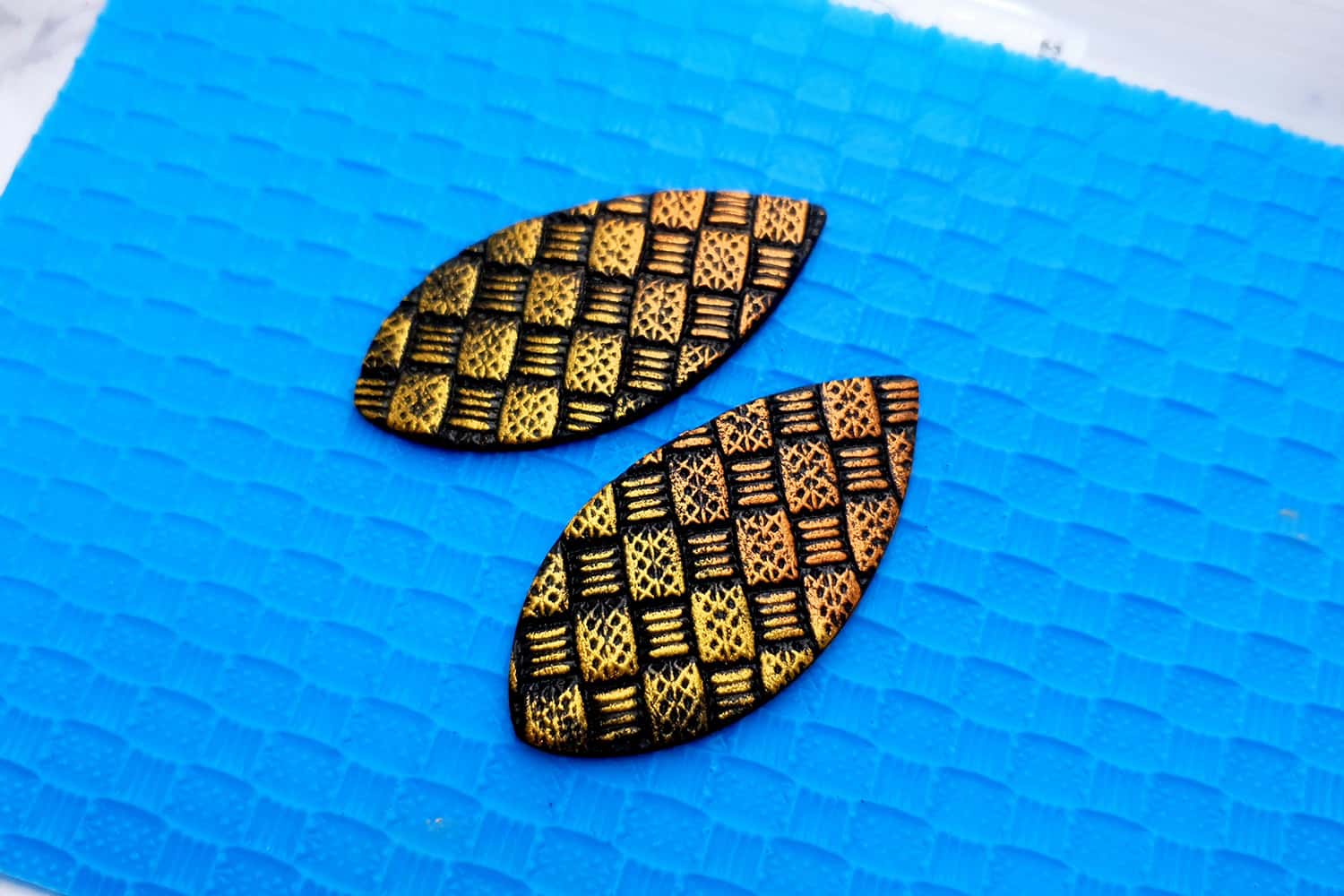 Я зробив цю текстуру з силікону, який є гнучким і не потребує роздільної речовини. Його можна випікати при температурі 150°C і використовувати з усіма марками полімерної глини (бажано рекомендується SOFT).