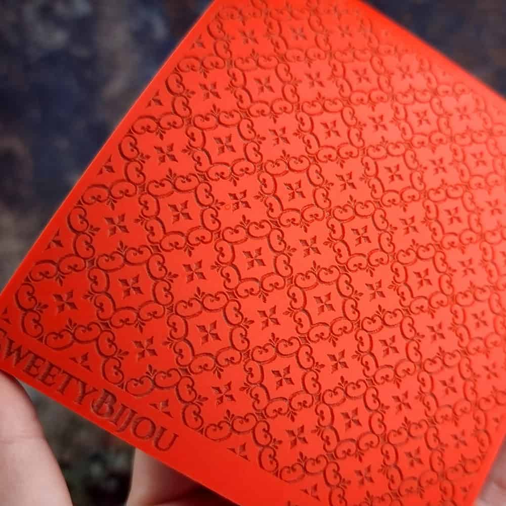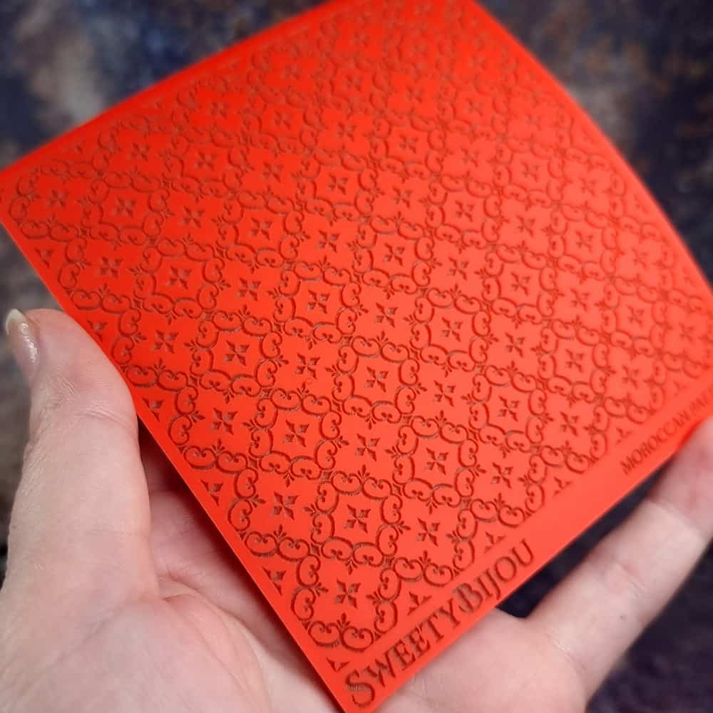 Гумовий лист має найвищу якість, гарантуючи, що кожен відбиток на полімері або металевій глині буде чітким і деталізованим, дозволяючи виробникам ювелірних виробів виготовляти вироби зі складним і декоративним дизайном поверхні. Повторюваний візерунок, схожий на мереживо, ідеально підходить для створення витончених, привабливих предметів, які відтворюють розкіш і містику марокканської естетики.
