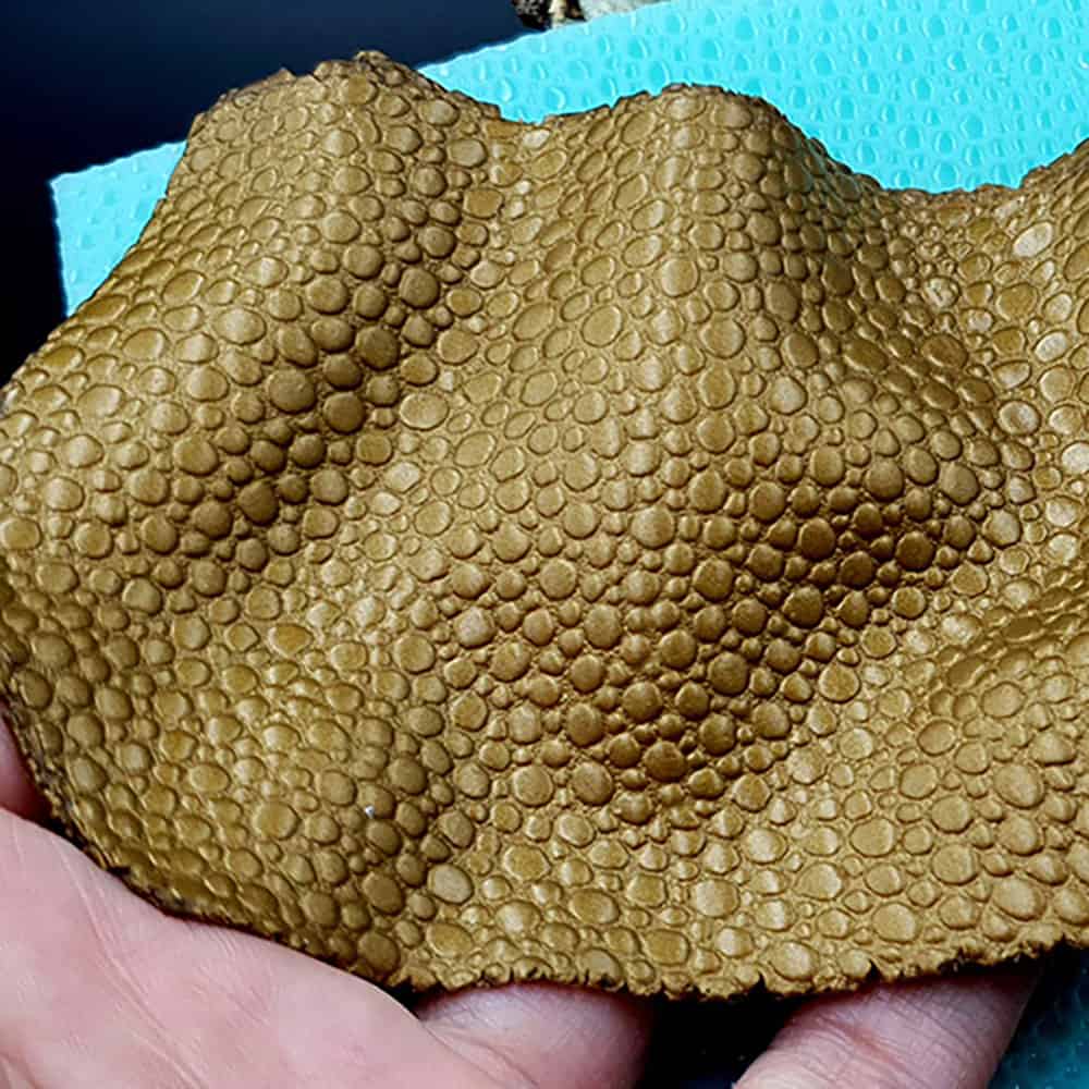 Я зробив цю текстуру з силікону, який є гнучким і не потребує роздільної речовини. Його можна випікати при температурі 150°C і використовувати з усіма марками полімерної глини (бажано рекомендується SOFT).