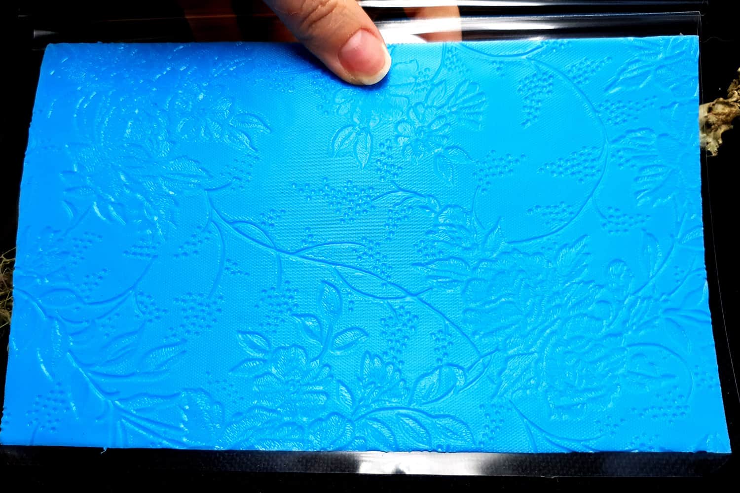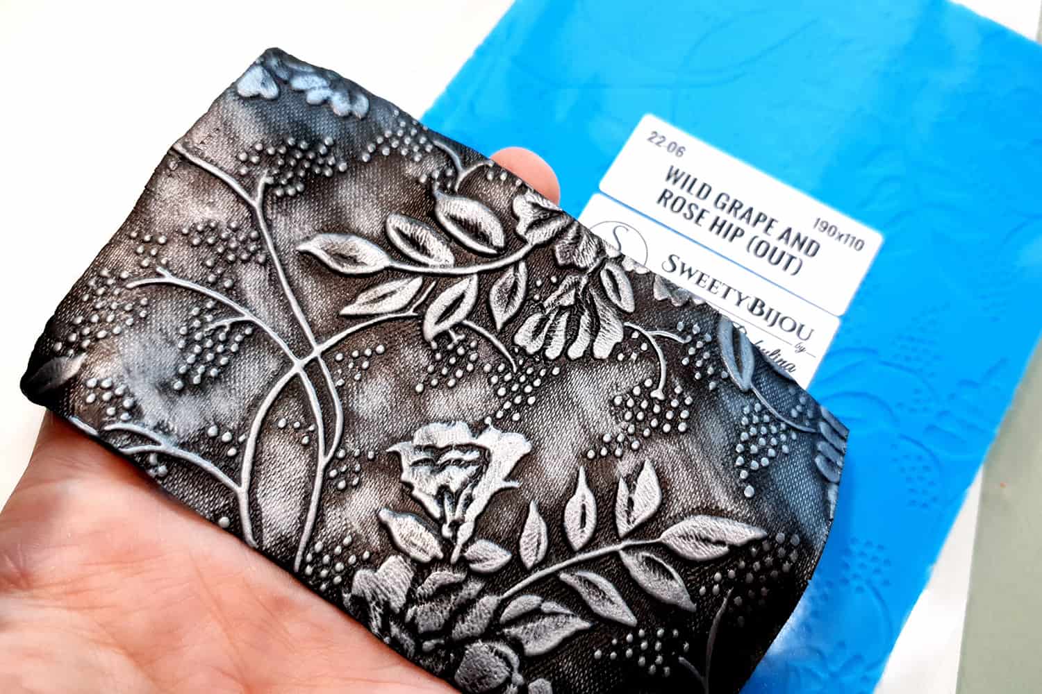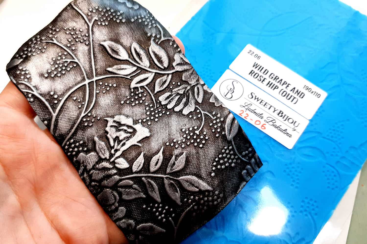 Я зробив цю текстуру з силікону, який є гнучким і не потребує роздільної речовини. Його можна випікати при температурі 150°C і використовувати з усіма марками полімерної глини (бажано рекомендується SOFT).